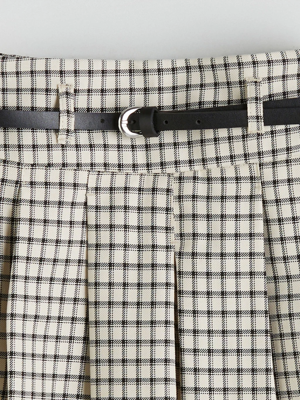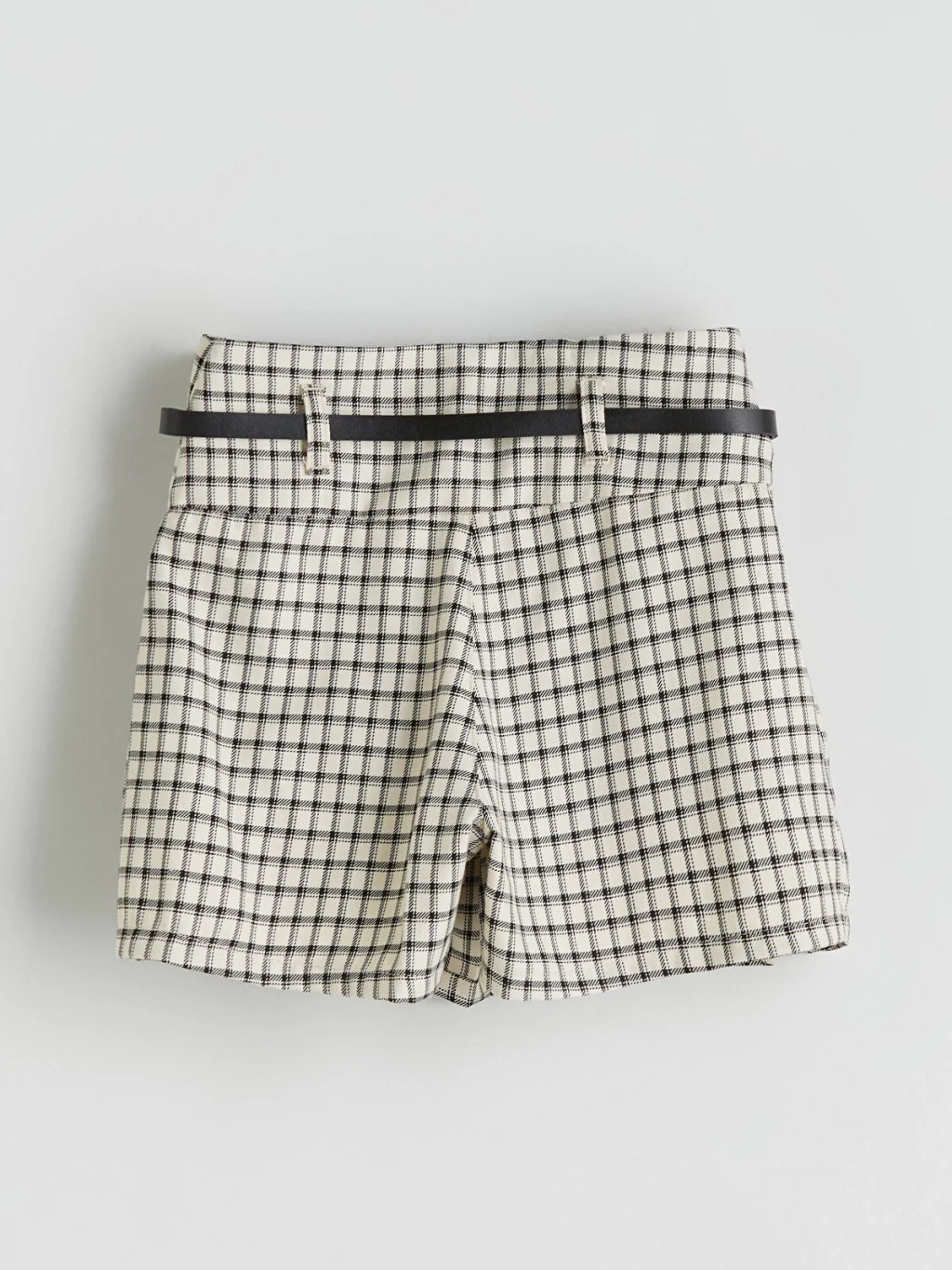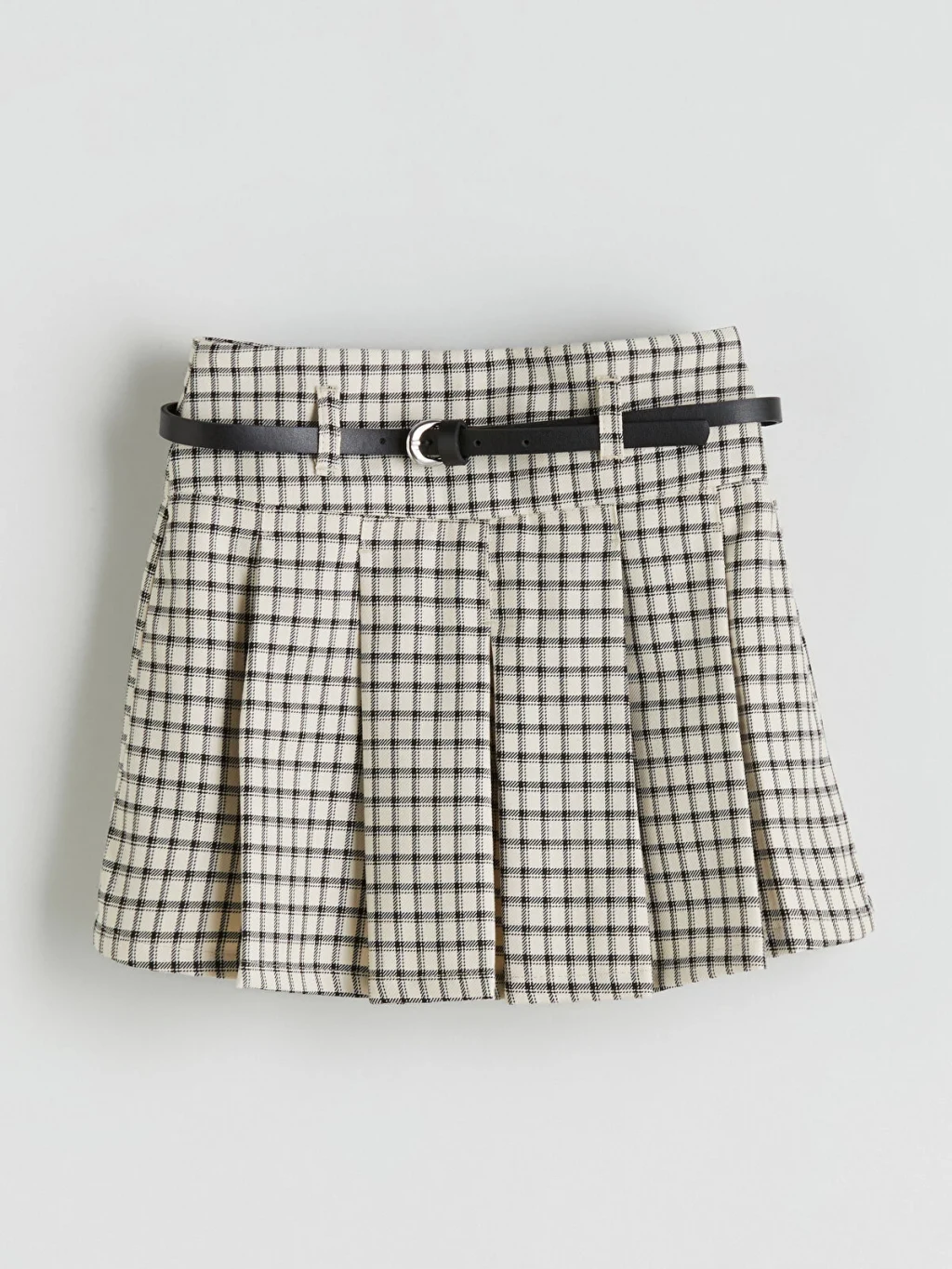 Kız çocuk şort etek, pileli tasarıma ve ekose desene sahiptir. Beli kemerlidir.