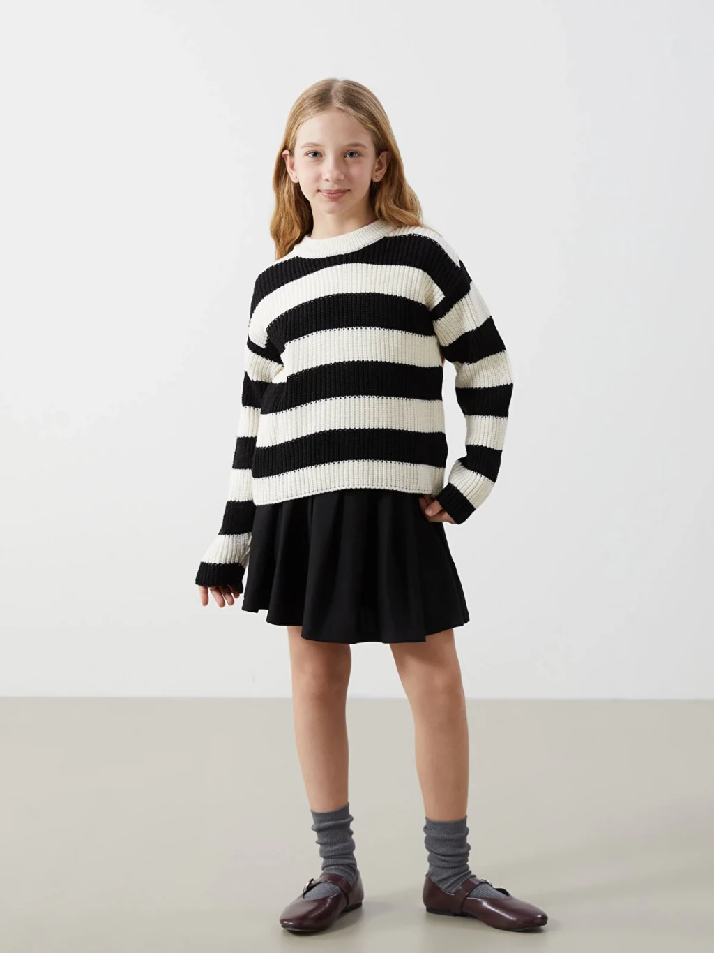 Çizgili tasarımı ve bisiklet yaka yapısı ile kalın triko kazak, hem konforlu hem de şık bir seçenektir. Soğuk hava koşullarında sıcak tutar ve her kıyafetle kolayca kombinlenebilir.