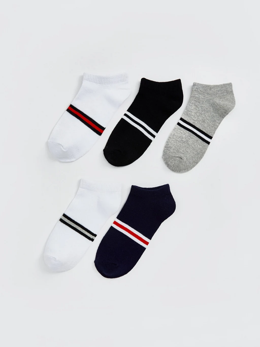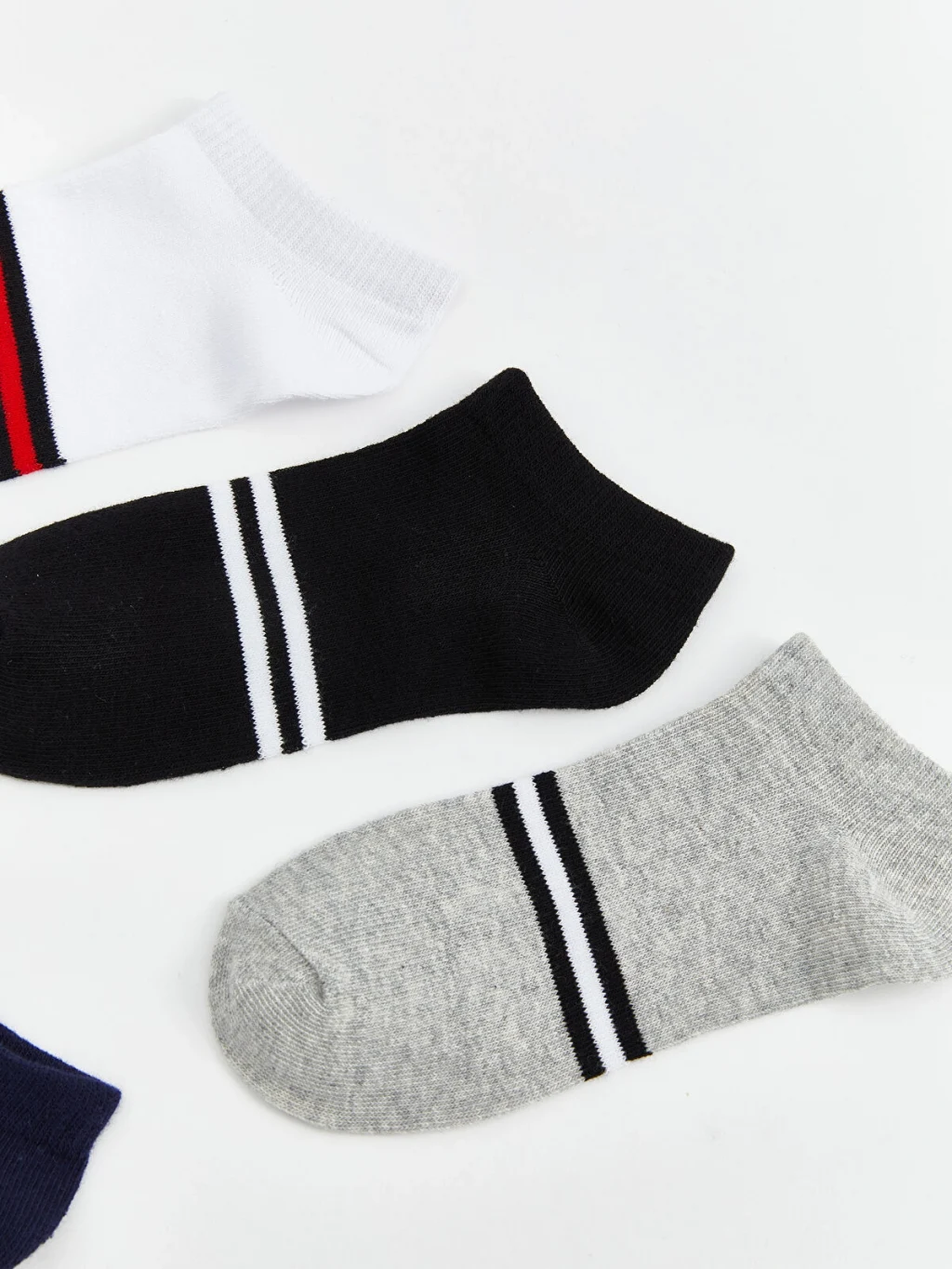 Erkek çocuk patik çorap, 5'li paket halinde sunulur. Her bir çorap, ayak üstünde yer alan çizgili desene sahiptir.
