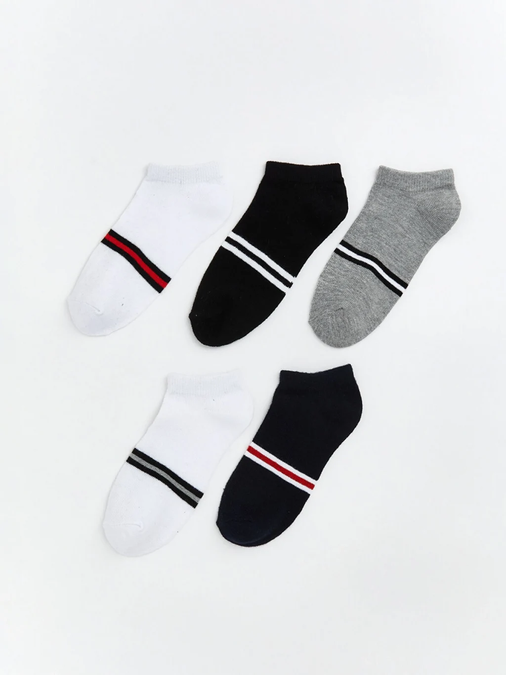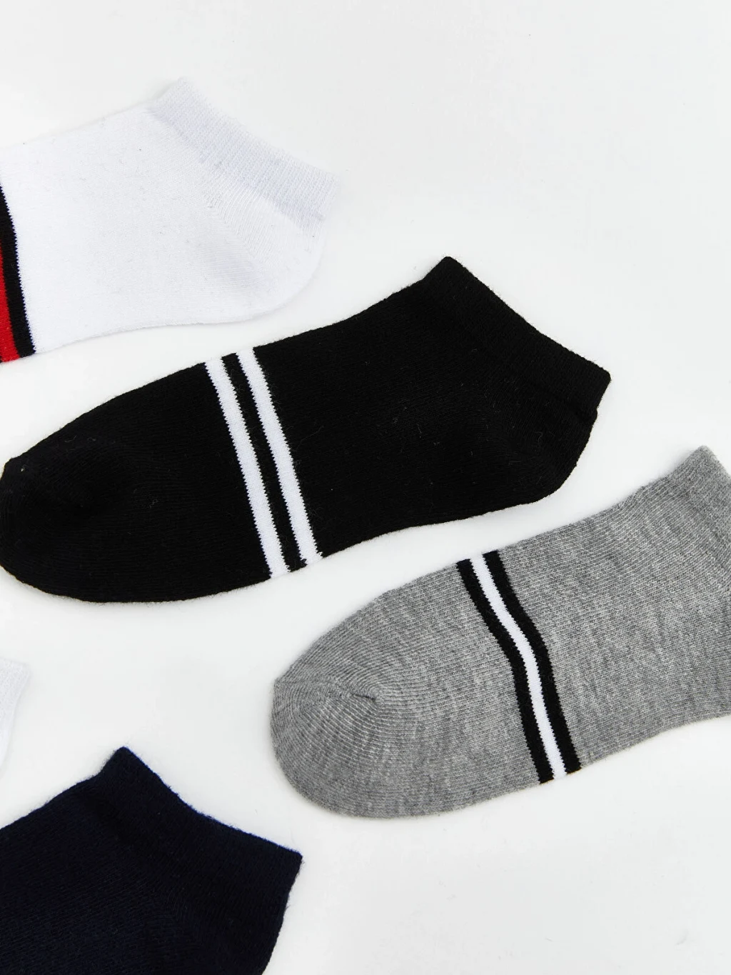 Çoklu paket olarak sunulan erkek çocuk patik çorap, üst kısmında farklı kalınlıklarda çizgili desene sahiptir.