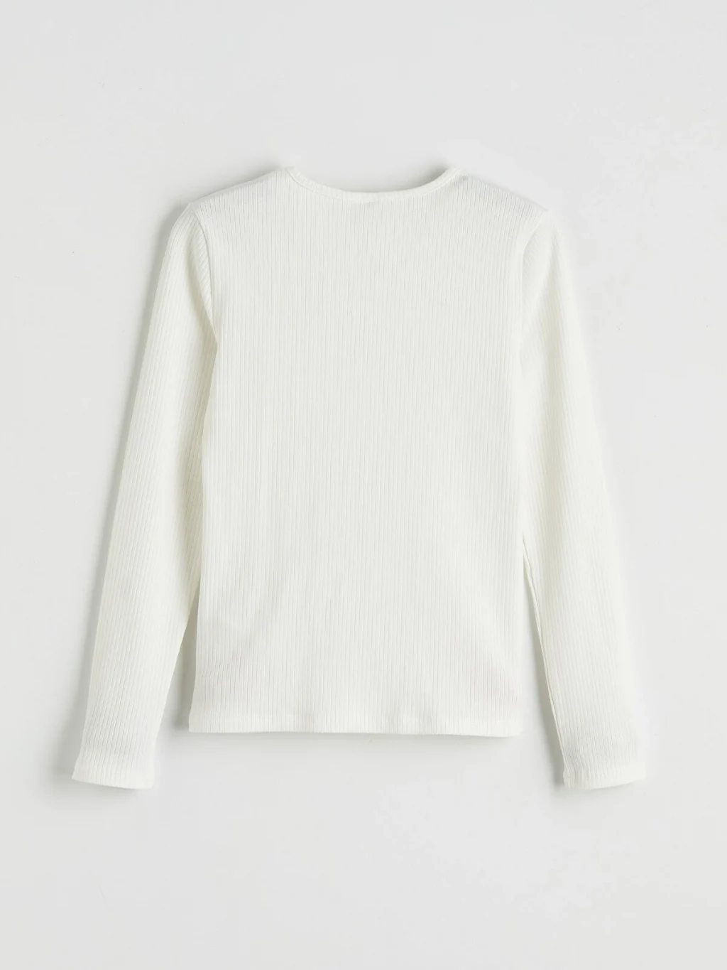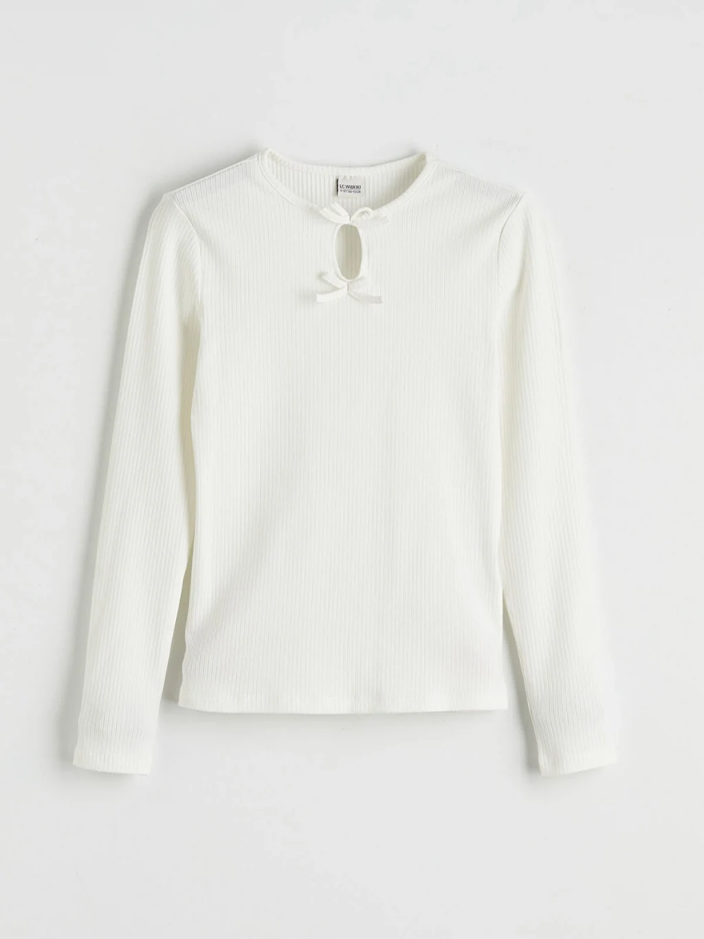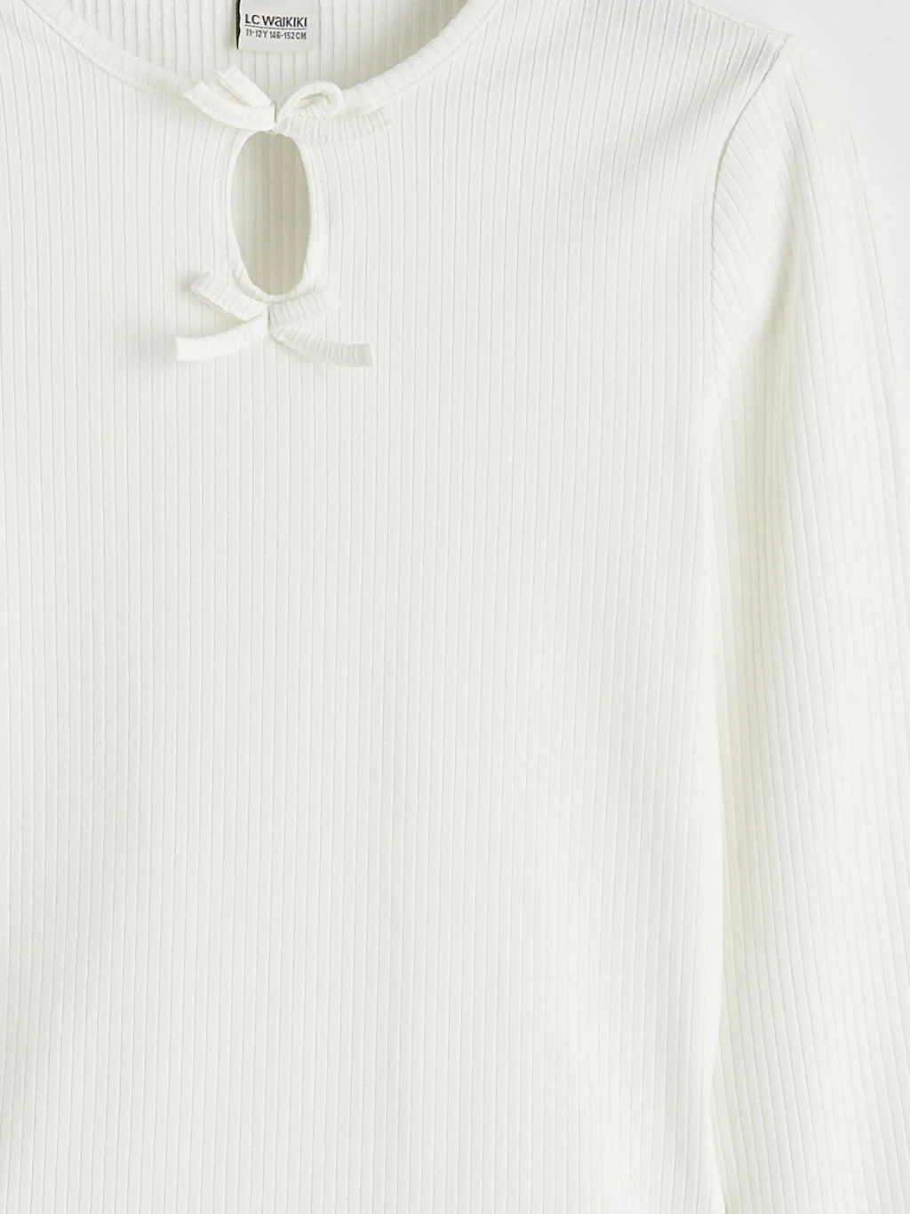 Bisiklet yakalı ve uzun kollu kız çocuk tişört, kaşkorse kumaştan üretilmiştir. Yaka altında fiyonk detayı bulunur.