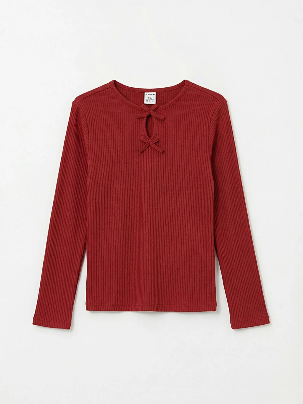 Bisiklet yakalı ve uzun kollu kız çocuk tişört, kaşkorse kumaştan üretilmiştir. Yaka altında fiyonk detayı bulunur.