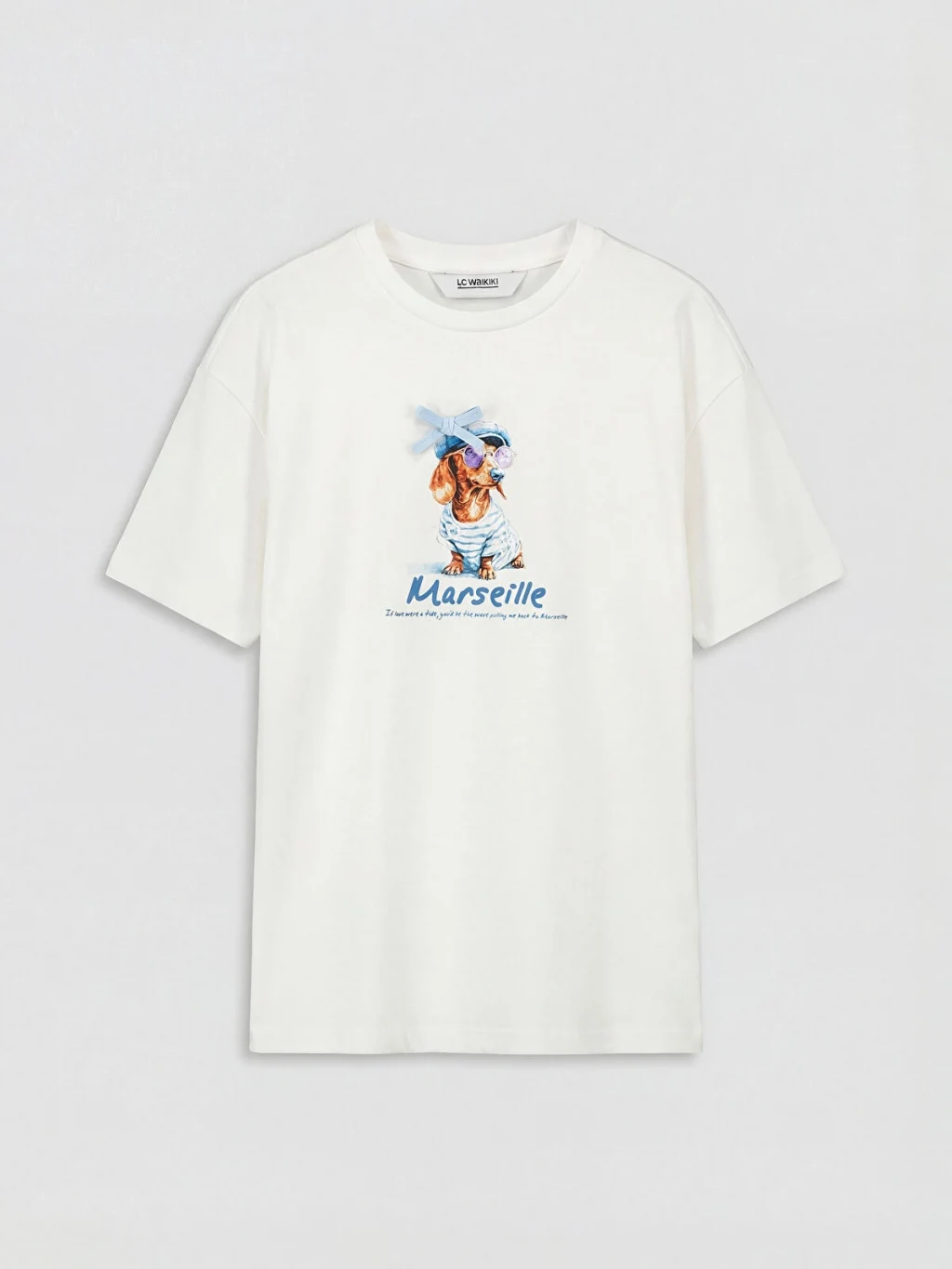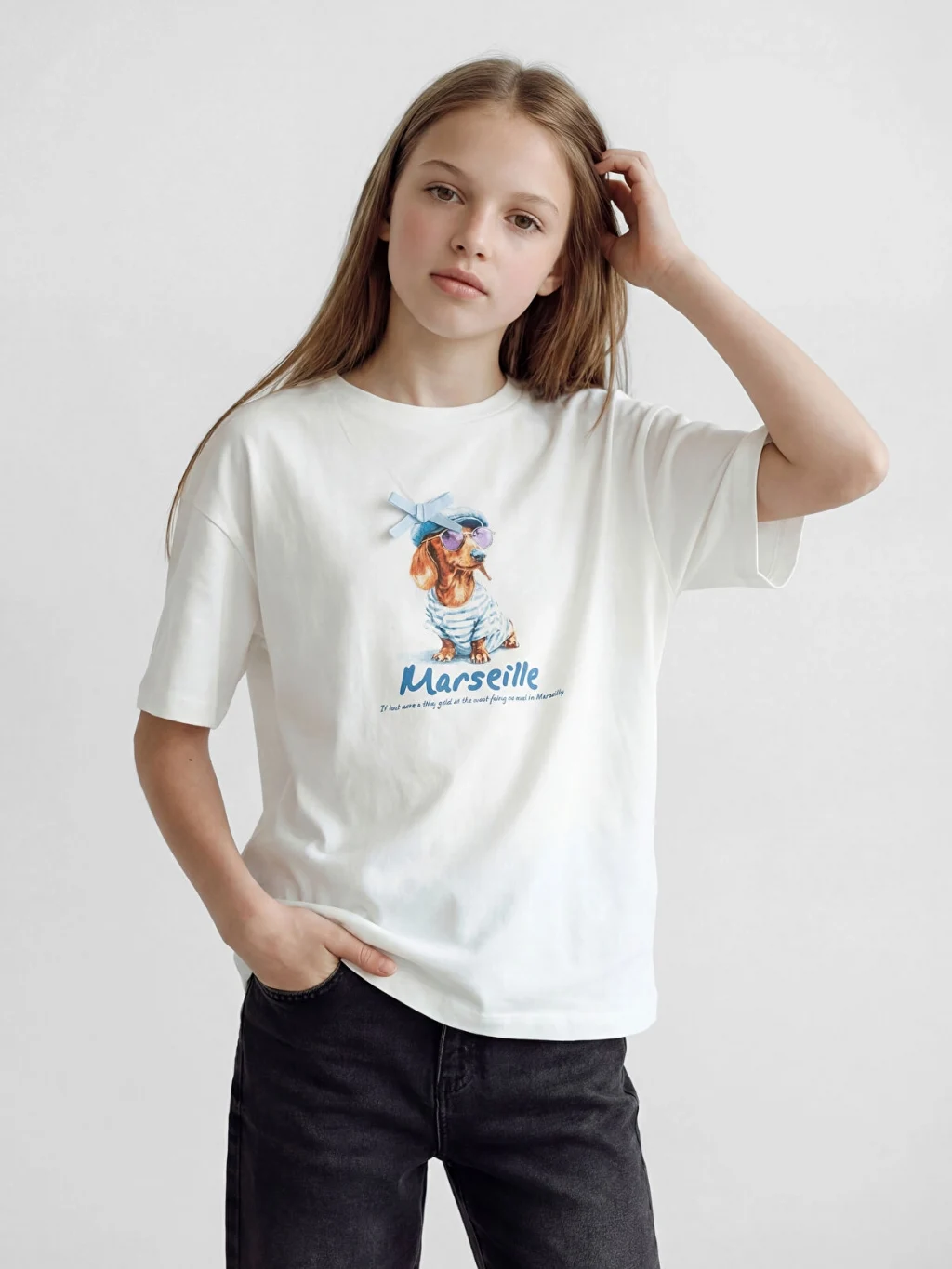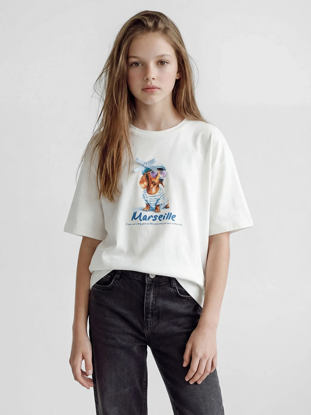 Kız çocuk tişört, bisiklet yaka ve kısa kolludur. %100 pamuk içerikli penye kumaştan üretilmiştir ve ön yüzünde baskı detayı bulunur.