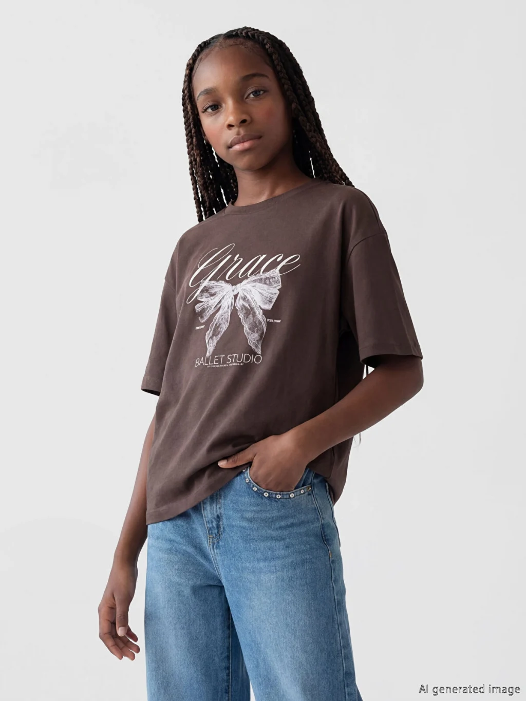 Kız çocuk tişört, bisiklet yaka ve kısa kolludur. %100 pamuk içerikli penye kumaştan üretilmiştir ve ön yüzünde baskı detayı bulunur.