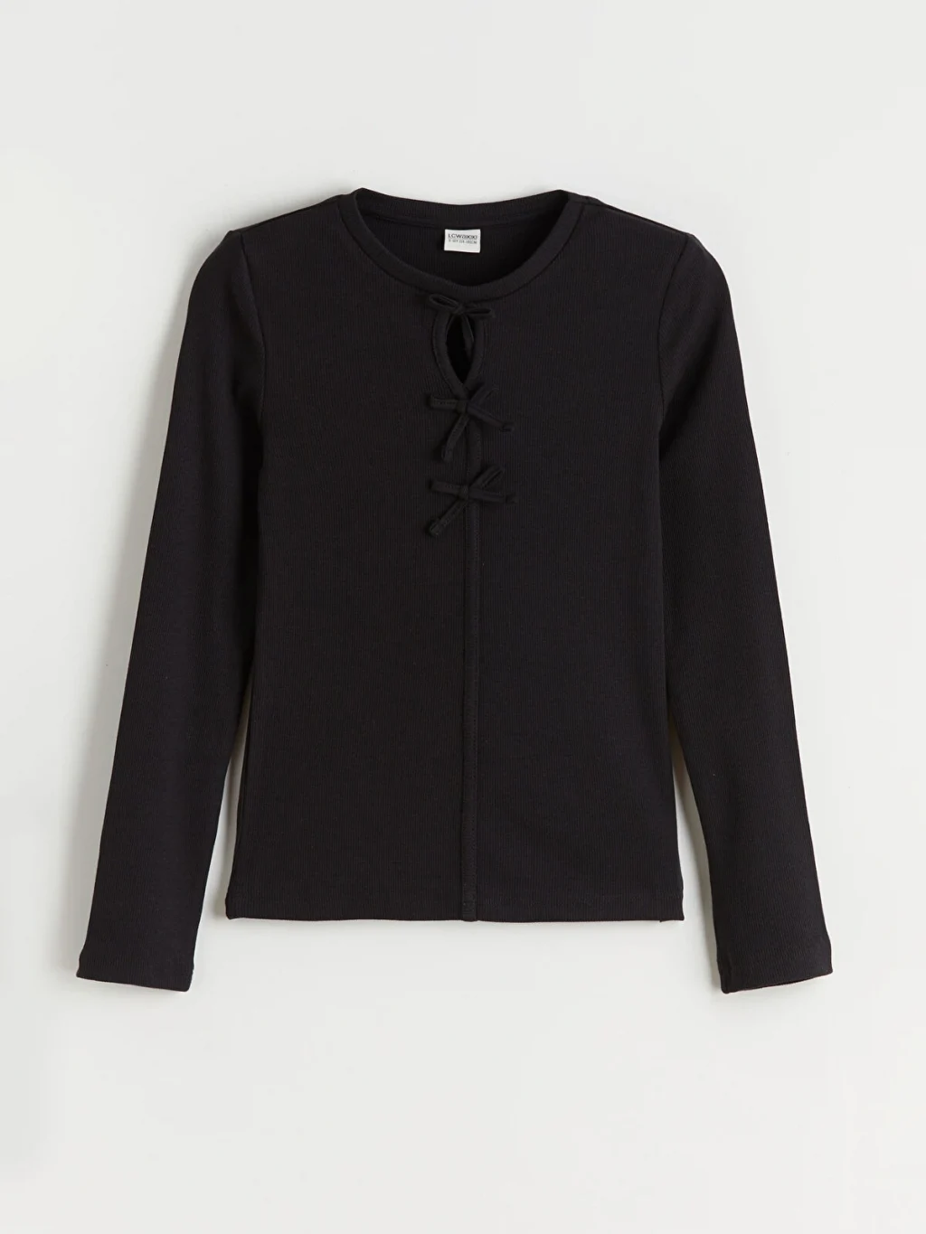 Dar kalıp kız çocuk tişört, yüksek pamuk içerikli kaşkorse kumaştan üretilmiştir. Bisiklet yakalı ve uzun kollu olup, yaka altında fiyonk detayları bulunur.