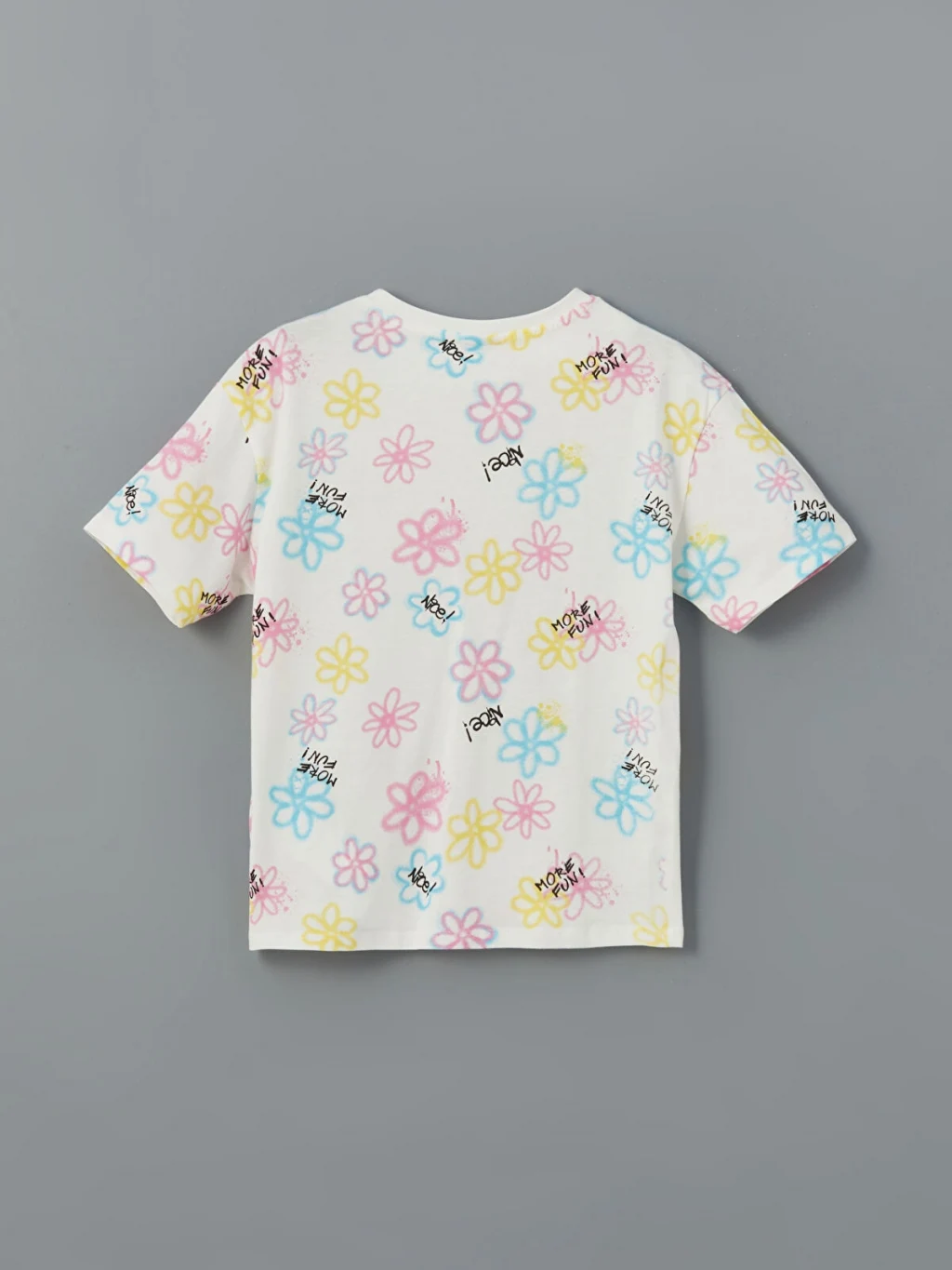Çiçek ve yazı desenli, bisiklet yaka, kısa kollu kız çocuk tişört, %100 pamuklu penye kumaştan üretilmiştir ve bol kalıplıdır.