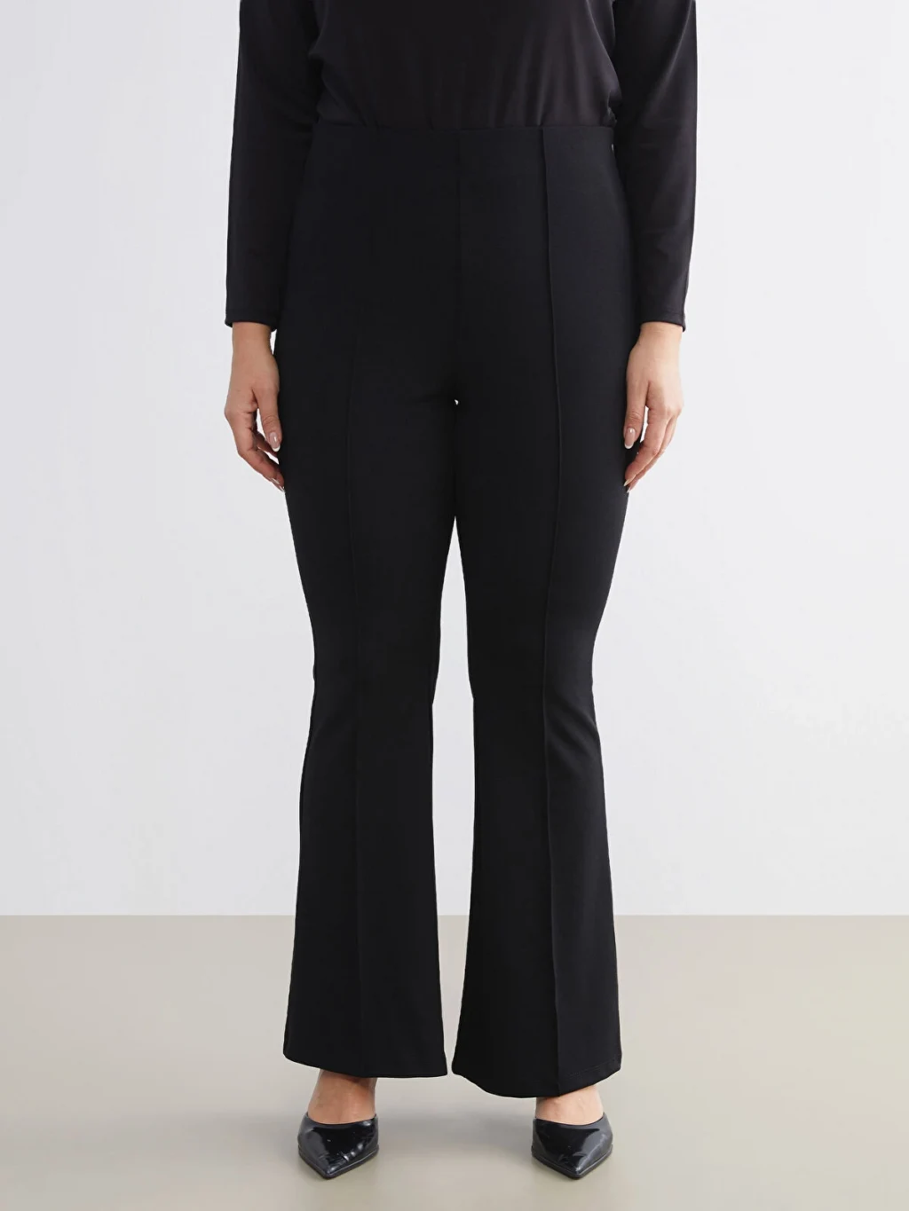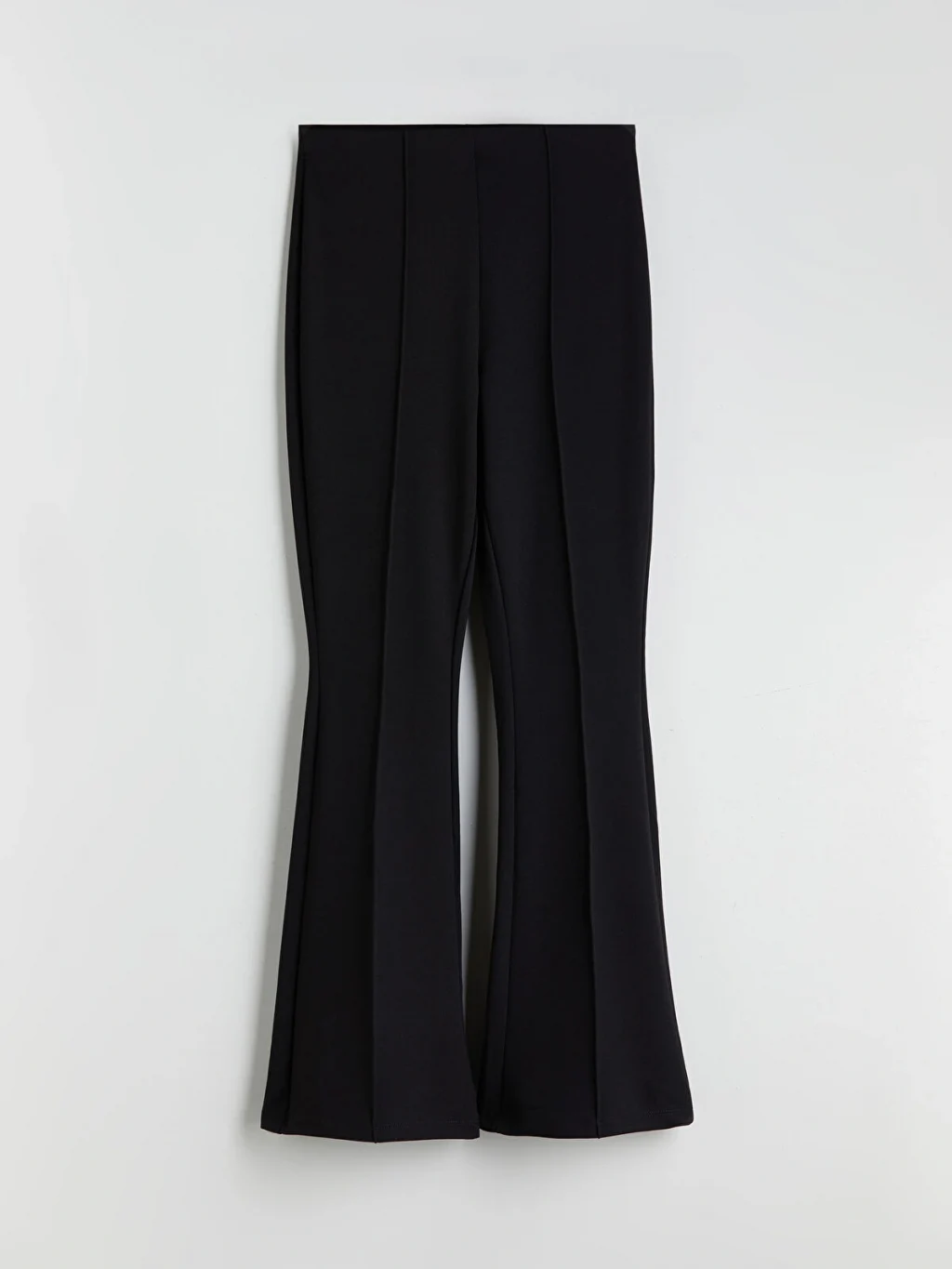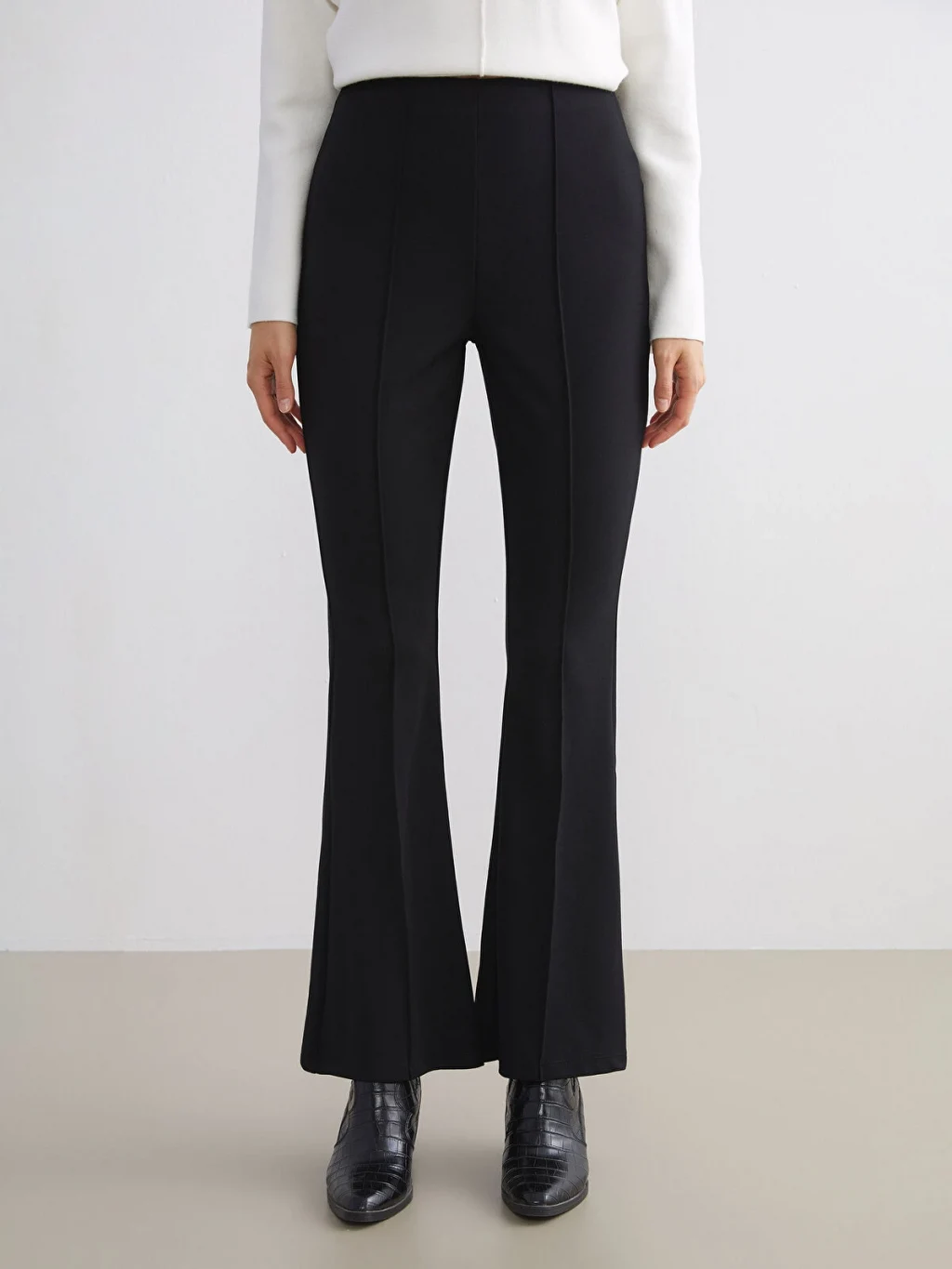 Yüksek belli, dar kalıplı kadın pantolon, paçaya doğru genişleyen bir kesime ve önü dikiş detayına sahiptir.