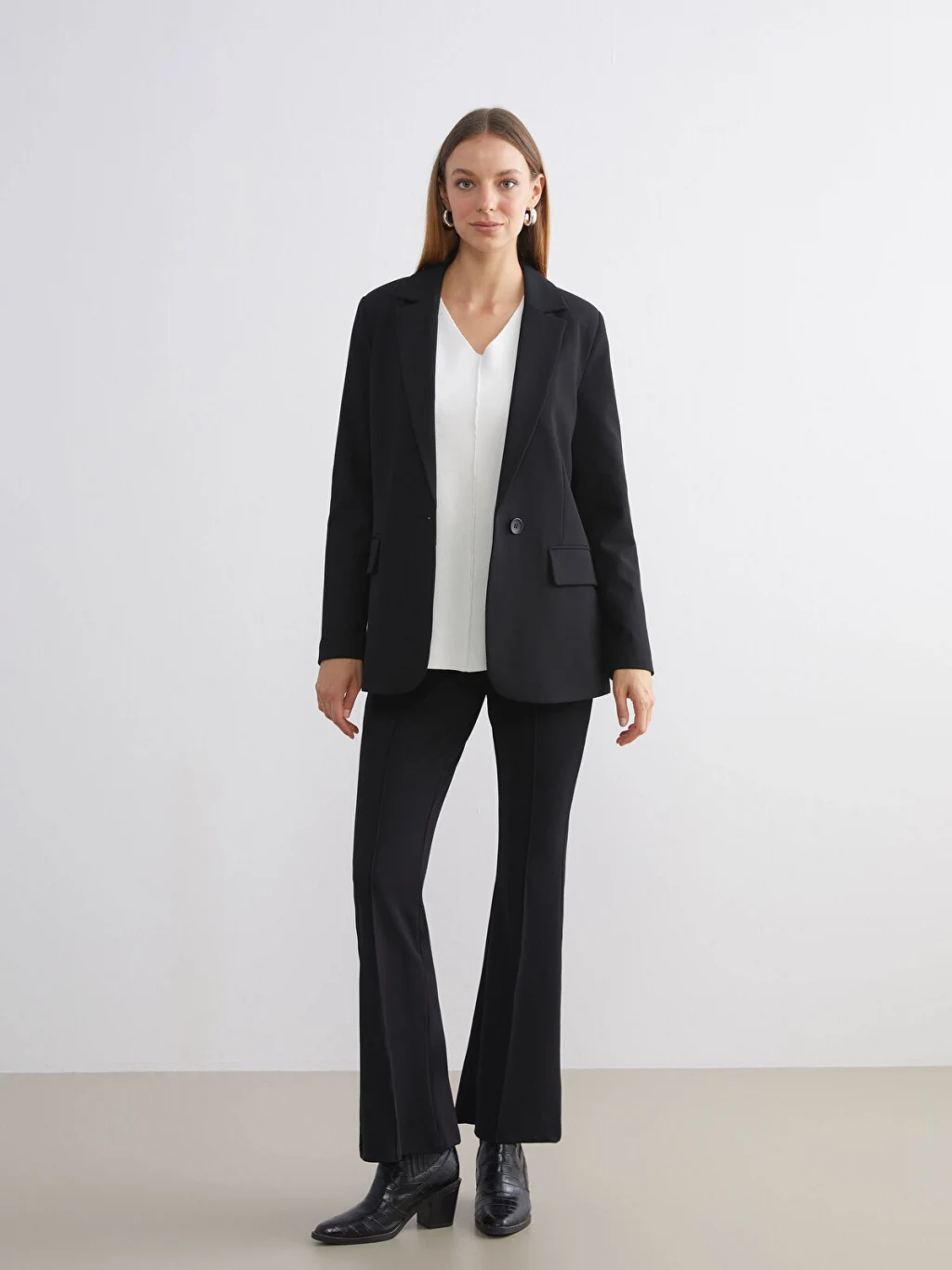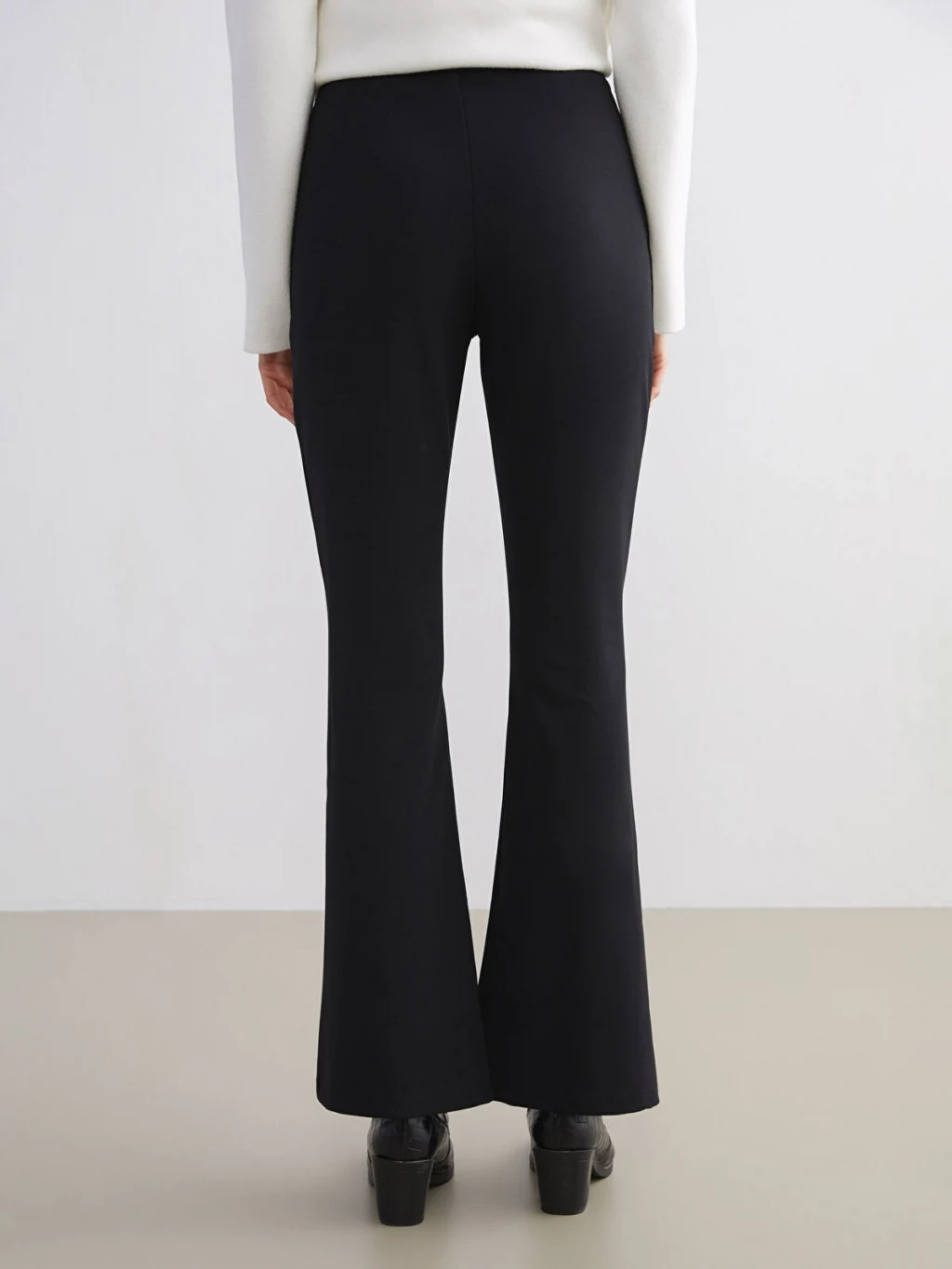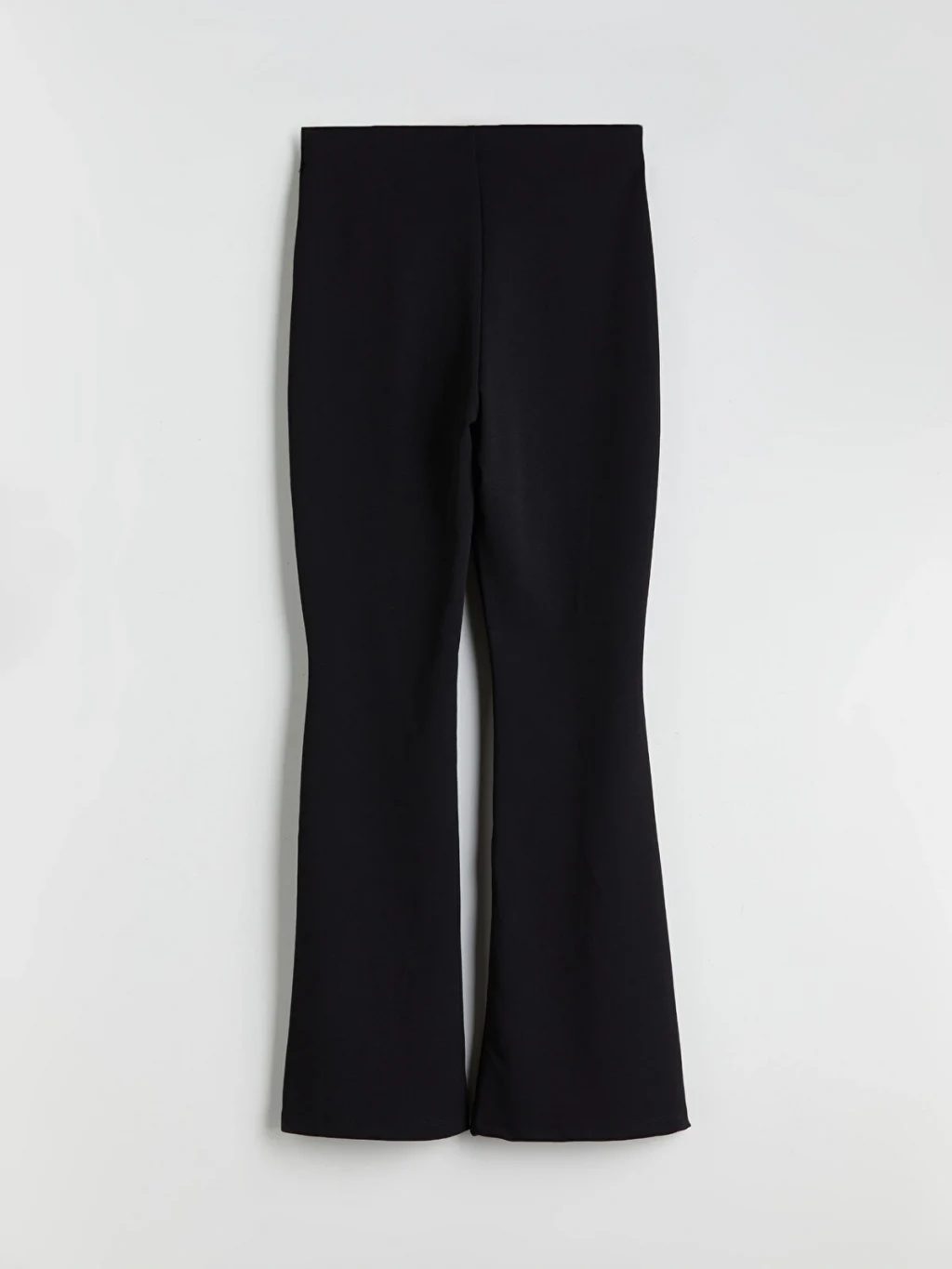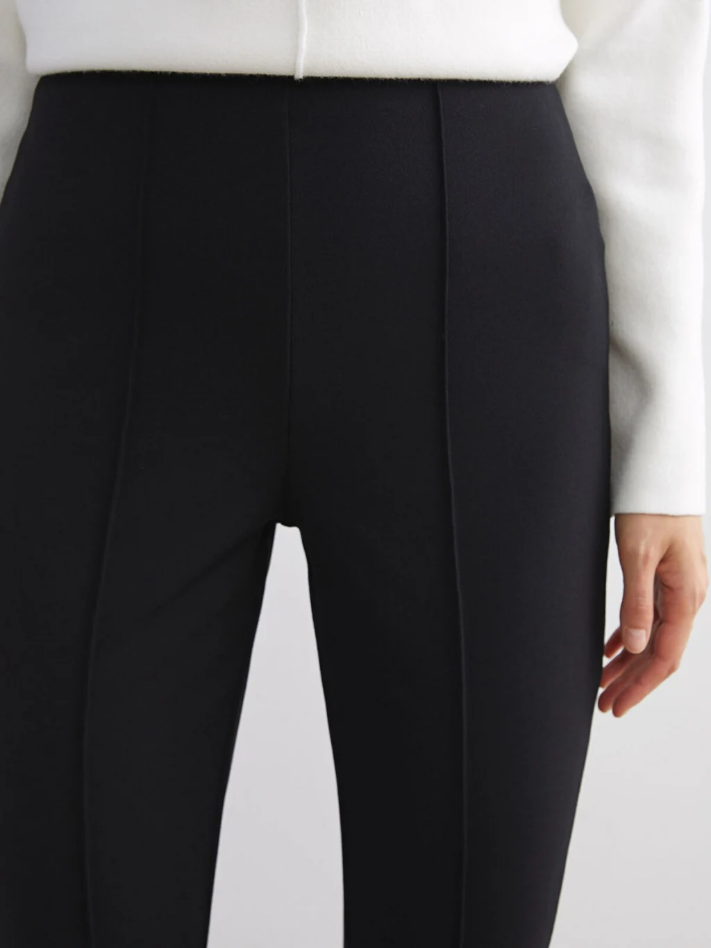 Yüksek belli, dar kalıplı kadın pantolon, paçaya doğru genişleyen bir kesime ve önü dikiş detayına sahiptir.