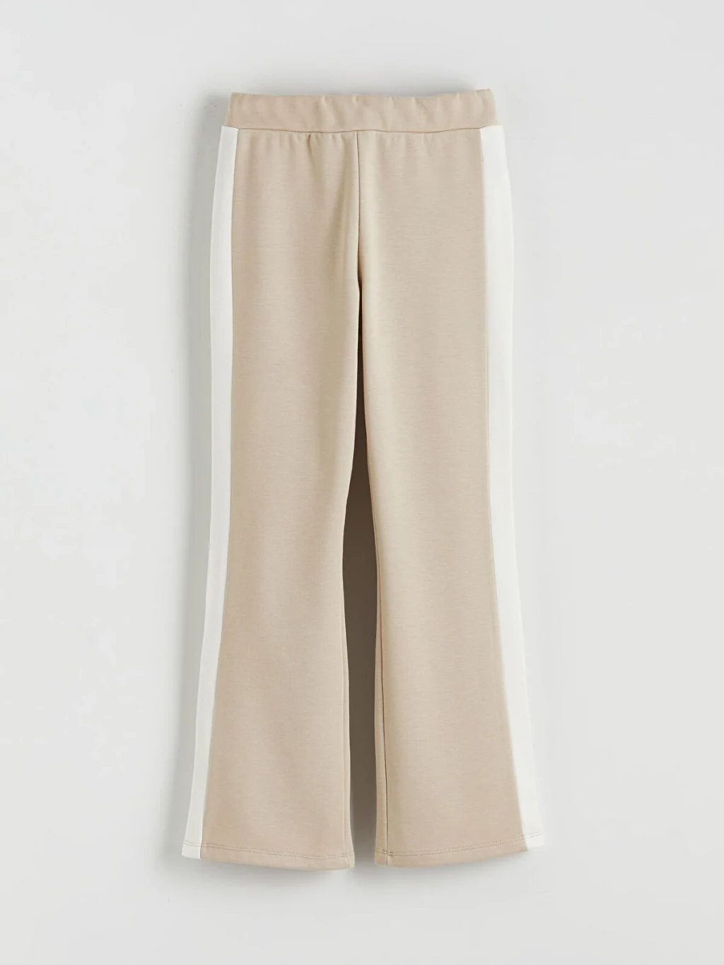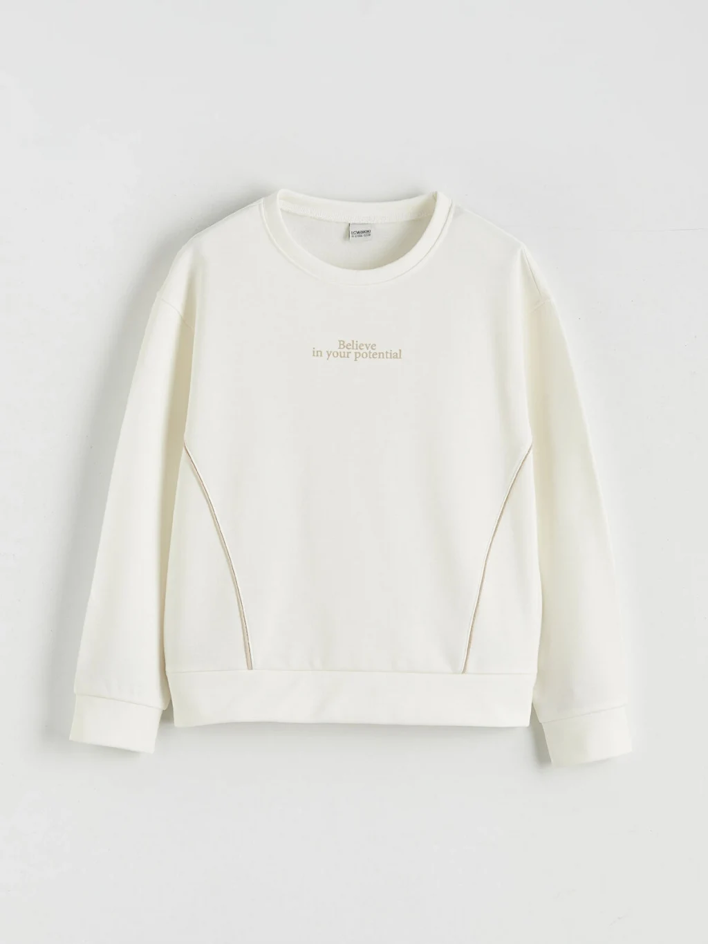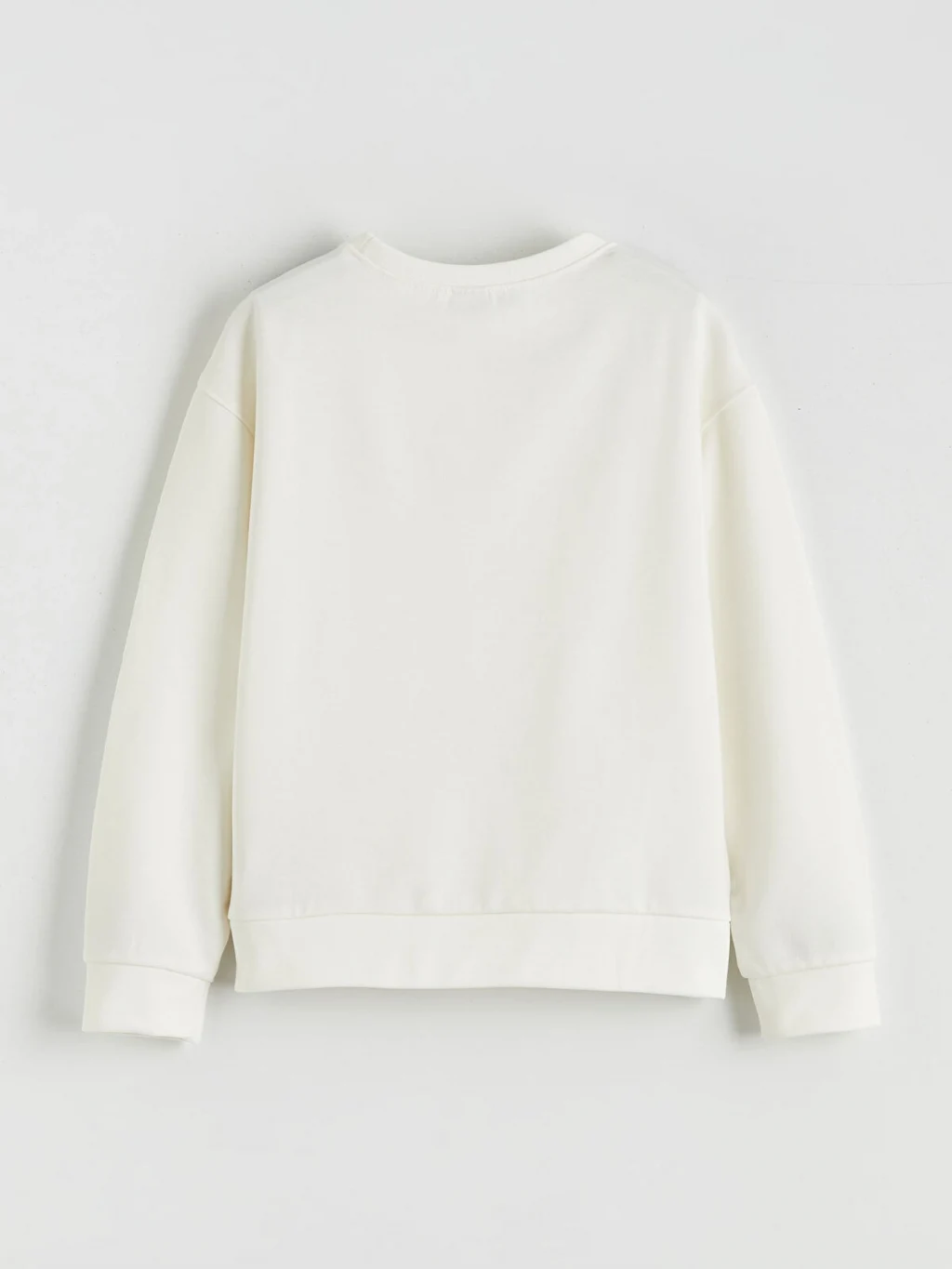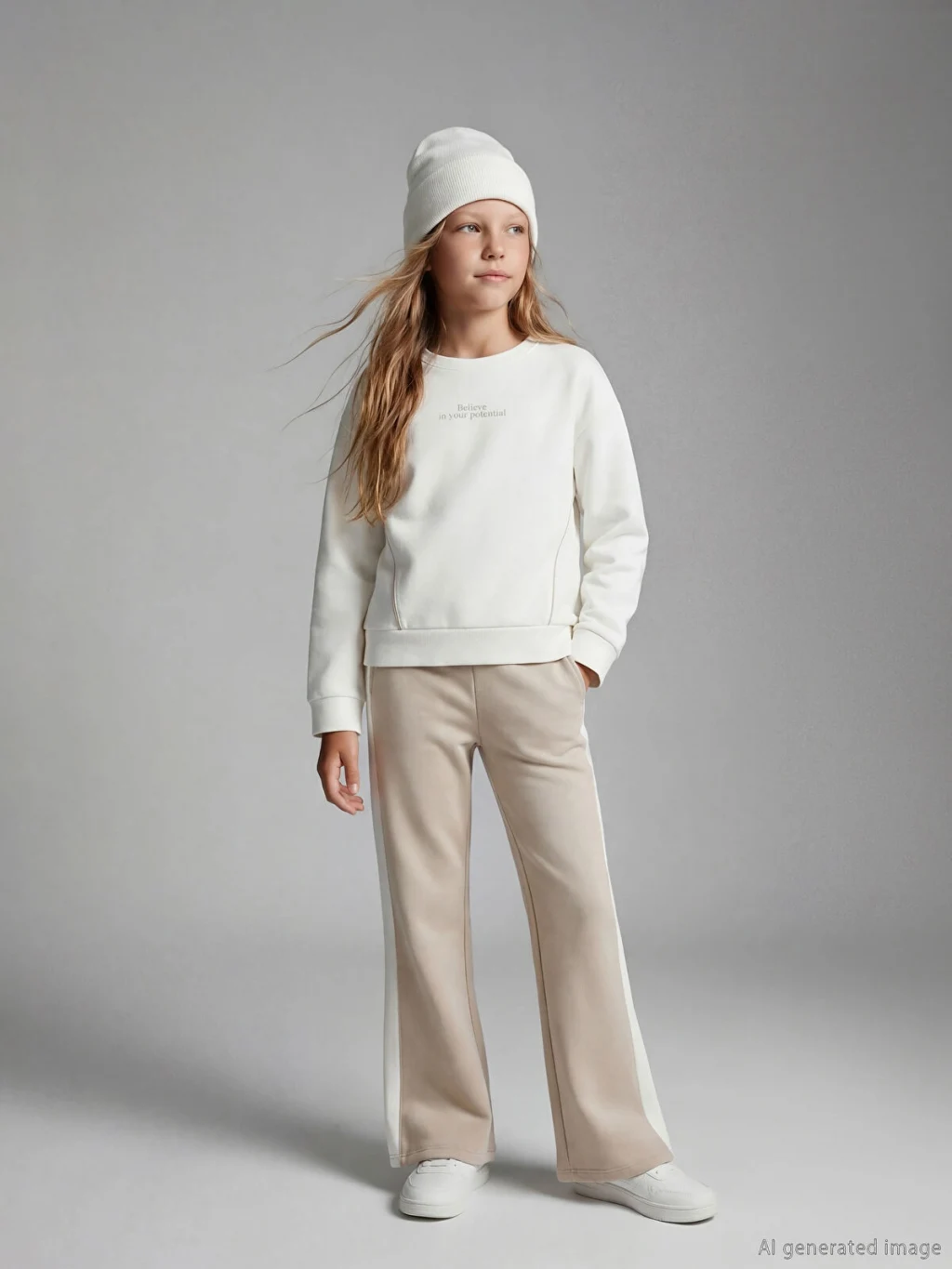 Kız çocuk takım; bisiklet yaka, uzun kollu, önü baskılı sweatshirt ve yanları şeritli, ispanyol paça eşofman alttan oluşur. İnterlok kumaştır.