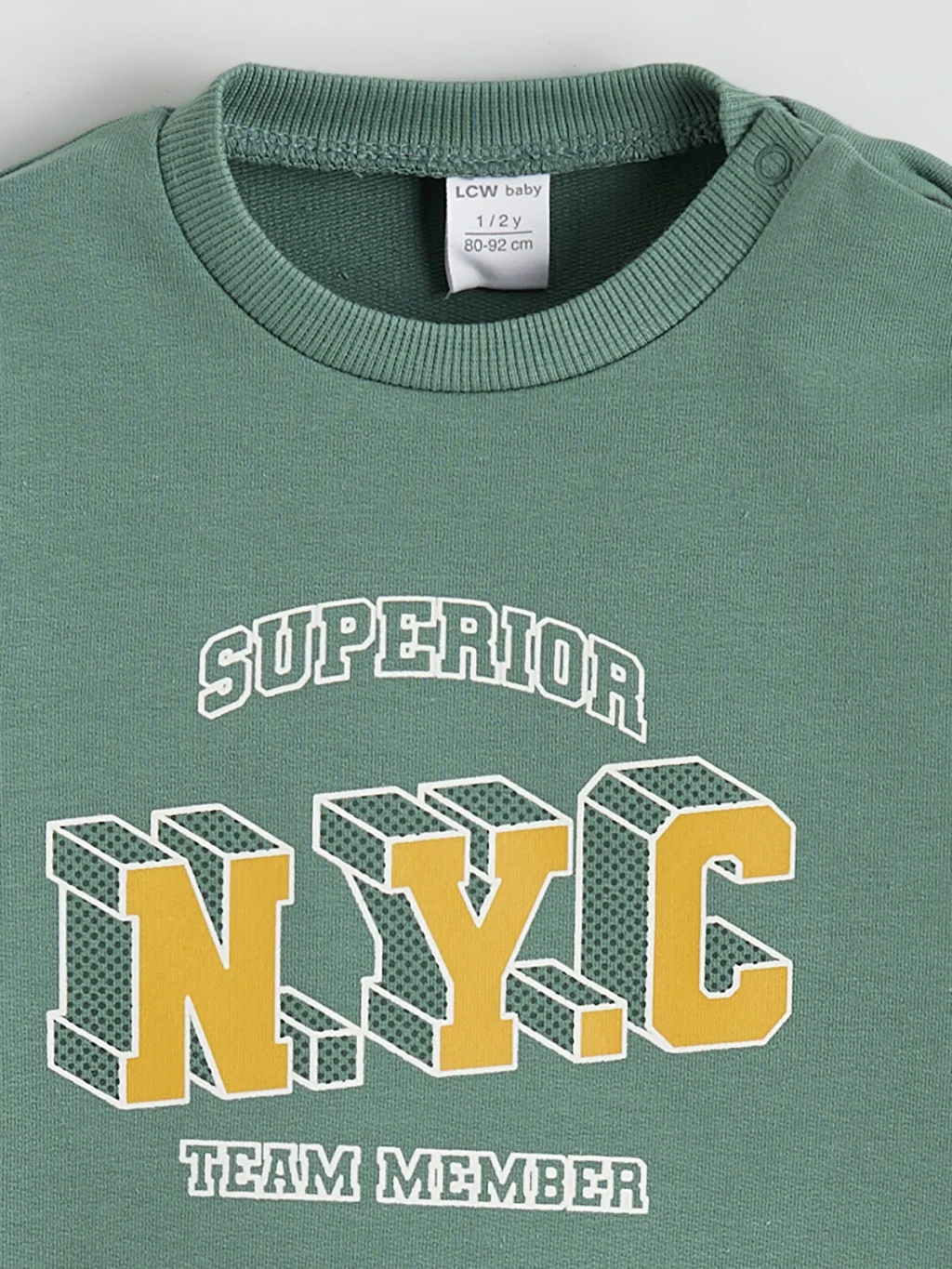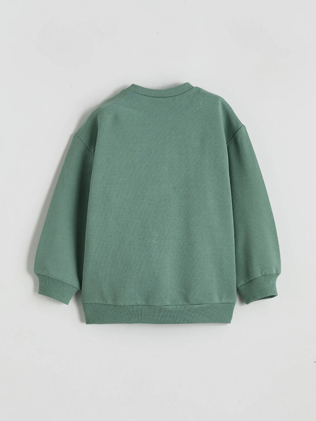 Bisiklet yakalı, uzun kollu erkek bebek sweatshirt, omuzdan çıtçıt kapamalıdır. Önü baskılı modelin kol uçları ve etek ucu ribanalıdır.