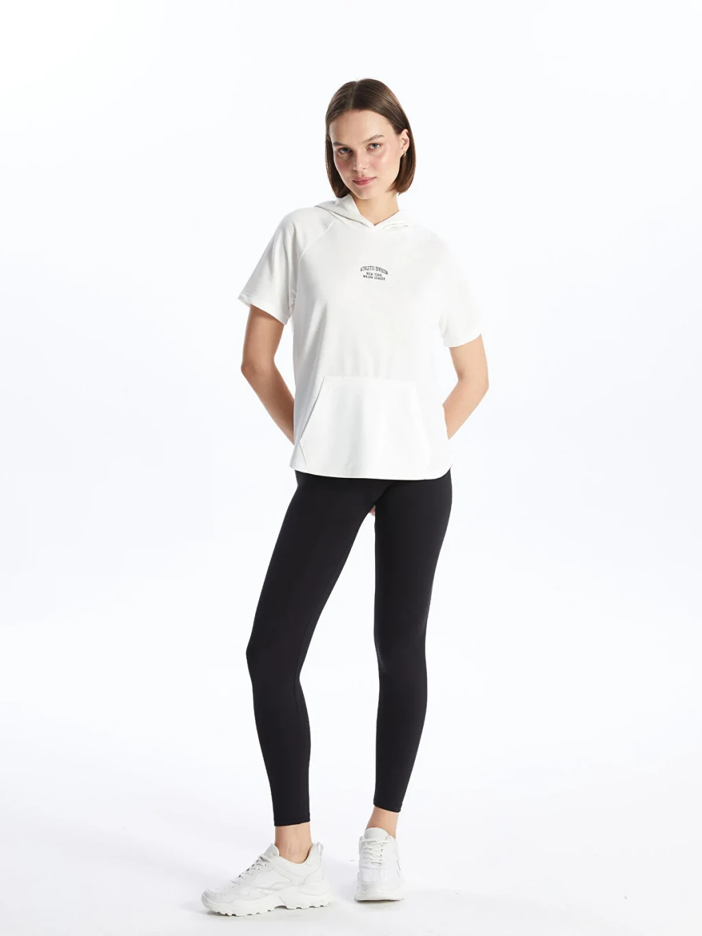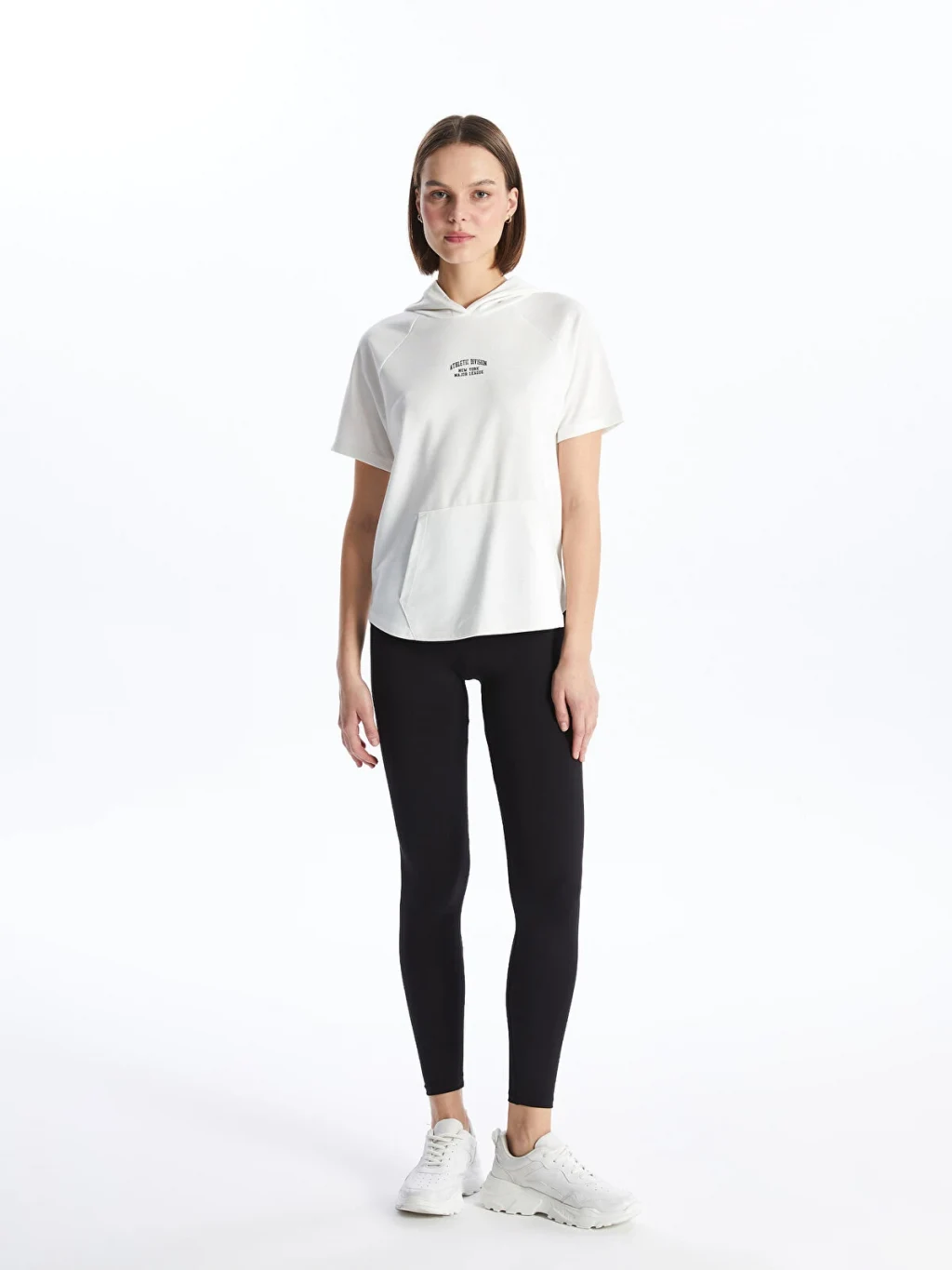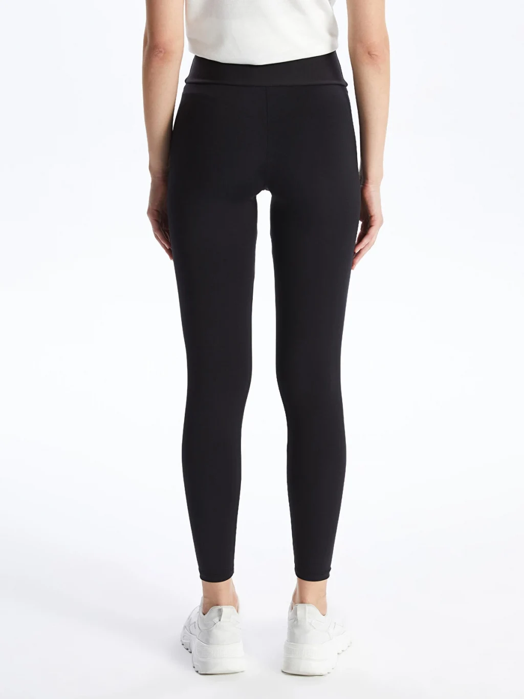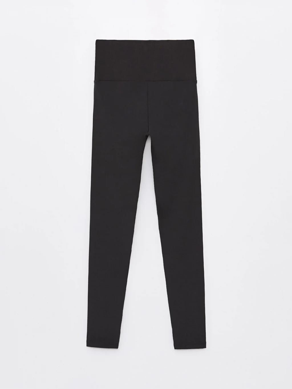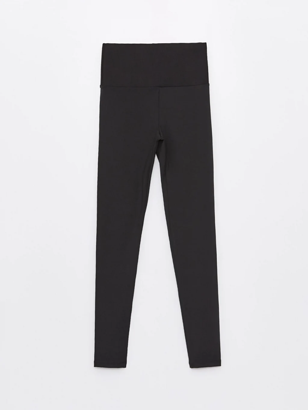 Düz kumaşa sahip, yüksek ve geniş belli kadın spor tayt, bilek boyu ve dar paçalıdır.