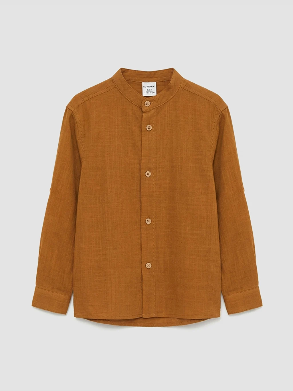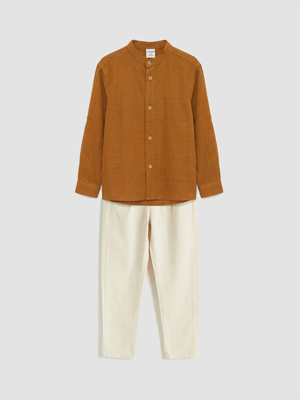 Erkek çocuk takım, hakim yaka, uzun kollu ve önden düğme kapamalı gömlek ile pantolondan oluşur. %100 Pamuk armürlü kumaştan üretilmiştir.