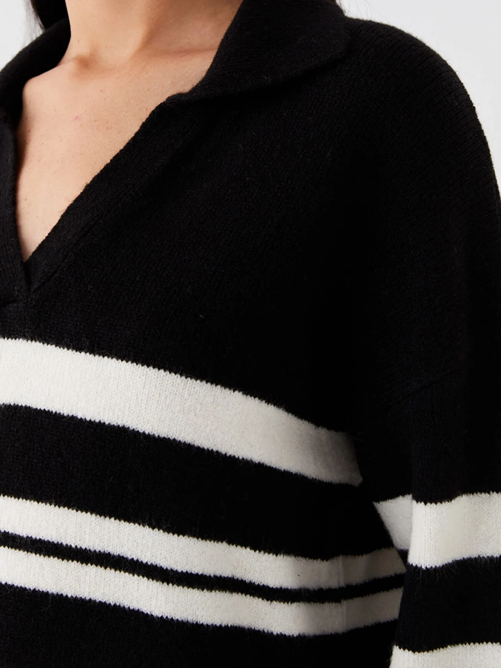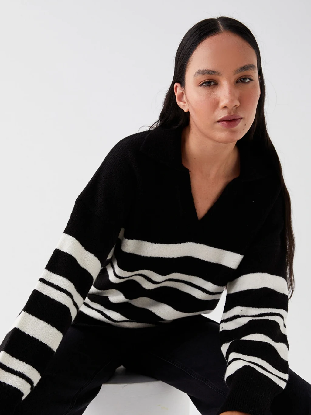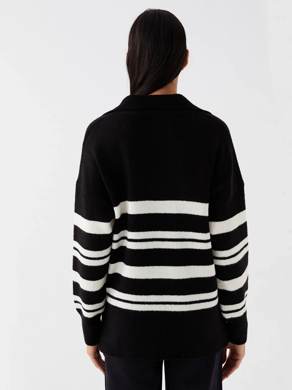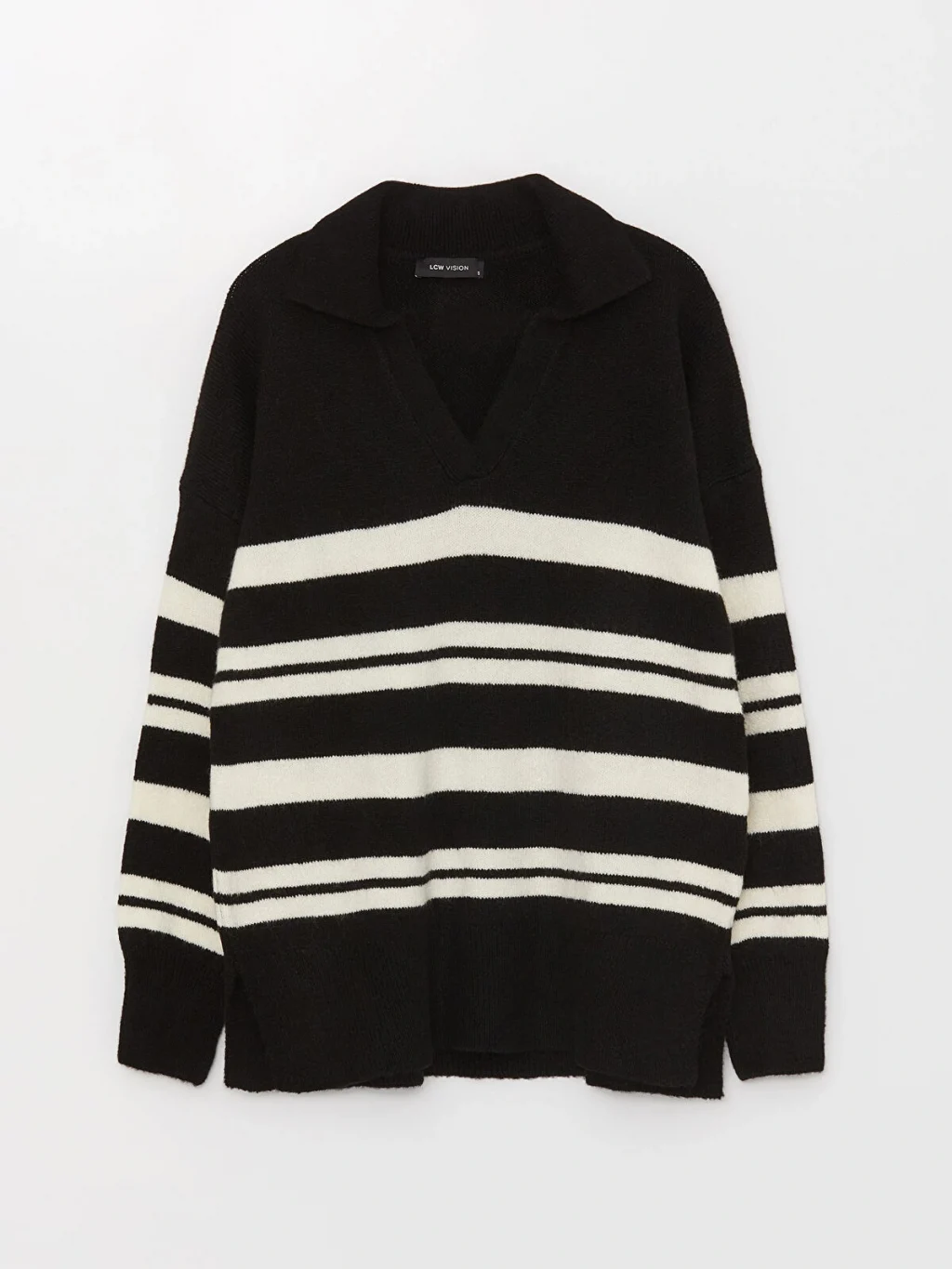LCW Vision Beyaz Polo Yaka Çizgili Oversize Kadın Triko Kazak