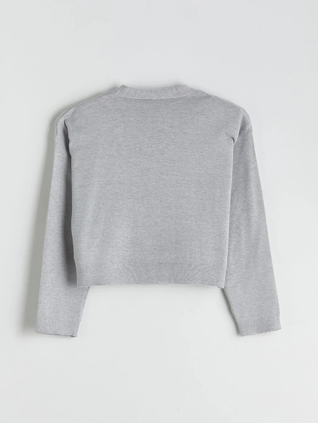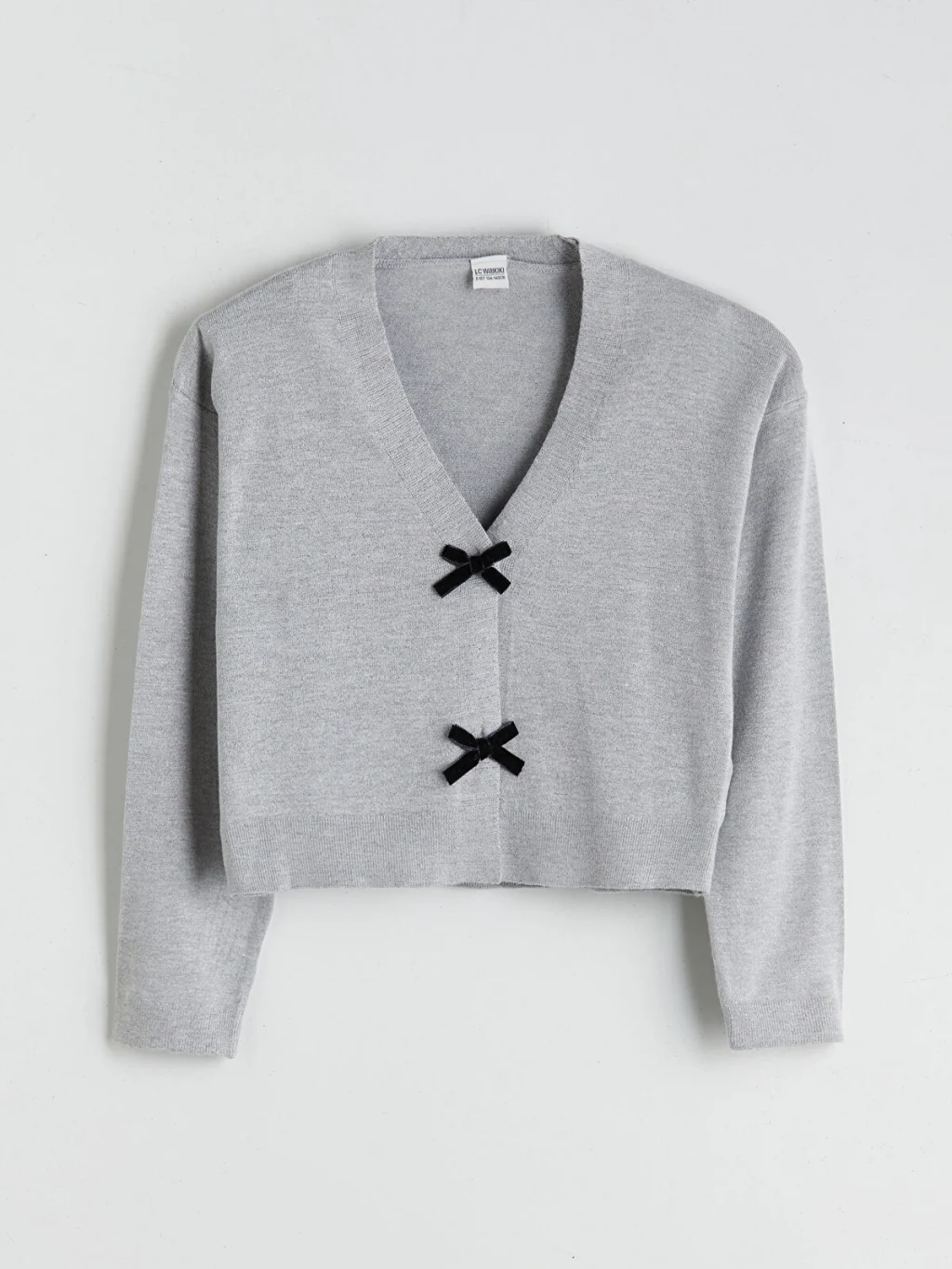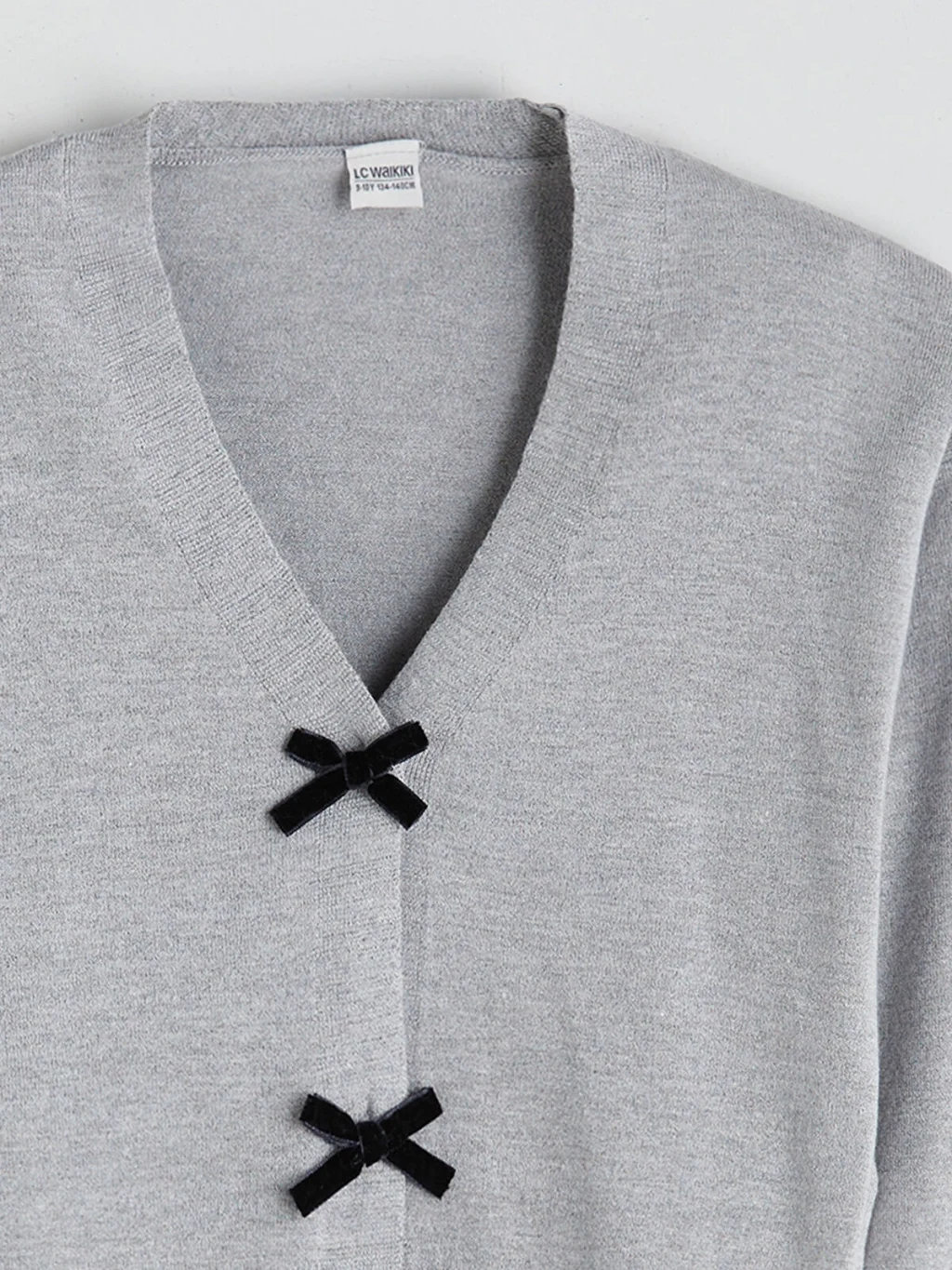 Kalın kumaştan üretilen V yakalı ve uzun kollu kız çocuk hırka, ön kısmında yer alan fiyonk detaylarına sahiptir.