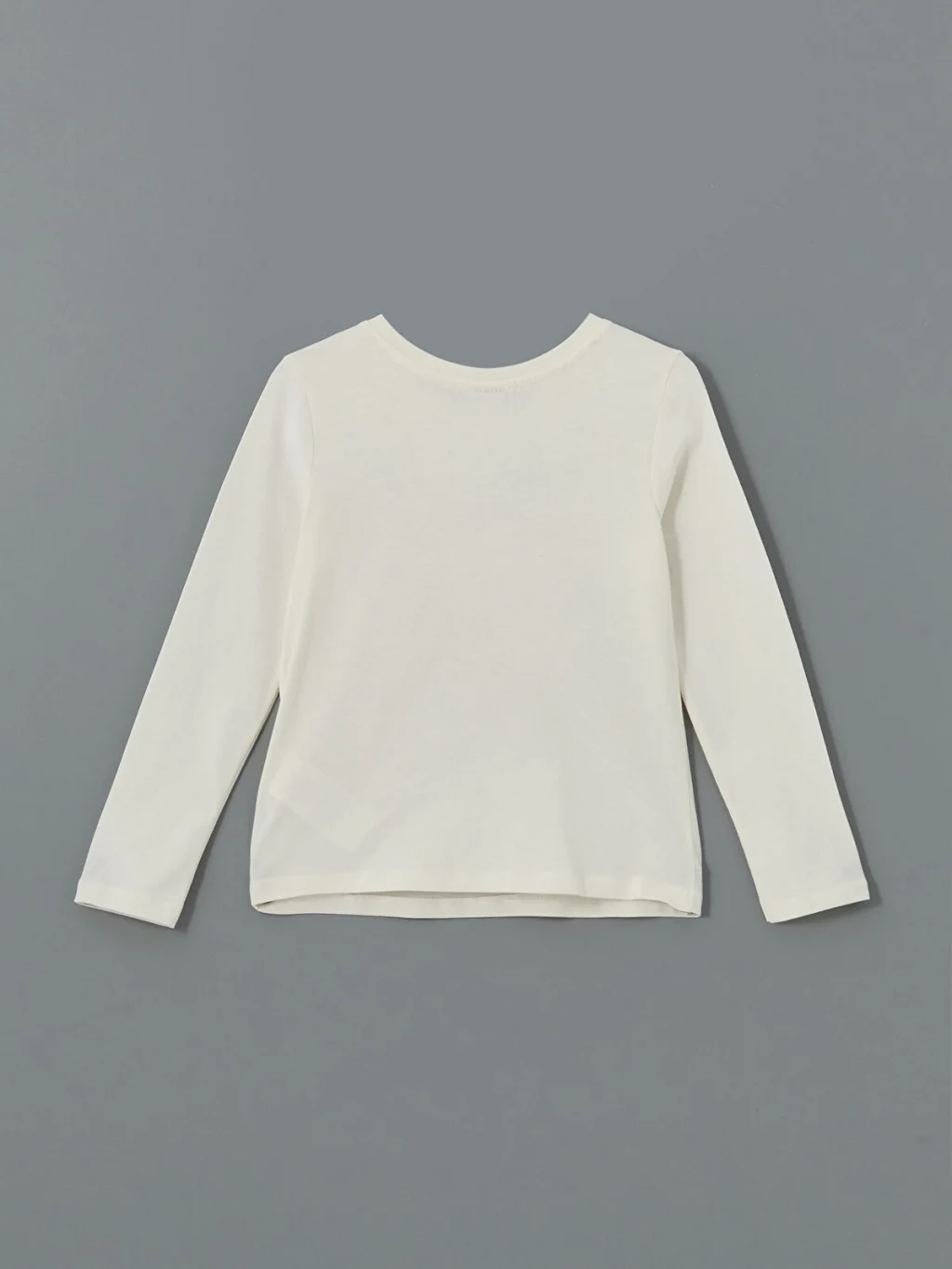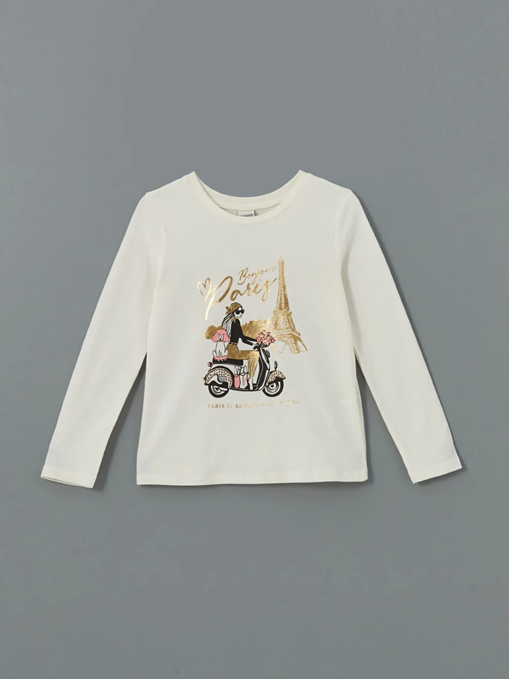 Bisiklet yakalı ve uzun kollu kız çocuk tişört, %100 pamuklu penye kumaştan üretilmiştir. Bol kalıplı modelin ön yüzü baskılıdır.