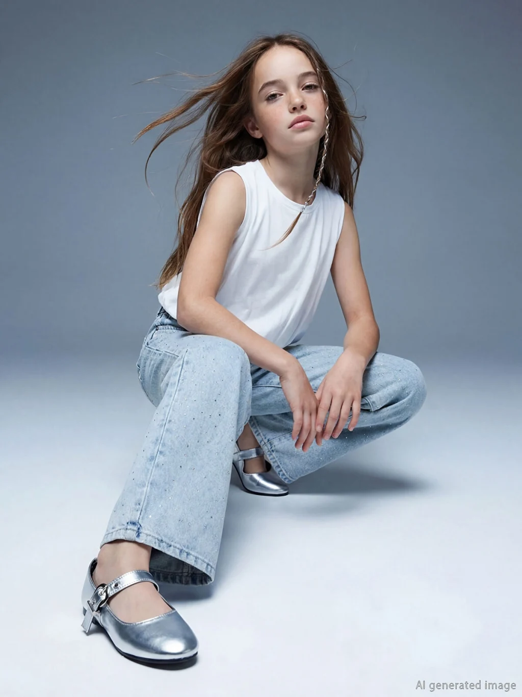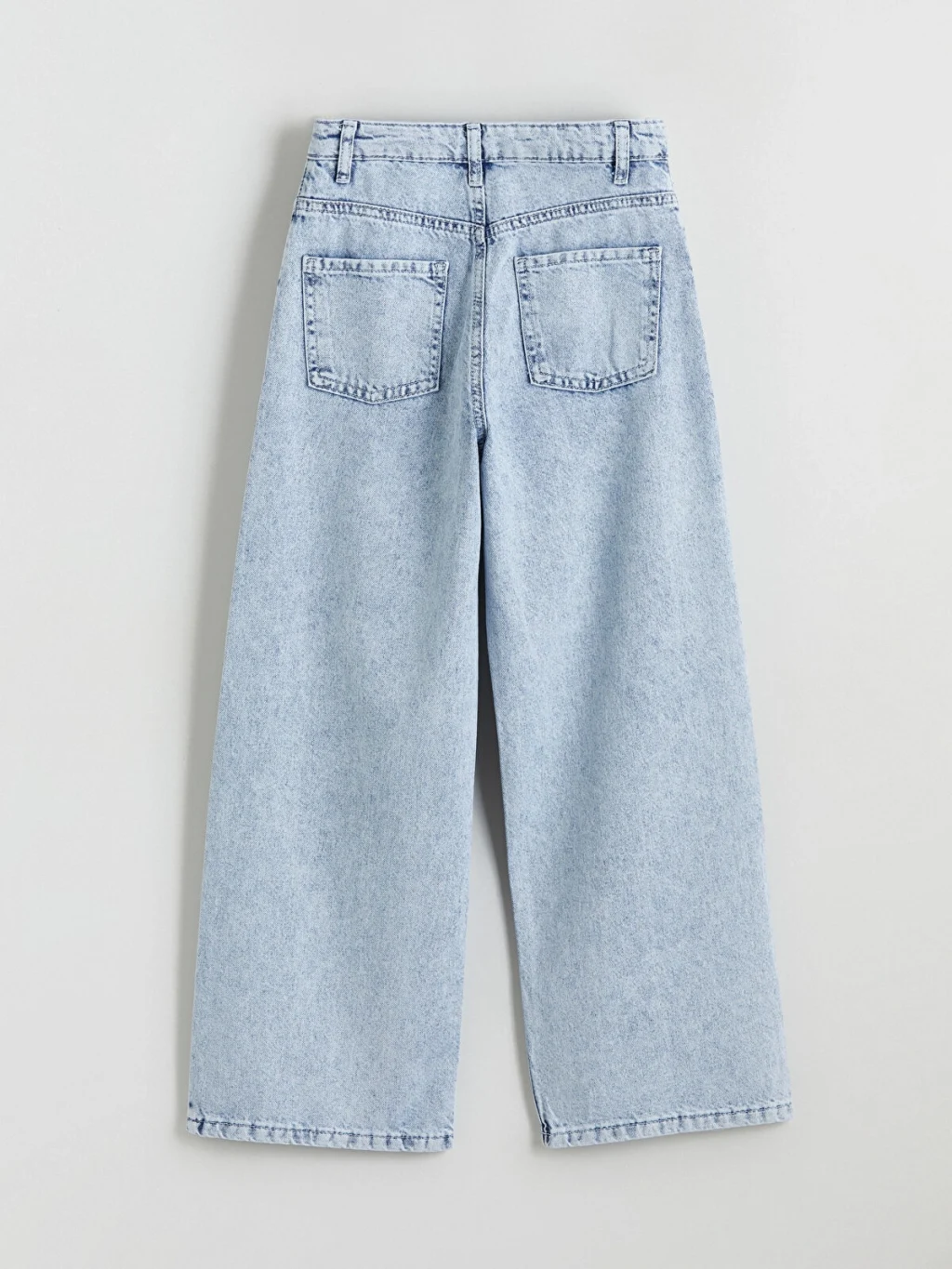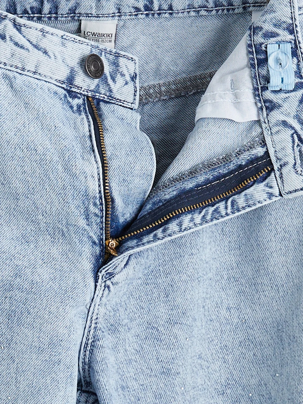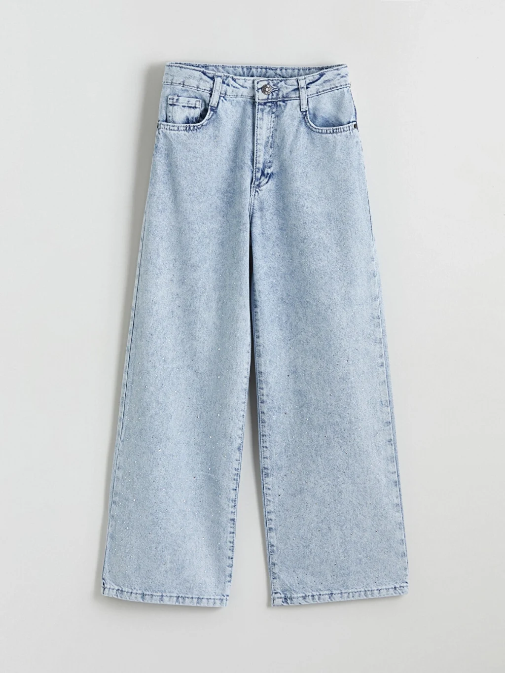Geniş paçalı ve paçaları taş işlemeli kız çocuk jean pantolon, %100 pamuklu denim kumaştan üretilmiştir. Beş ceplidir, fermuar ve düğme kapamalıdır.