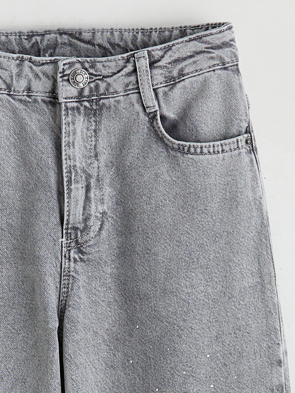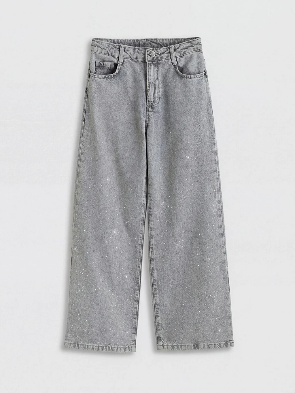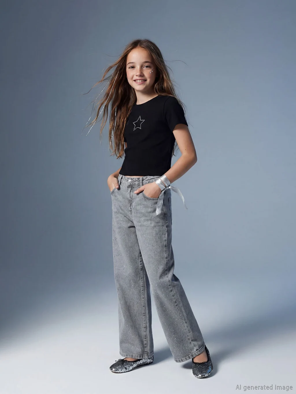Geniş paçalı ve paçaları taş işlemeli kız çocuk jean pantolon, %100 pamuklu denim kumaştan üretilmiştir. Beş ceplidir, fermuar ve düğme kapamalıdır.