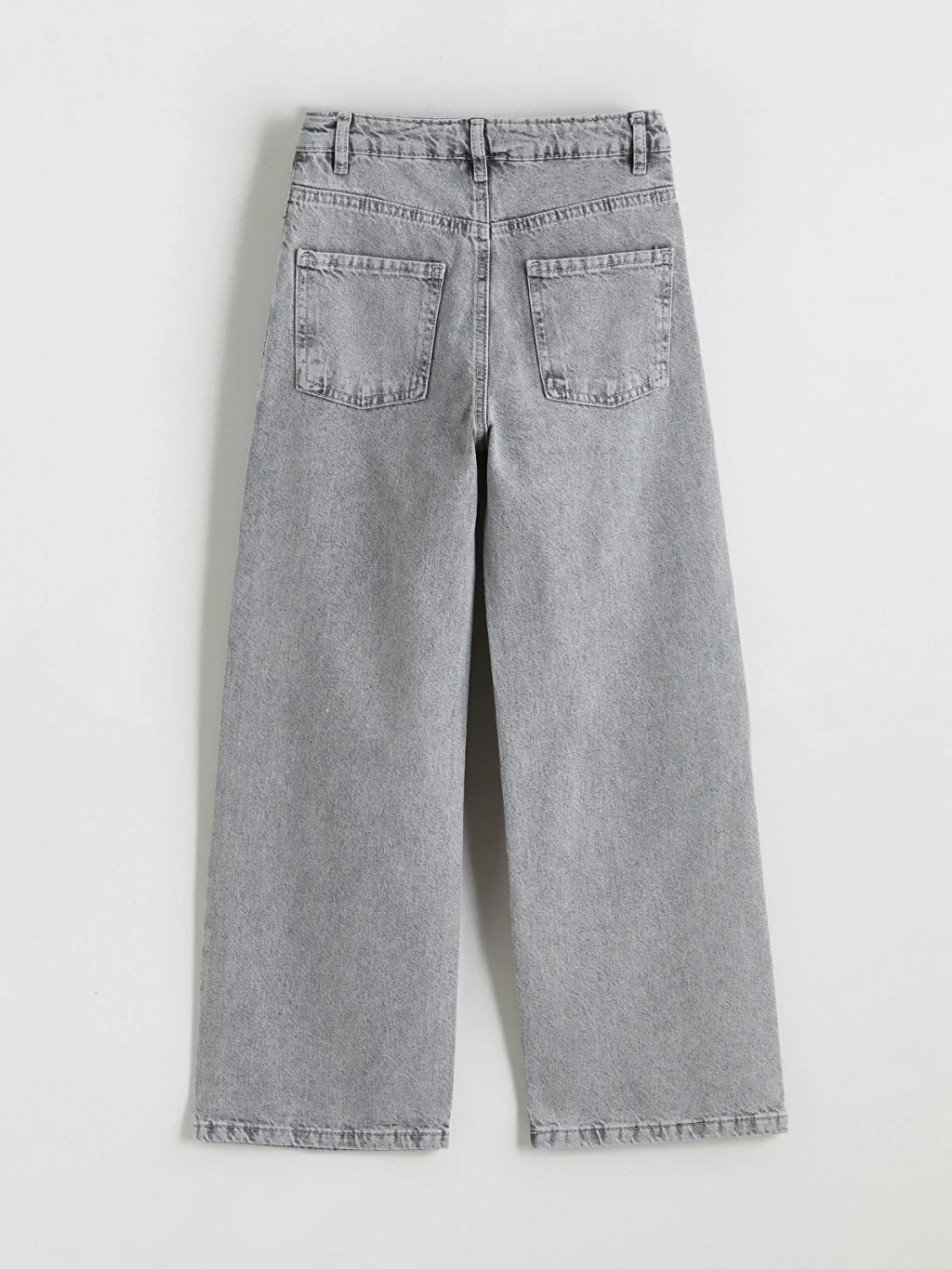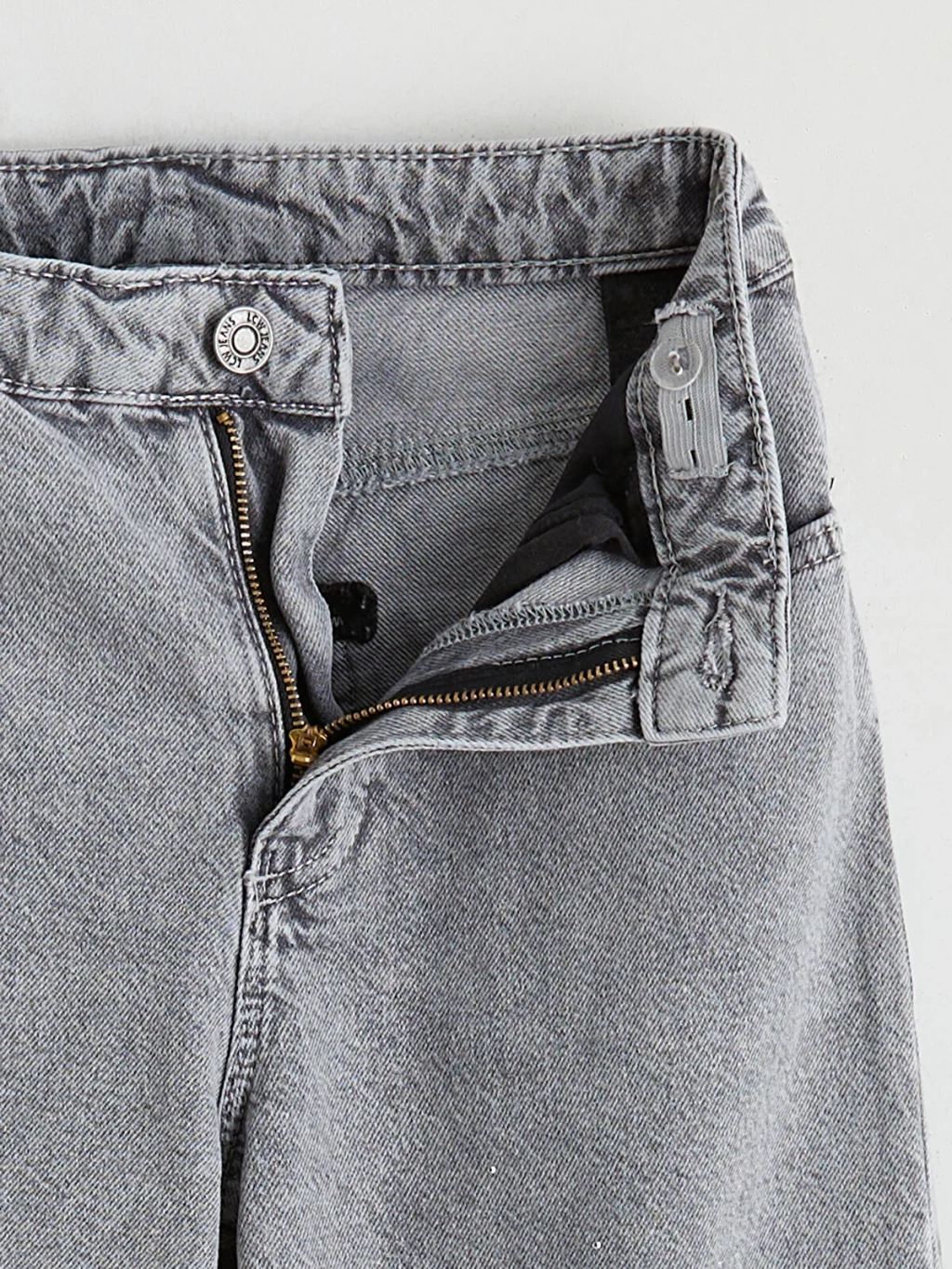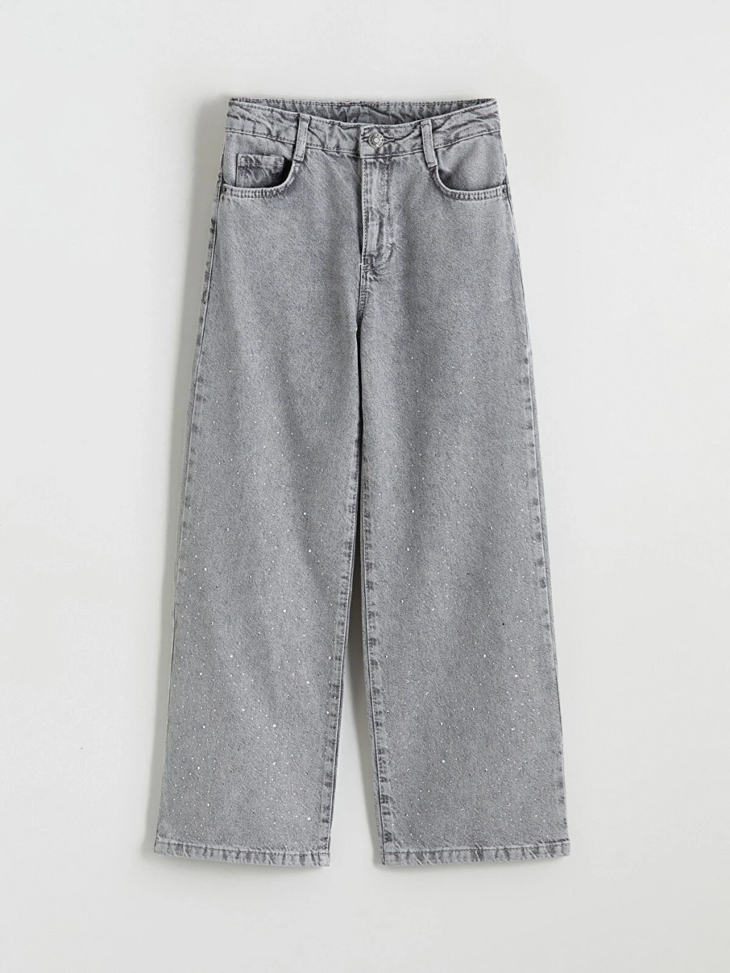 Geniş paçalı ve paçaları taş işlemeli kız çocuk jean pantolon, %100 pamuklu denim kumaştan üretilmiştir. Beş ceplidir, fermuar ve düğme kapamalıdır.