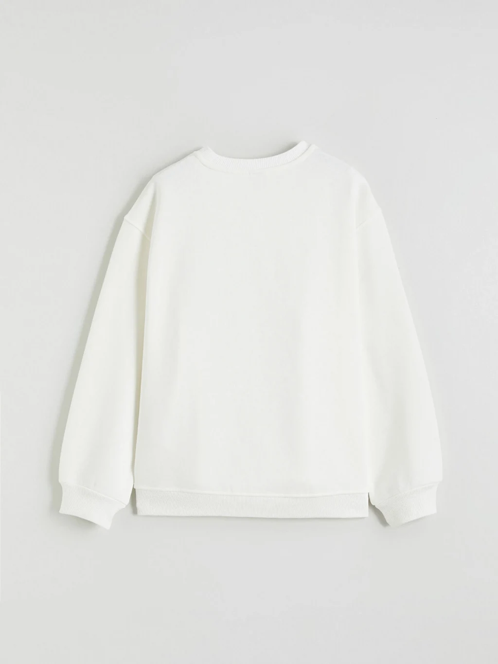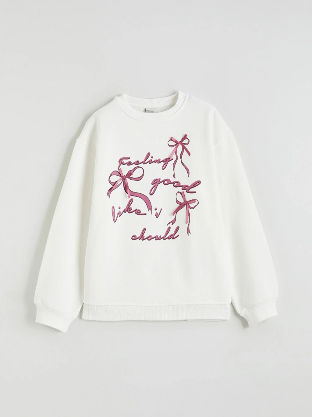 Bisiklet yaka ve uzun kollu kız çocuk sweatshirt, ön yüzünde kurdele ve yazı baskısı bulunur. Kol ve etek uçları ribanalıdır.