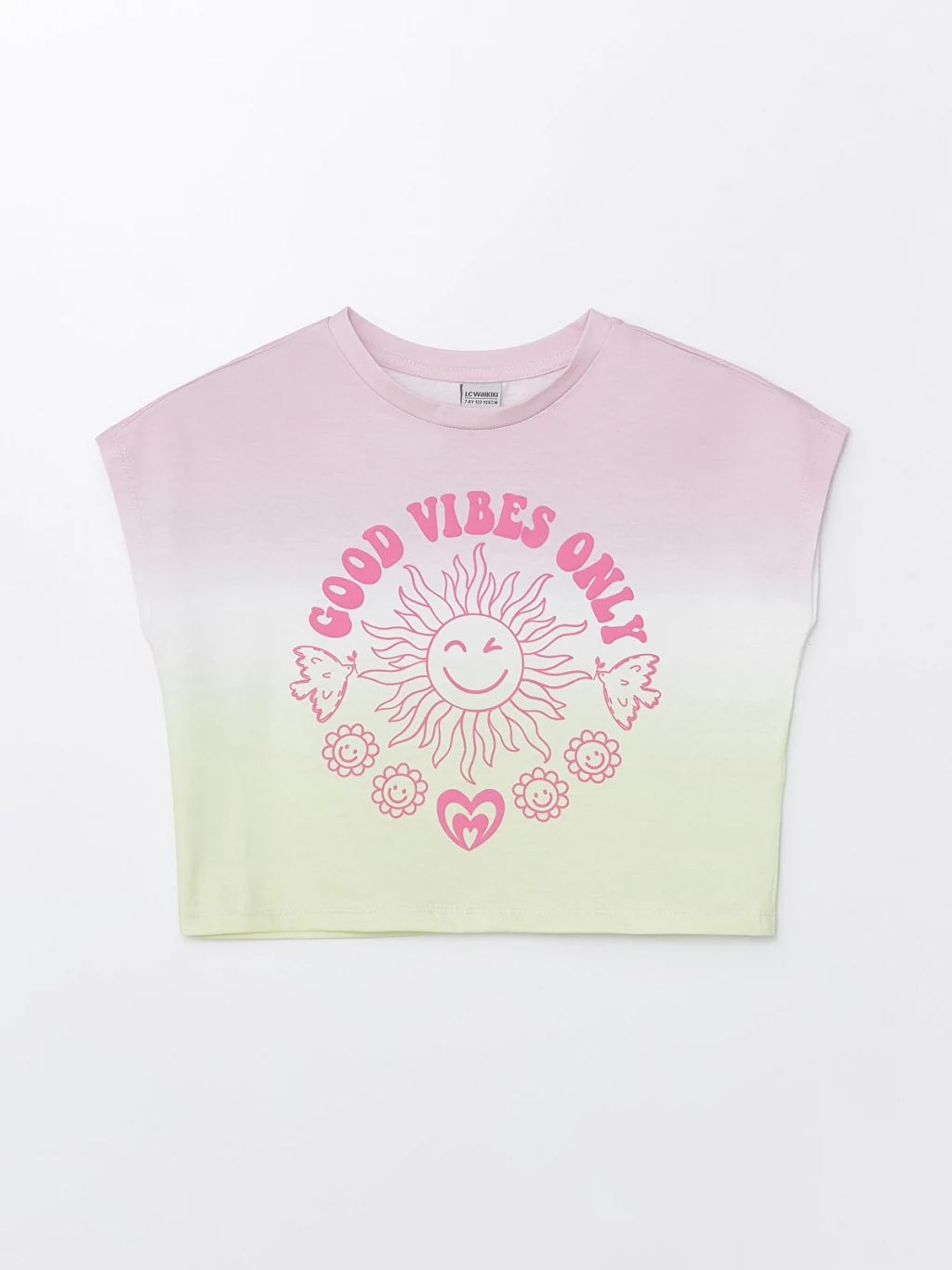 Rahat kalıplı kız çocuk tişört, bisiklet yakalı ve kısa kolludur. Penye kumaştan üretilmiştir ve ön yüzü baskılıdır.