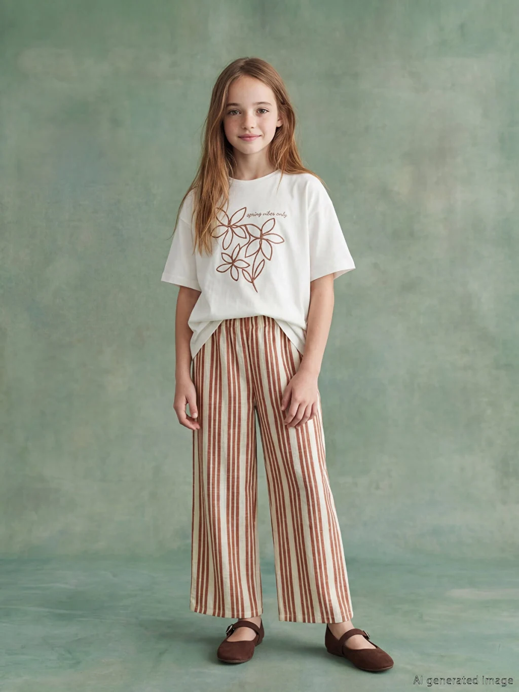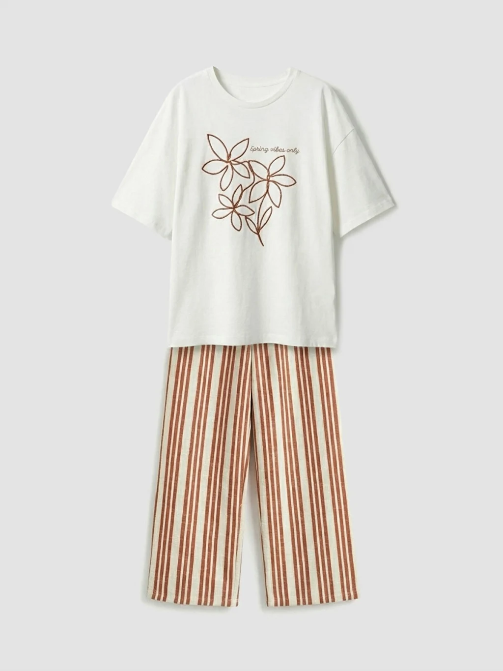 Kız çocuk takım, bisiklet yaka ve kısa kollu baskılı tişört ile çizgili desenli kapri pantolondan oluşur.