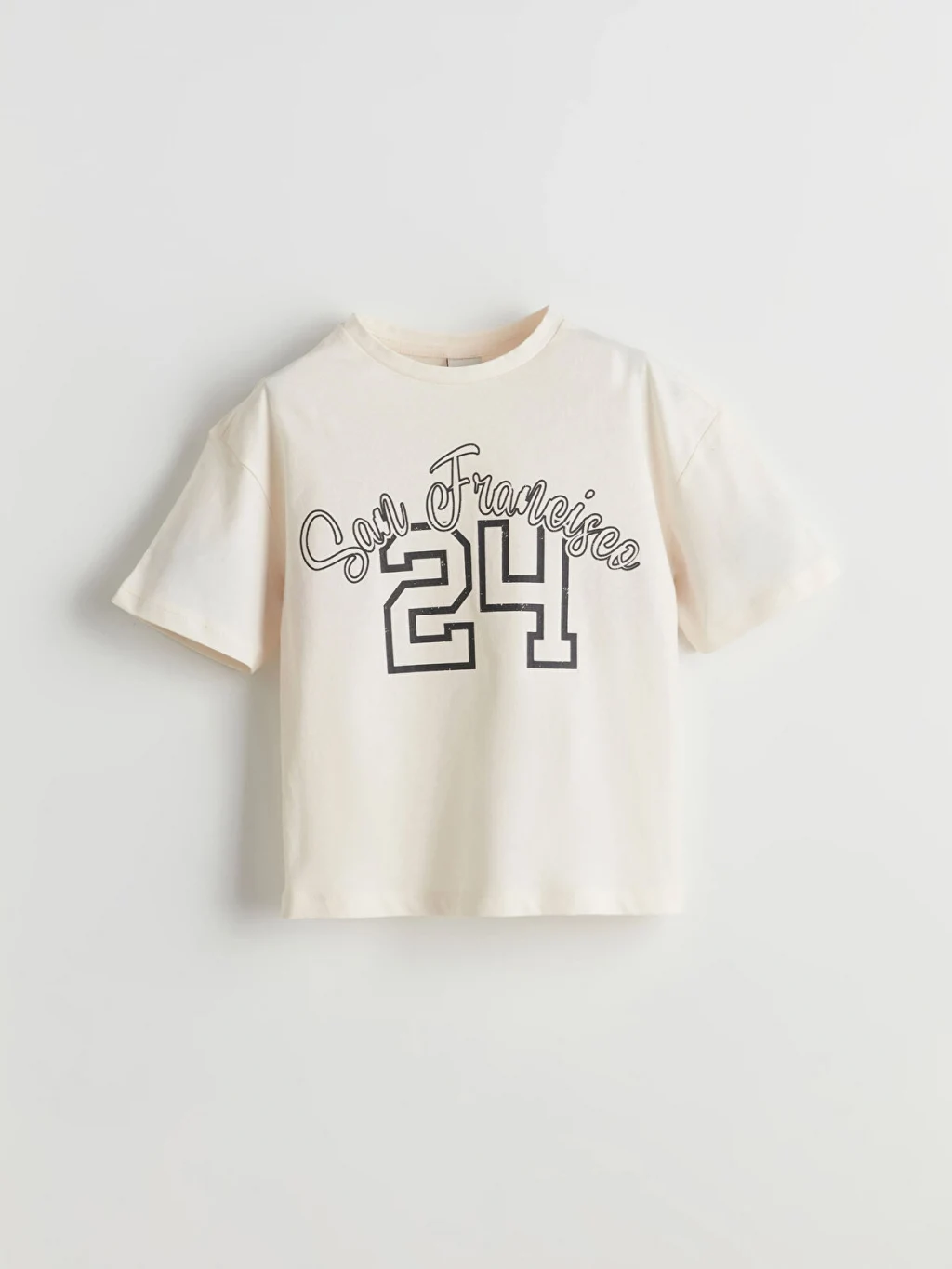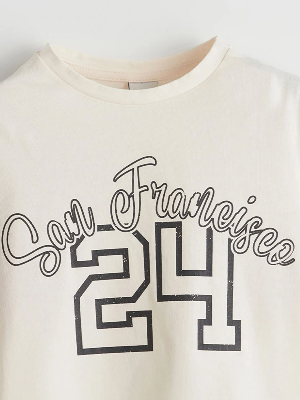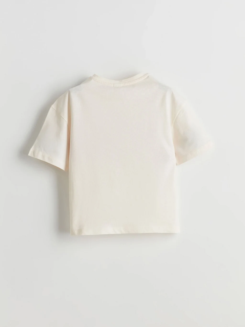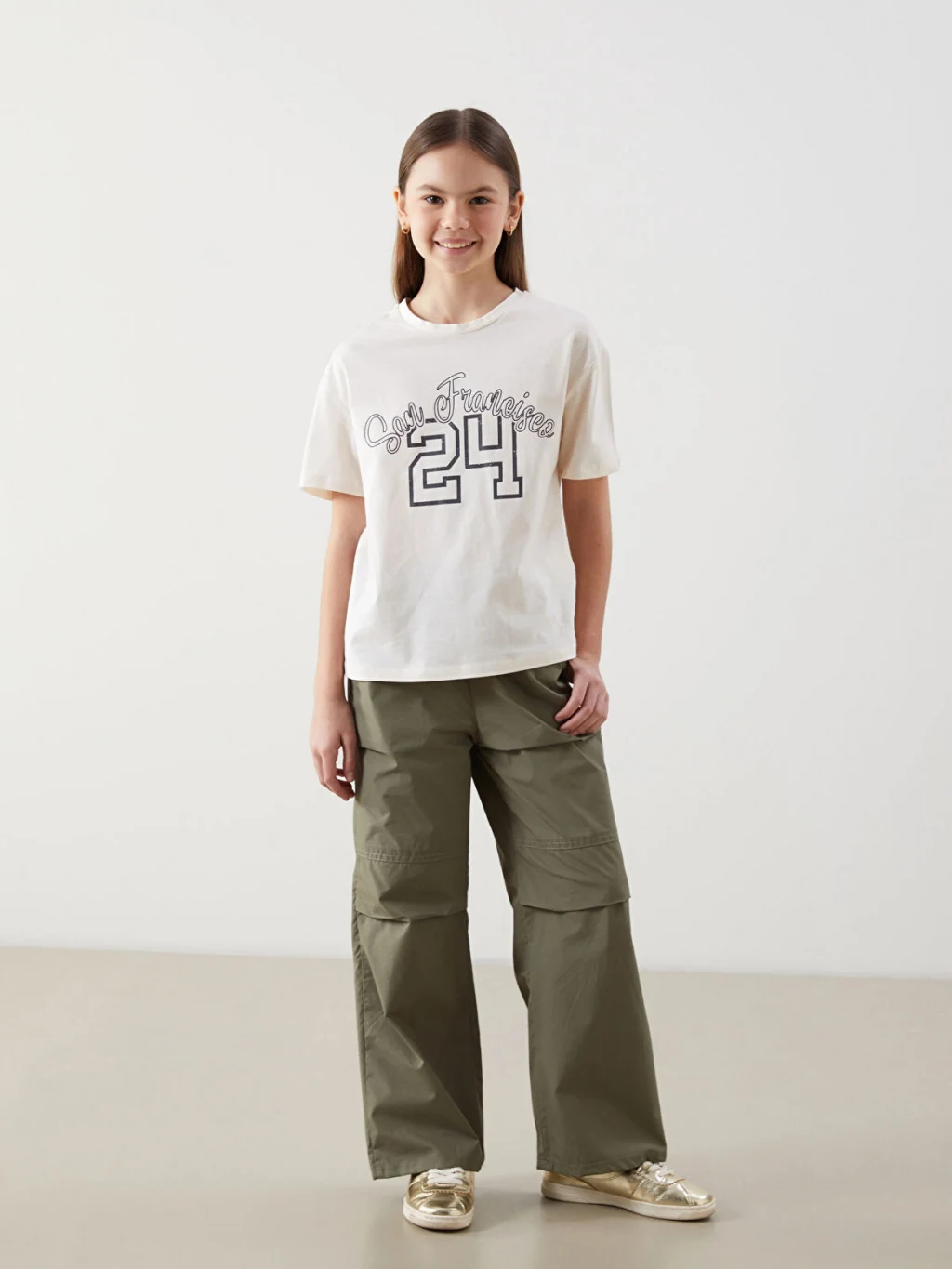 Kız çocuk tişört, %100 pamuklu penye kumaştan üretilmiştir. Bol kalıplı, bisiklet yaka, kısa kollu ve önü baskılıdır.