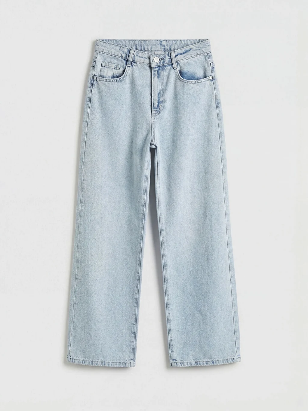 Wideleg kız çocuk jean pantolon, %100 pamuk içerikli denim kumaştan üretilmiştir. Beş cepli tasarıma sahiptir, fermuar ve düğme ile kapanır.