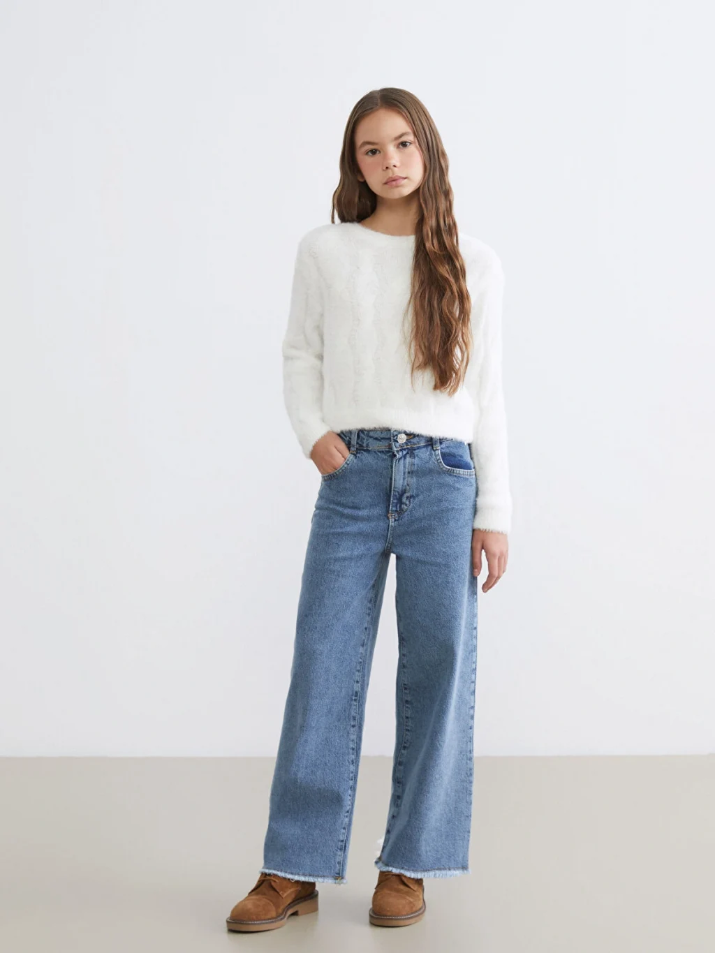 Wideleg Jean pantolon, belden paçaya doğru genişleyen bir kesime sahiptir. İçten lastikli bel detayı ile çocuğunuz büyüdükçe uygun ölçüde kullanım kolaylığı ve trend bir görünüm sunar.