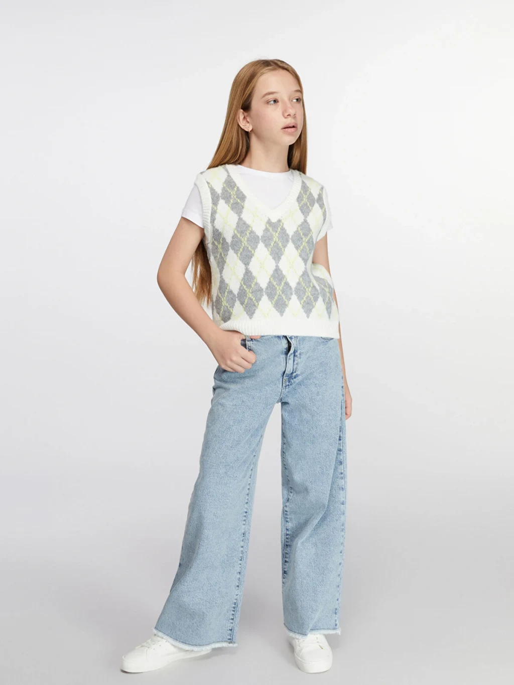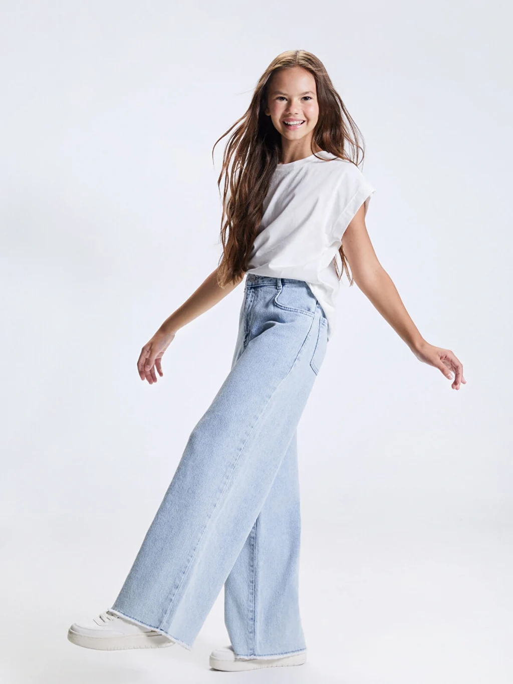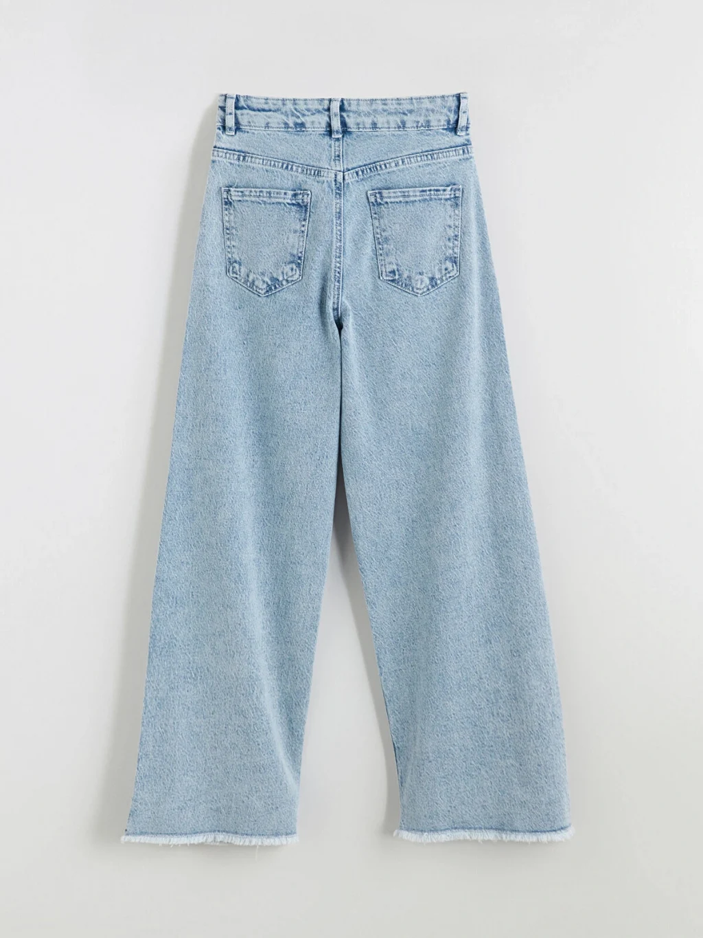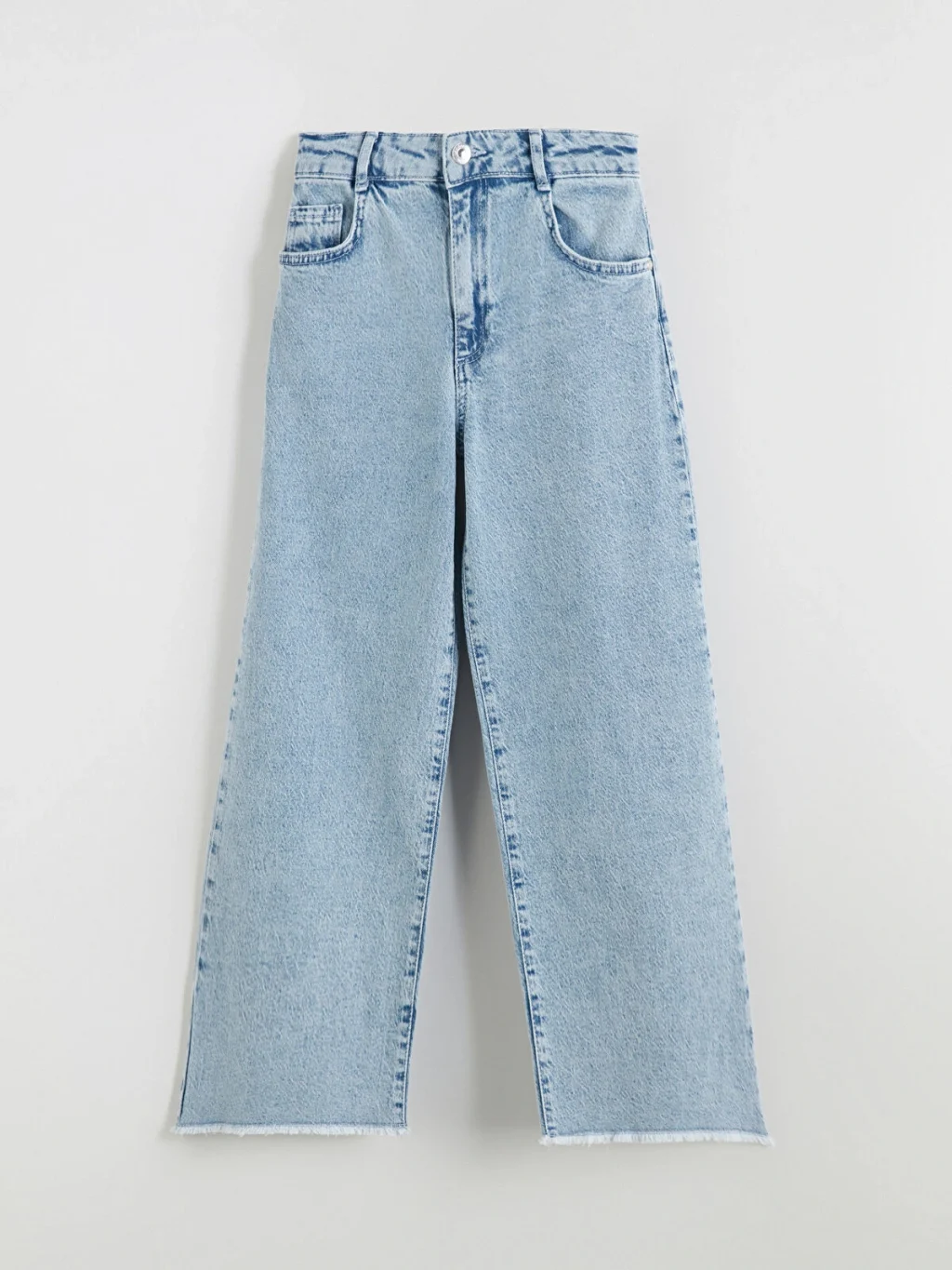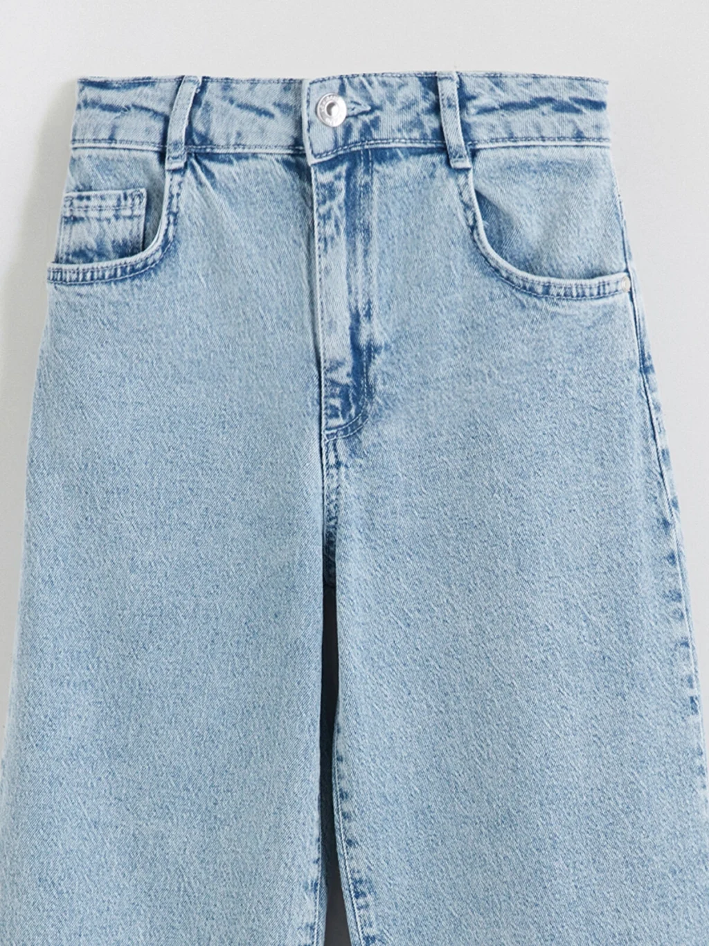 Wideleg kız çocuk denim pantolon, yüksek bel ve geniş paça kesime sahiptir. Beli içten ayarlanabilir lastiklidir.