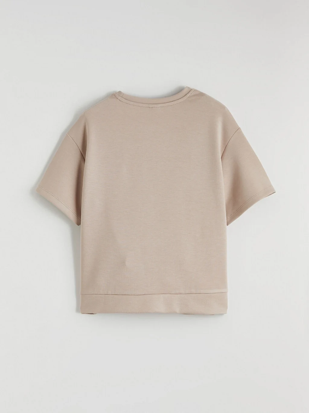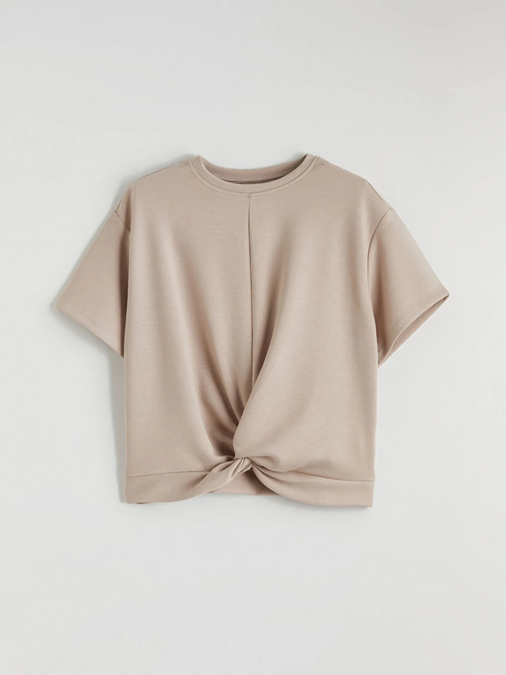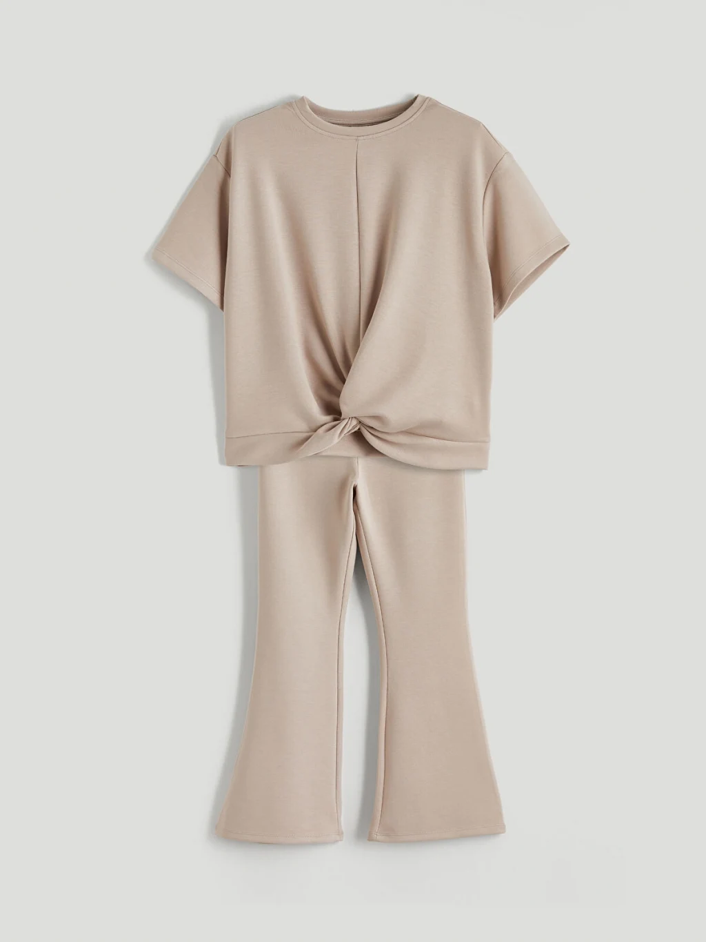Kız çocuk takım, bisiklet yaka ve kısa kollu üst ile İspanyol paça pantolondan oluşur. Üstün ön kısmında düğüm detayı bulunur.
