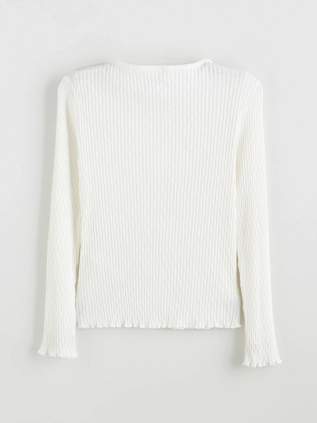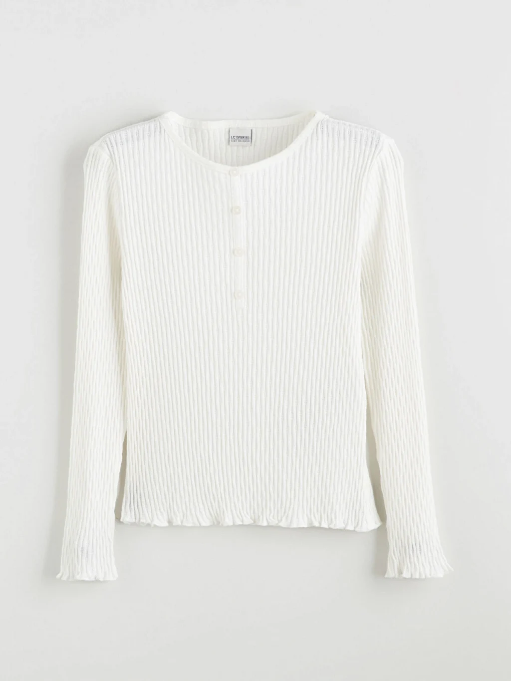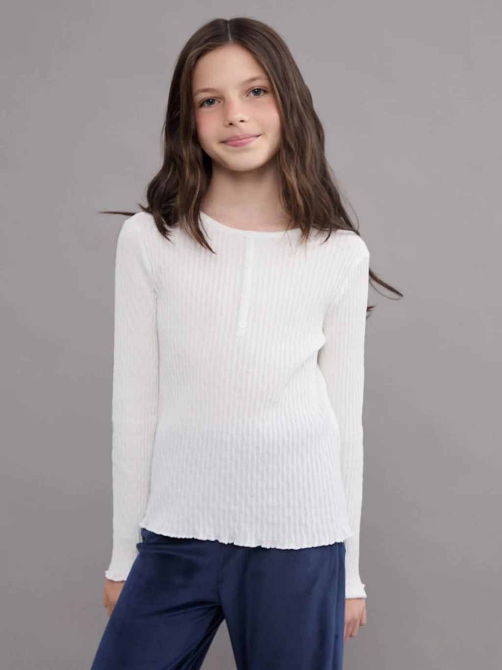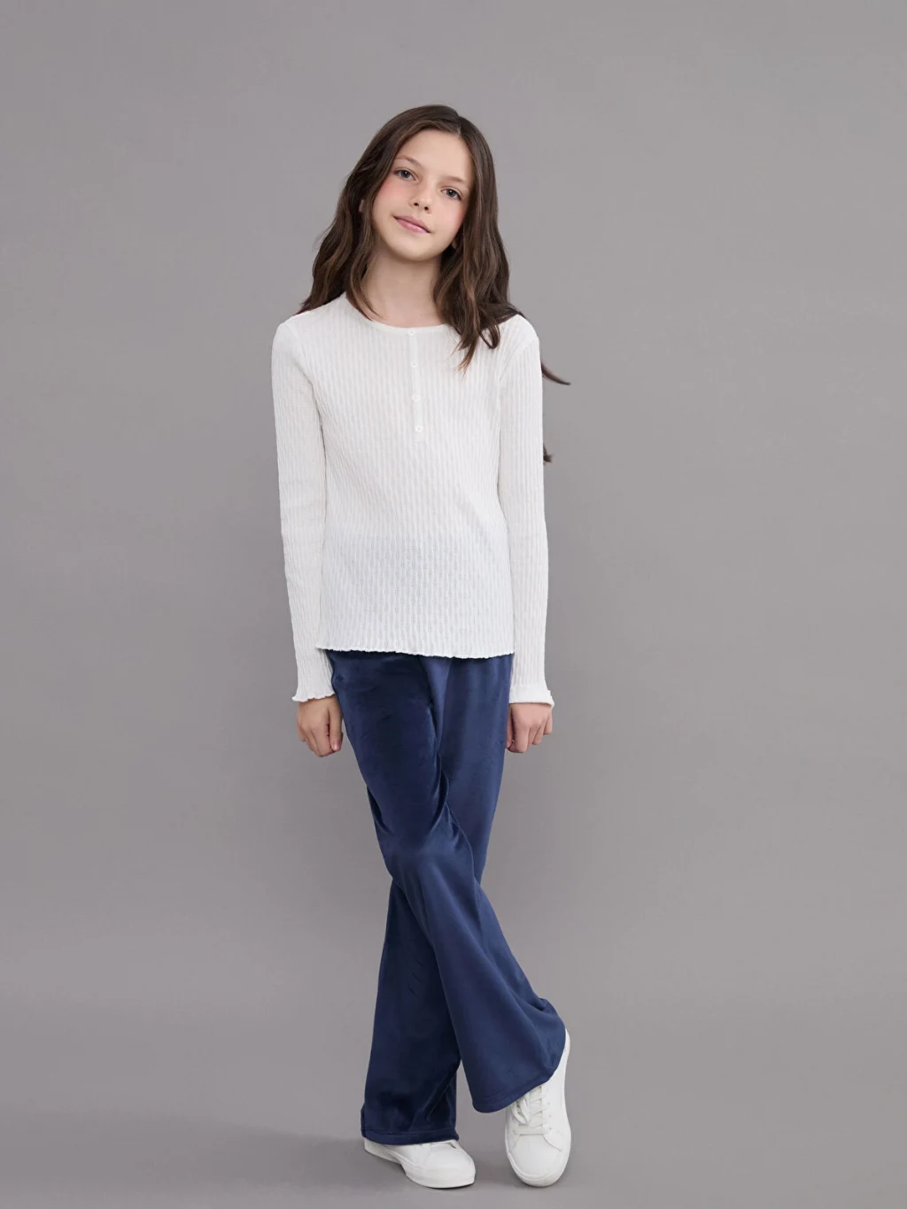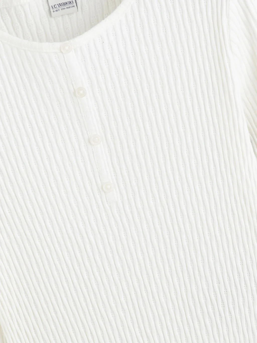 Bisiklet yakalı ve uzun kollu kız çocuk tişört, %100 pamuklu ribana kumaştan üretilmiştir. Önü düğmeli, kol ağzı ve etek ucu fırfırlıdır.
