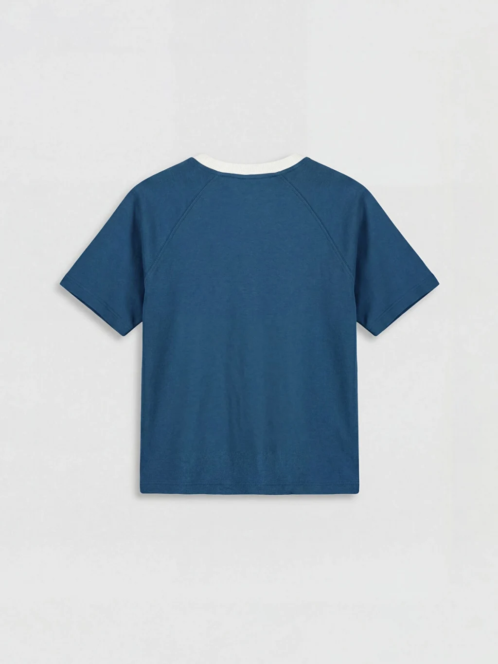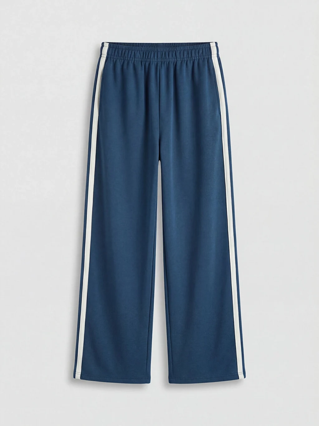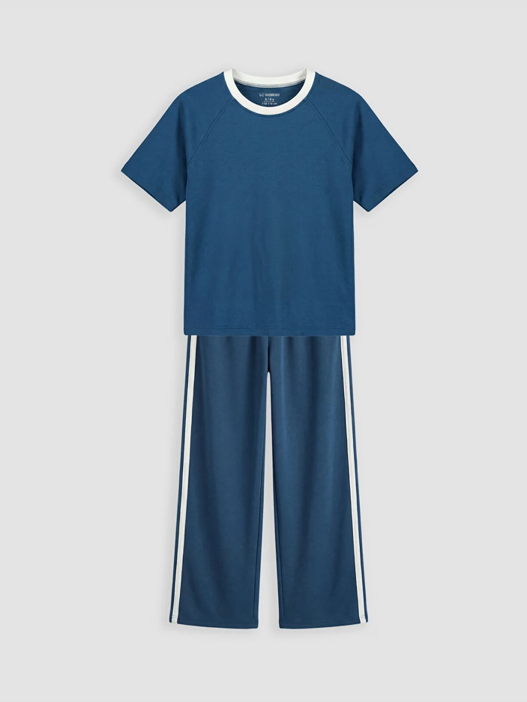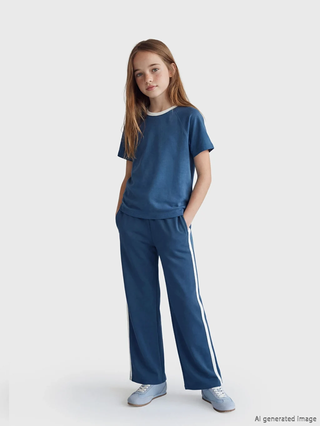Kız çocuk takım, bisiklet yaka ve kısa reglan kollu tişört ile yanları şerit detaylı uzun alt parçadan oluşur.