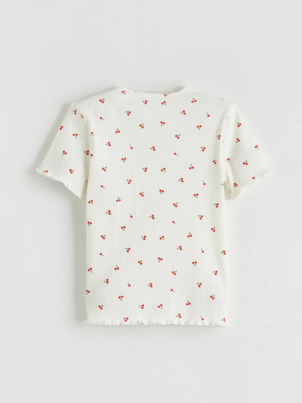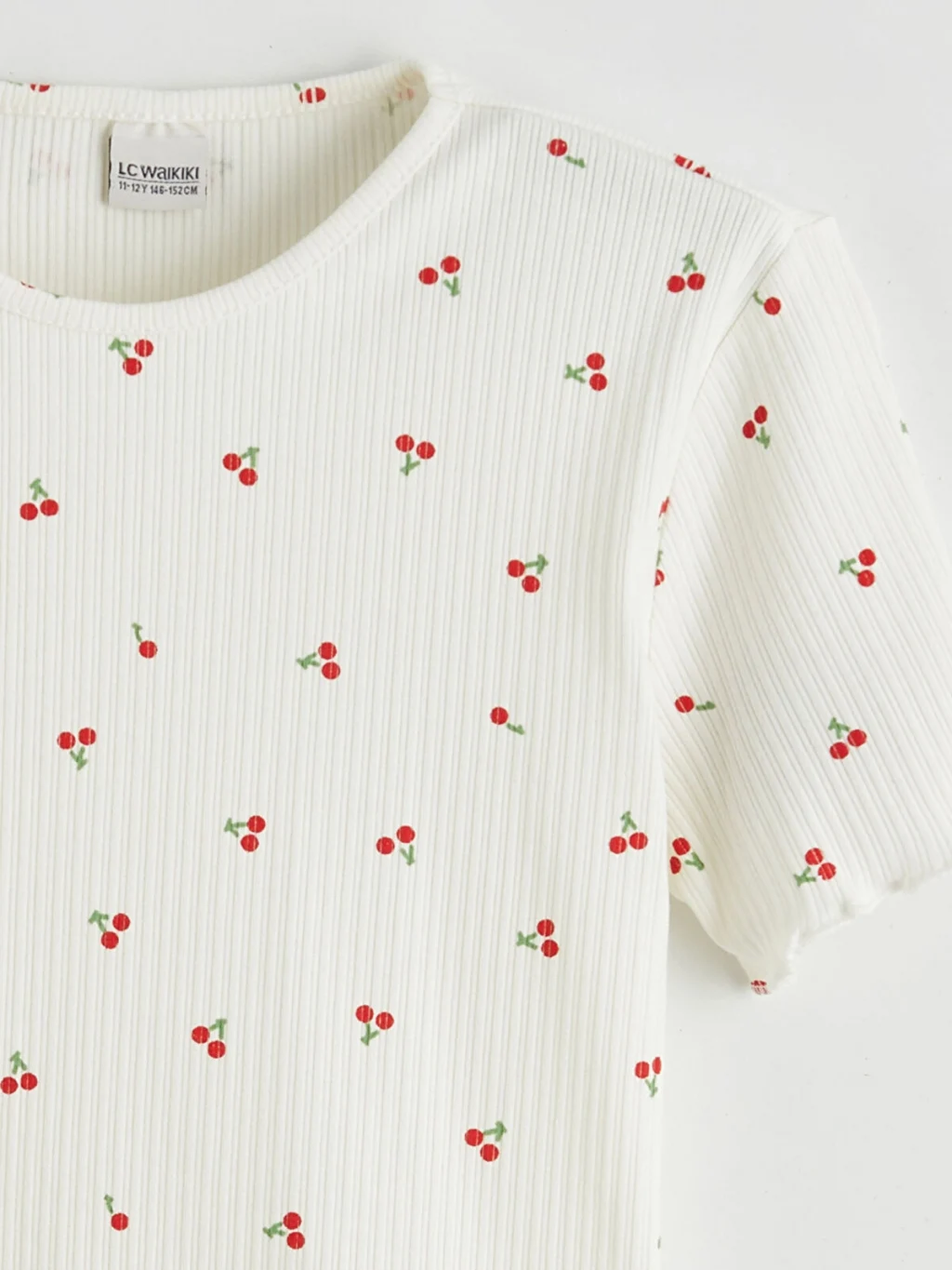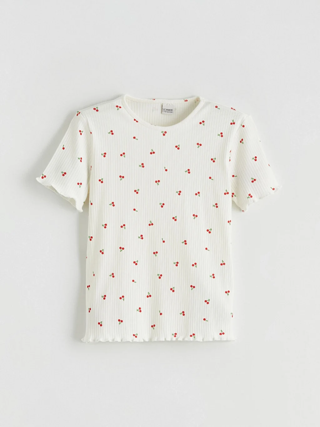 Yüksek pamuk içerikli kaşkorse kumaştan, dar kalıp, bisiklet yaka kız çocuk tişört. Kısa kollu, çiçek desenli modelin kol ve etek ucu fırfırlıdır.