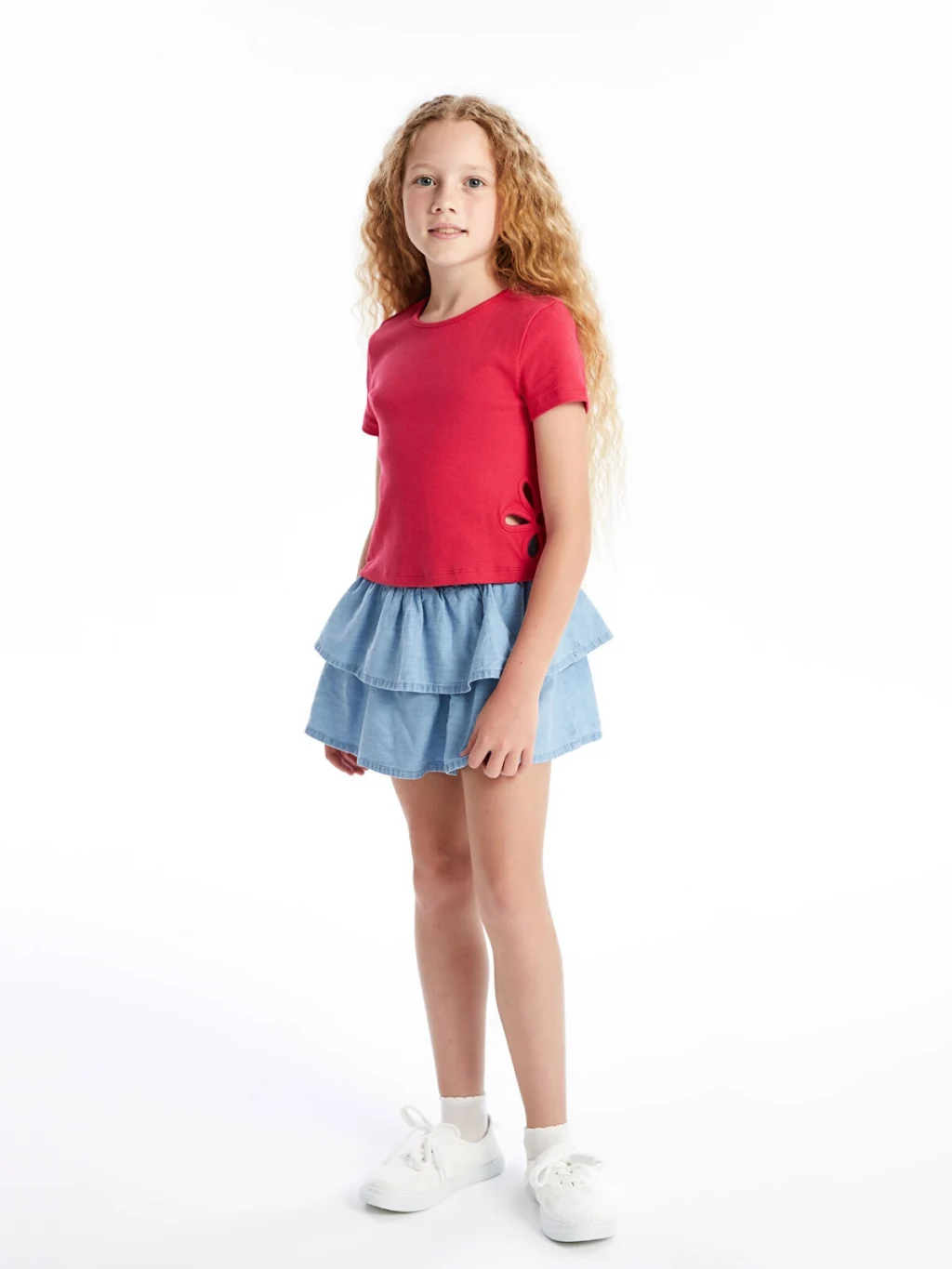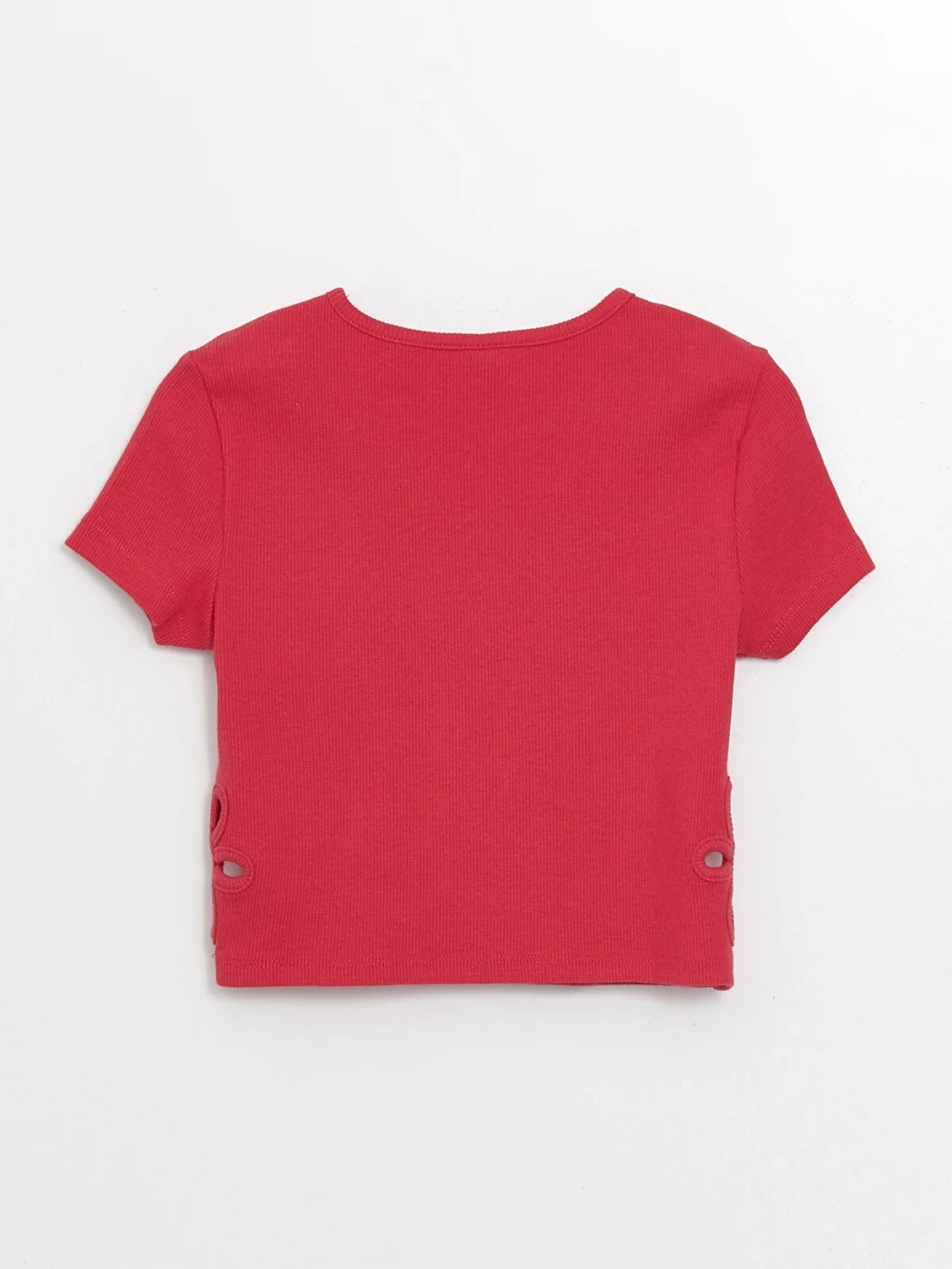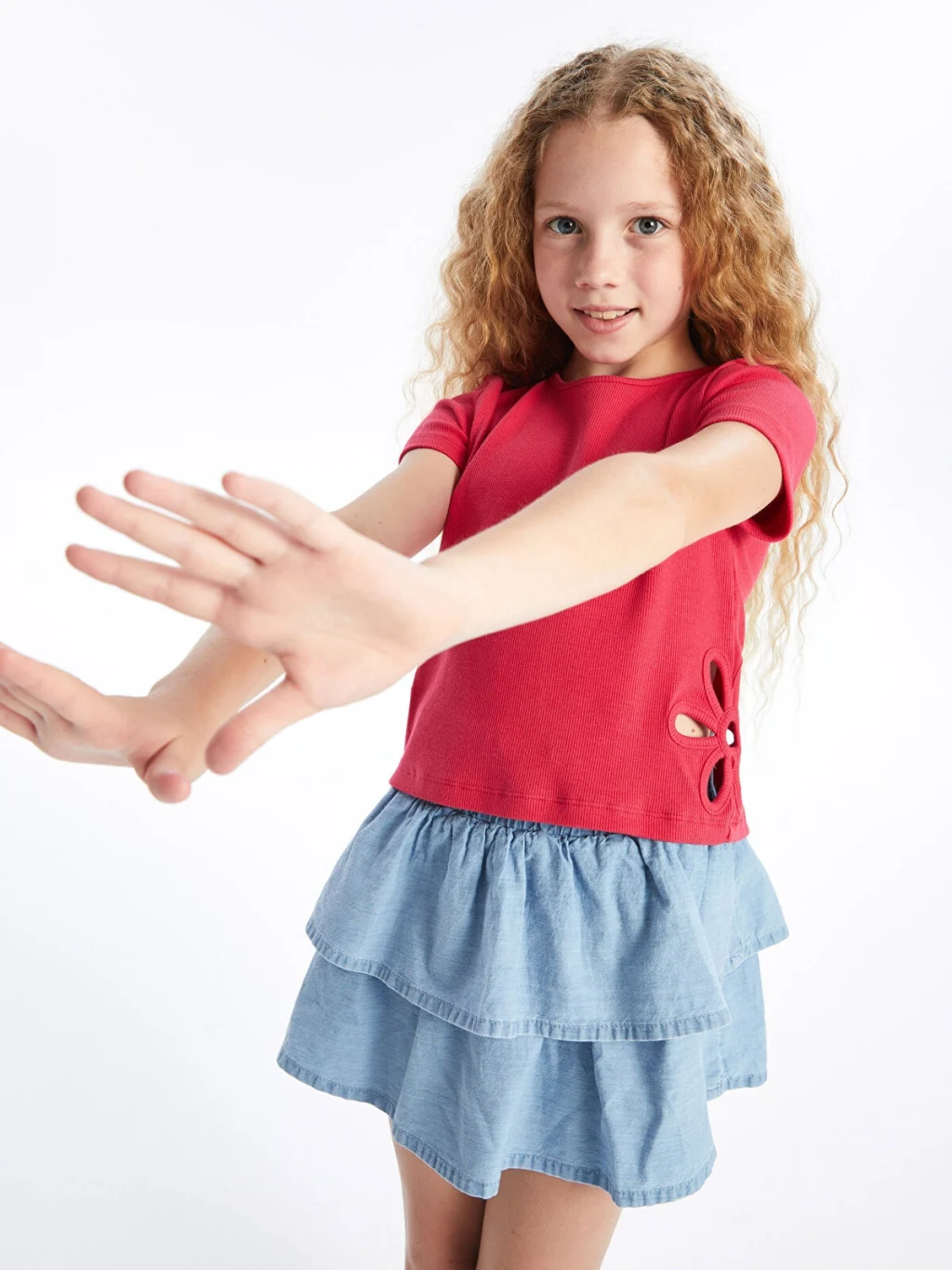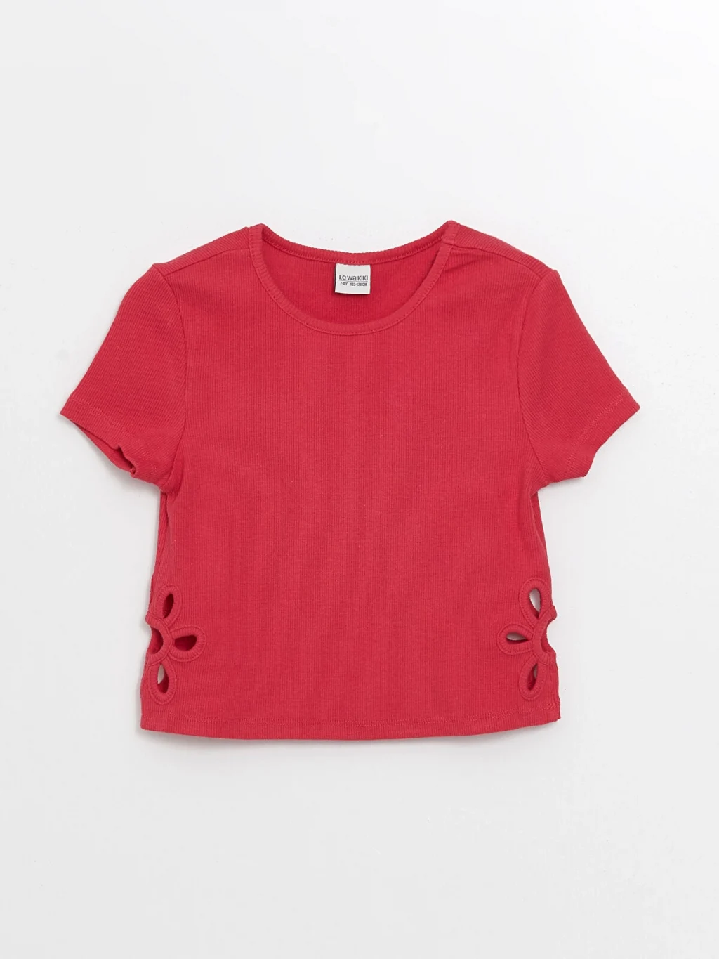 Dar kalıp kız çocuk tişört, yüksek pamuk içerikli kumaştan üretilmiştir. Bisiklet yaka, kısa kollu ve yanları çiçek şeklinde kesik detaylıdır.