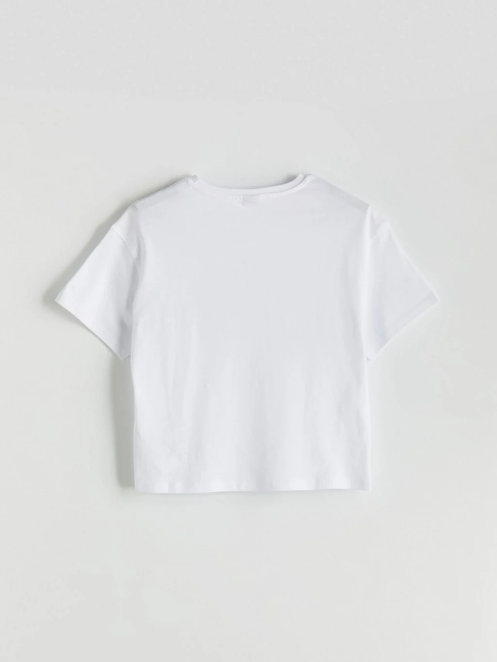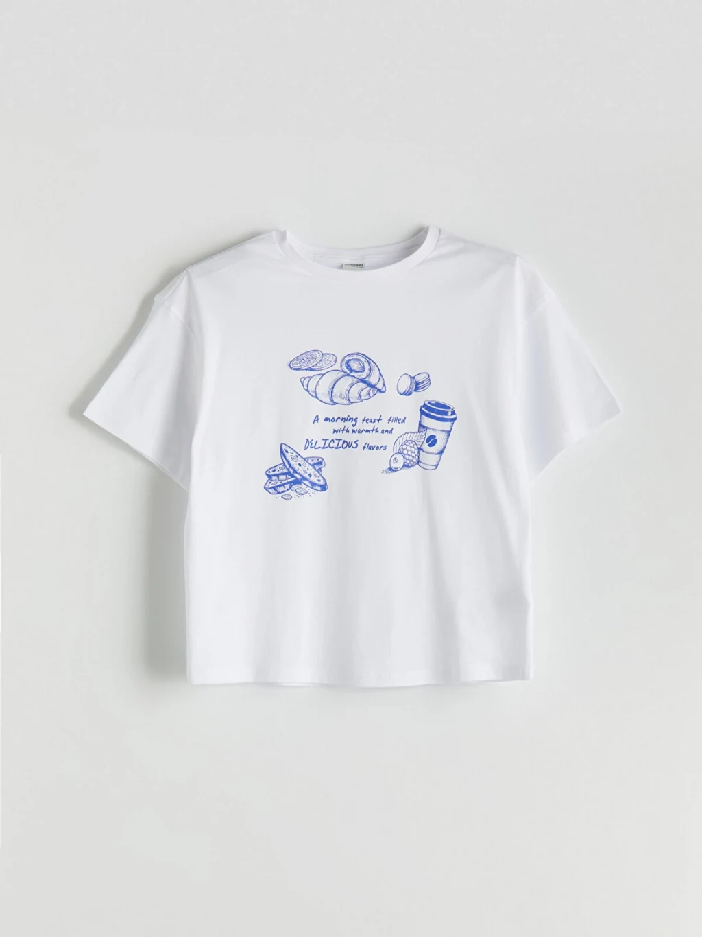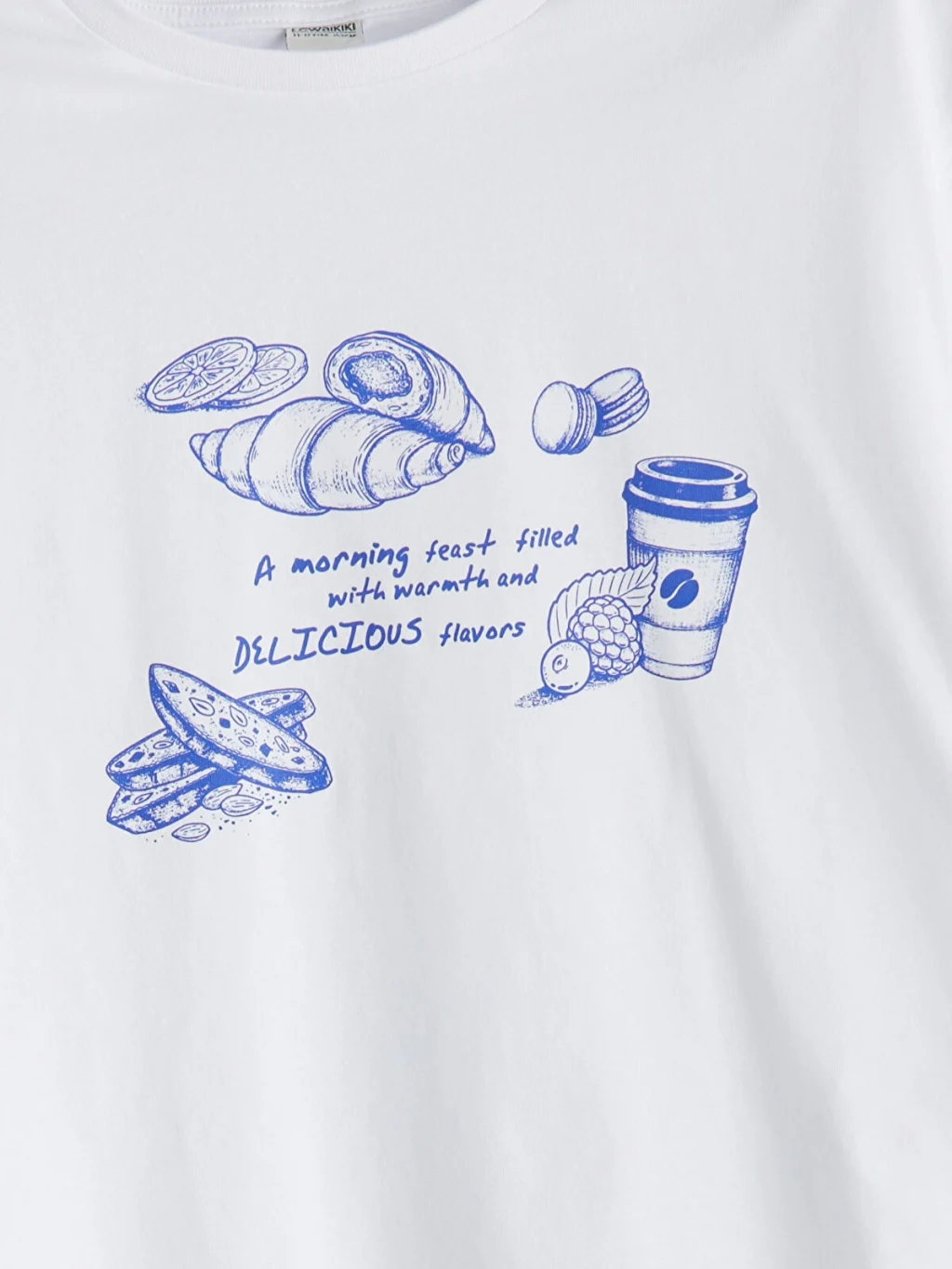 Kız çocuk tişört, %100 pamuklu penye kumaştan üretilmiştir. Bisiklet yaka, kısa kollu ve bol kalıplıdır. Ön yüzü baskılıdır.