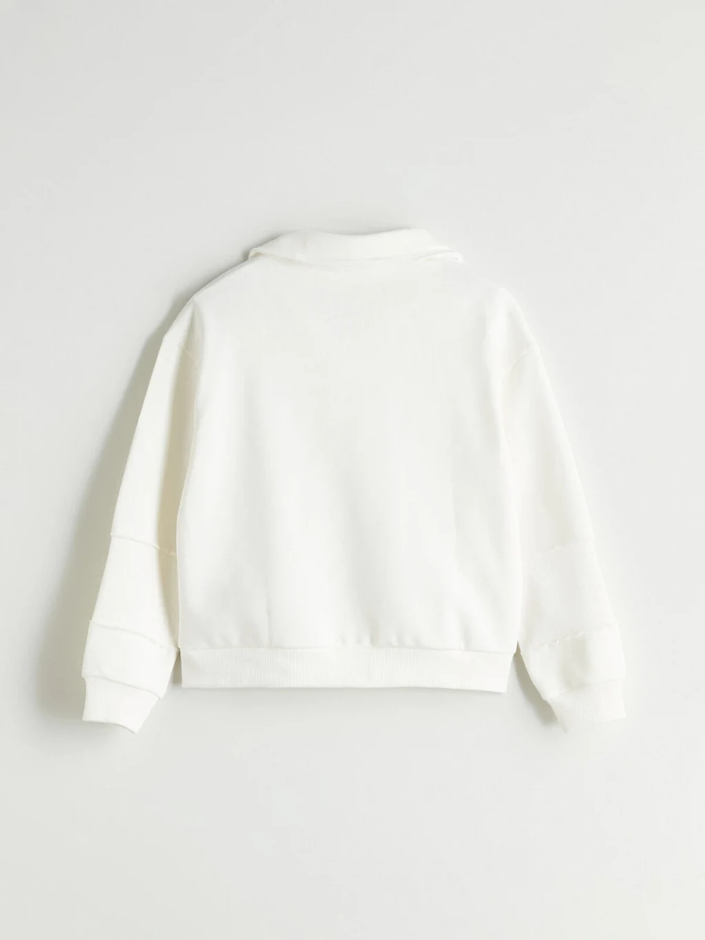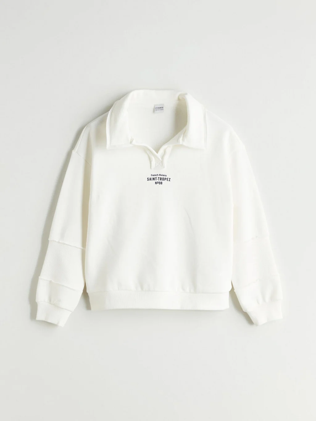 Polo yaka kız çocuk sweatshirt, 3 iplik şardonlu kumaştan üretilmiştir. Manşetleri ve etek ucu ribanalıdır.