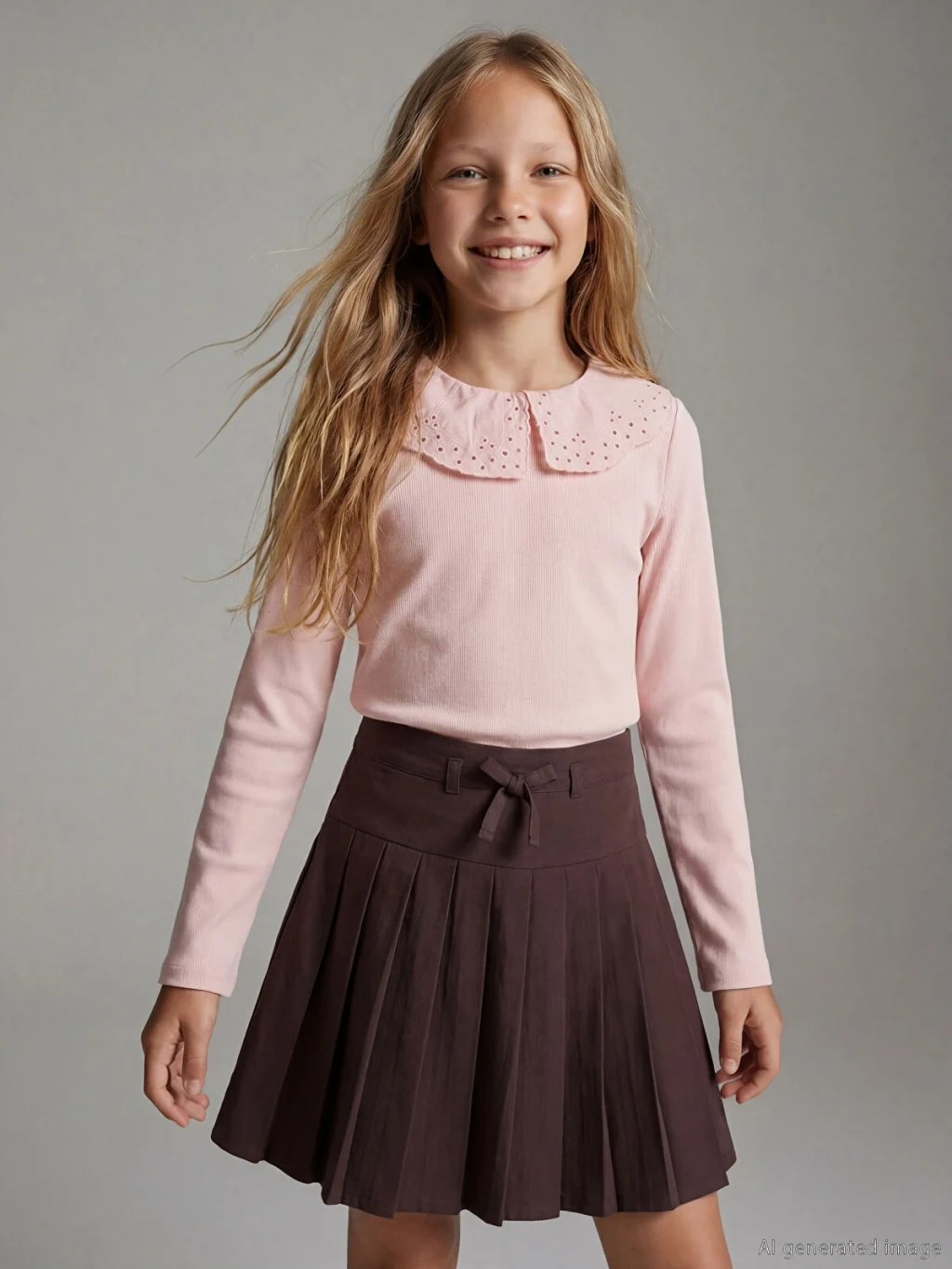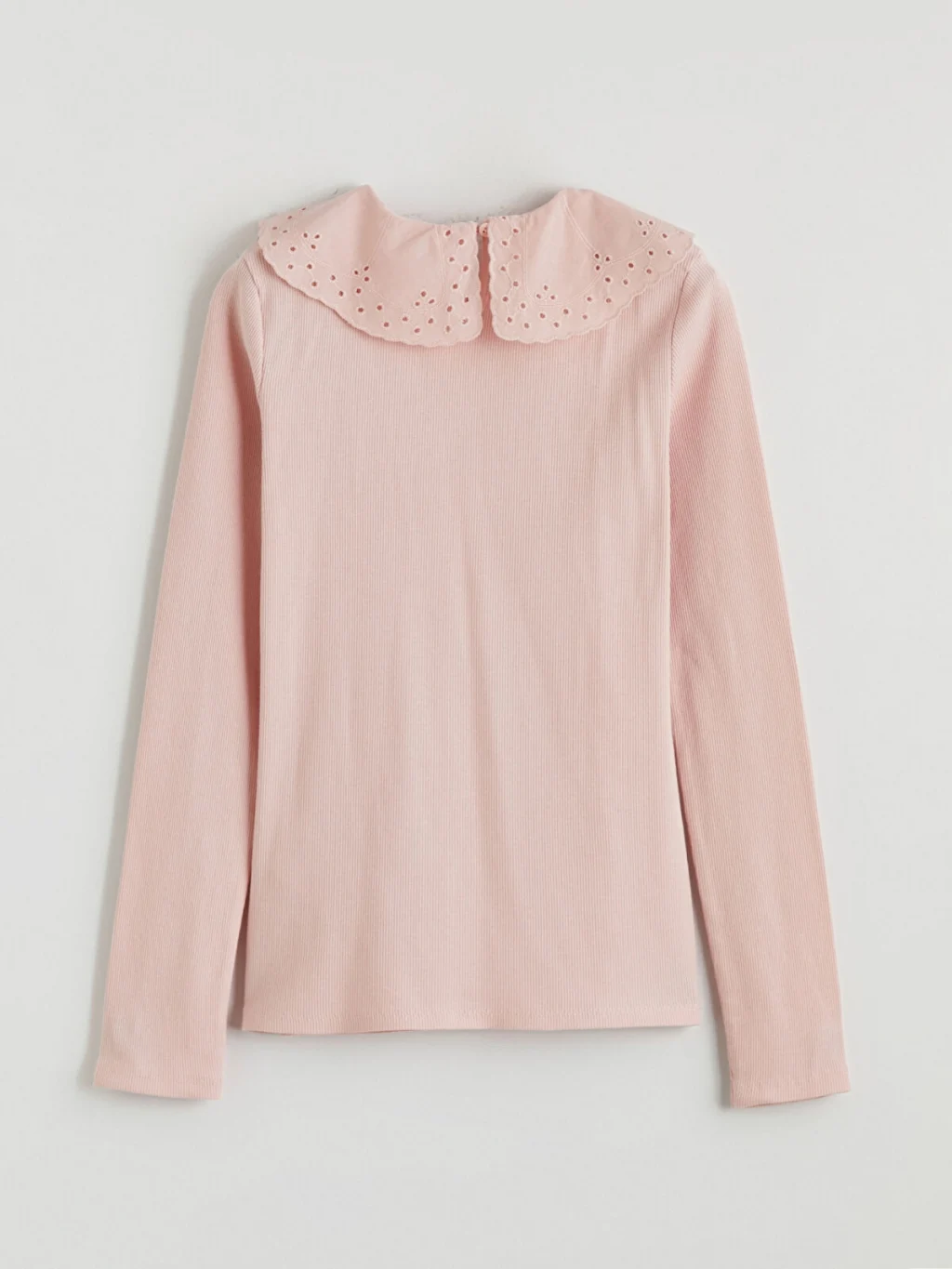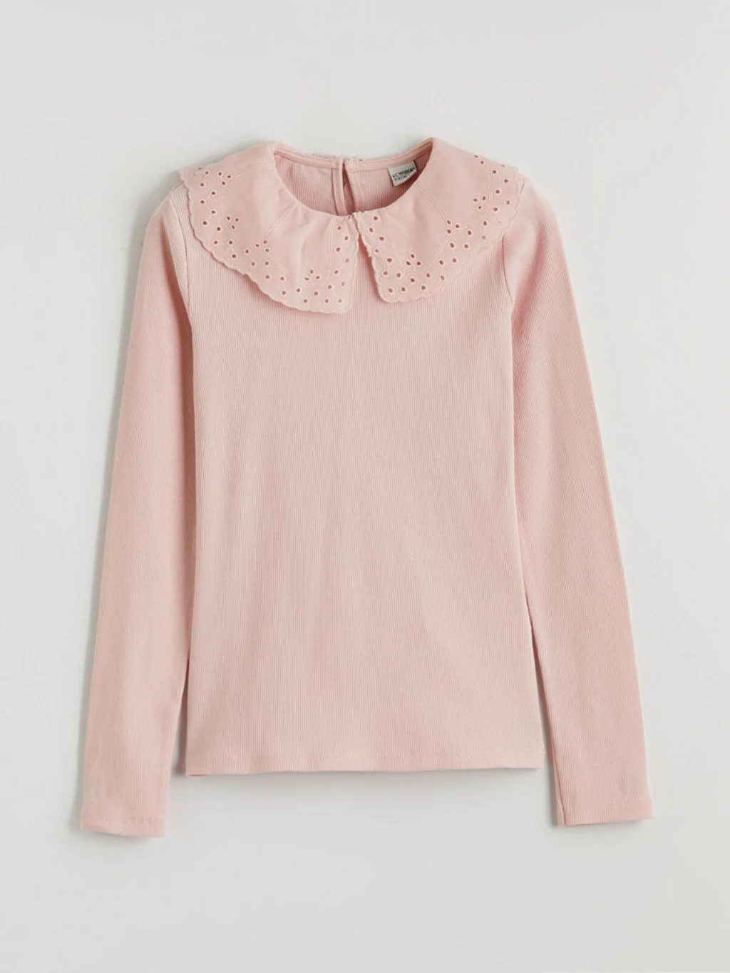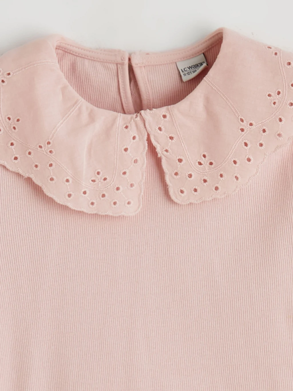 Dar kalıp, uzun kollu kız çocuk tişört, kaşkorse kumaştan üretilmiştir. Brode detaylı bebe yakalıdır ve enseden düğme kapamalıdır.