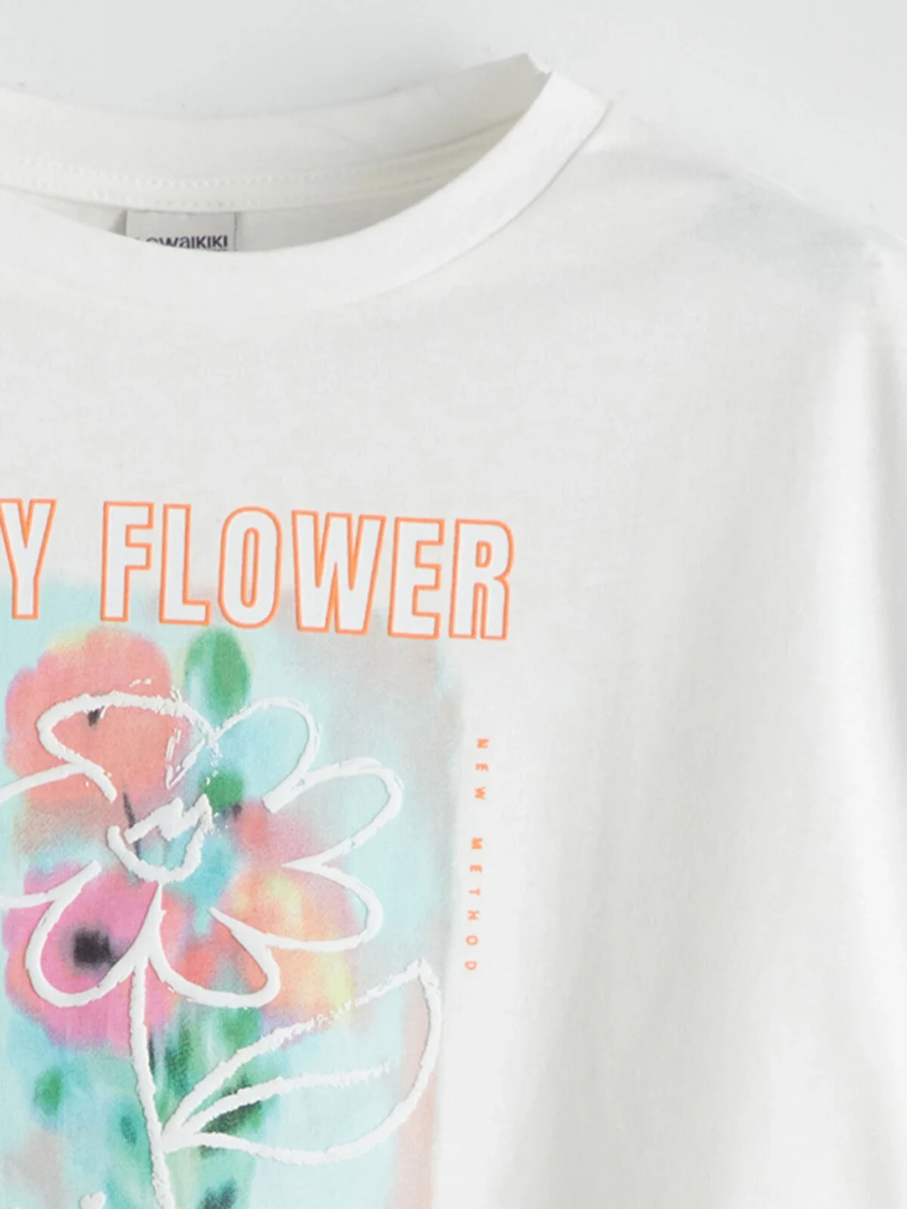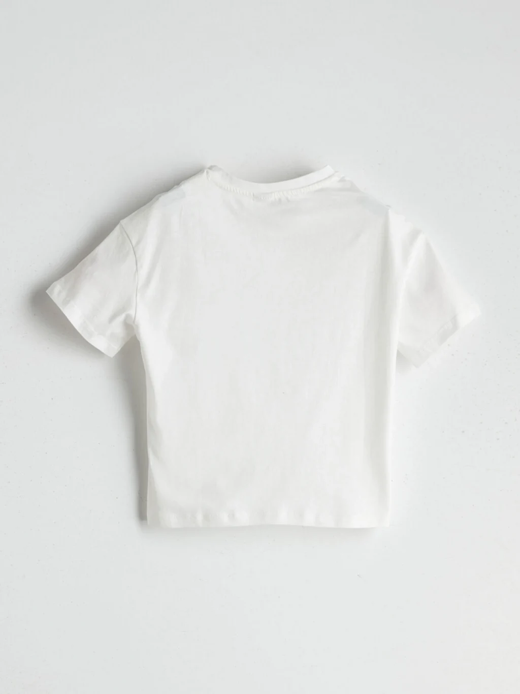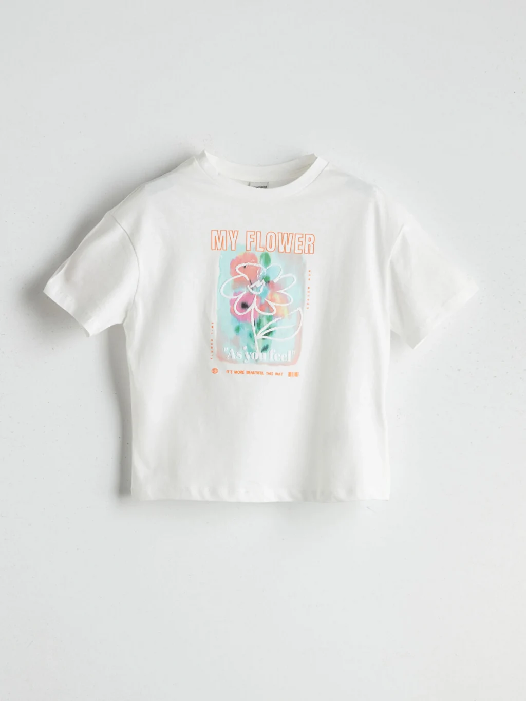 Kız çocuk tişört, %100 pamuklu penye kumaştan üretilmiştir. Bisiklet yaka, kısa kollu ve bol kalıplıdır. Ön yüzü baskılıdır.