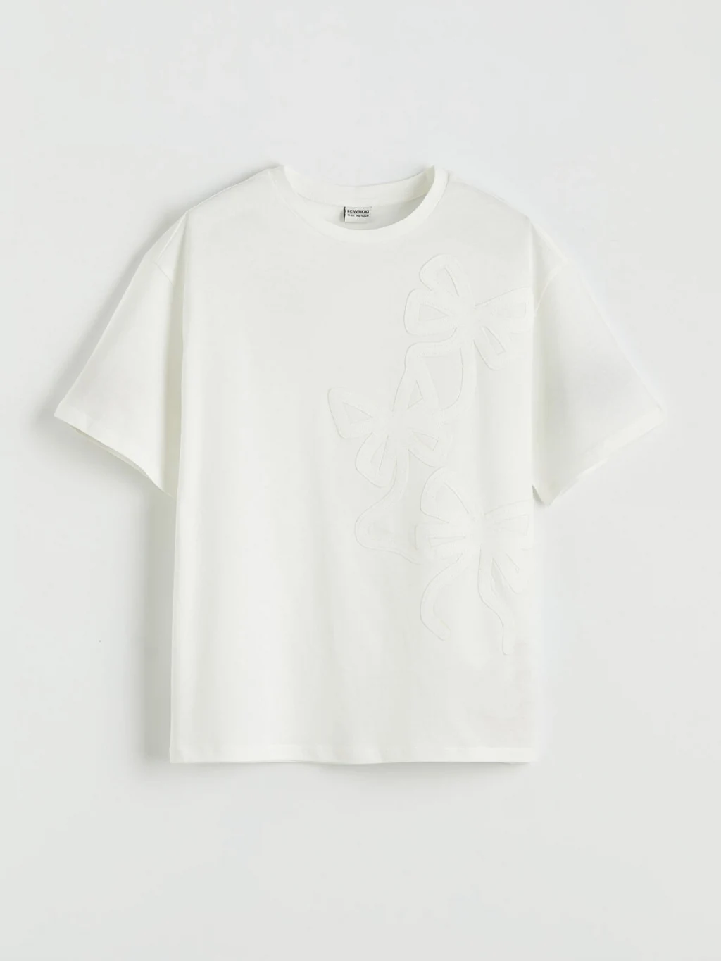 Bisiklet yaka ve kısa kollu kız çocuk tişört, %100 pamuklu penye kumaştan üretilmiştir. Bol kalıplıdır ve nakış detaylıdır.