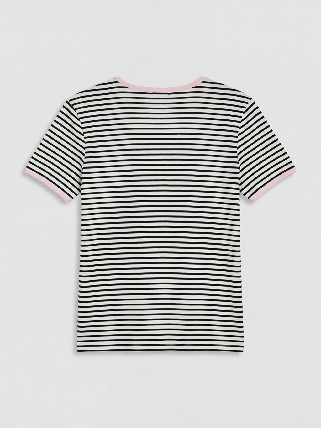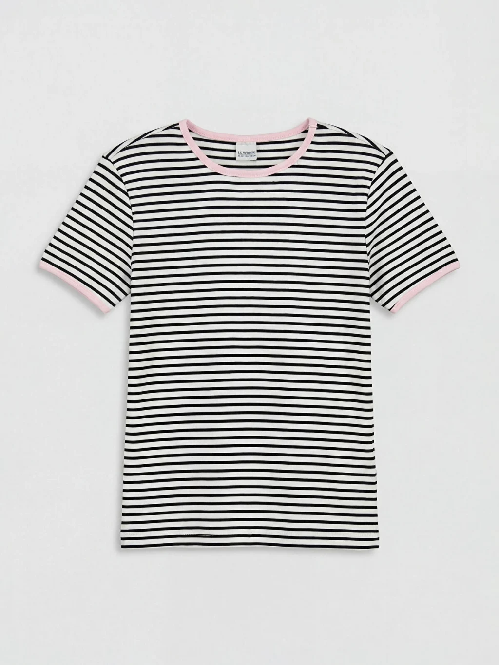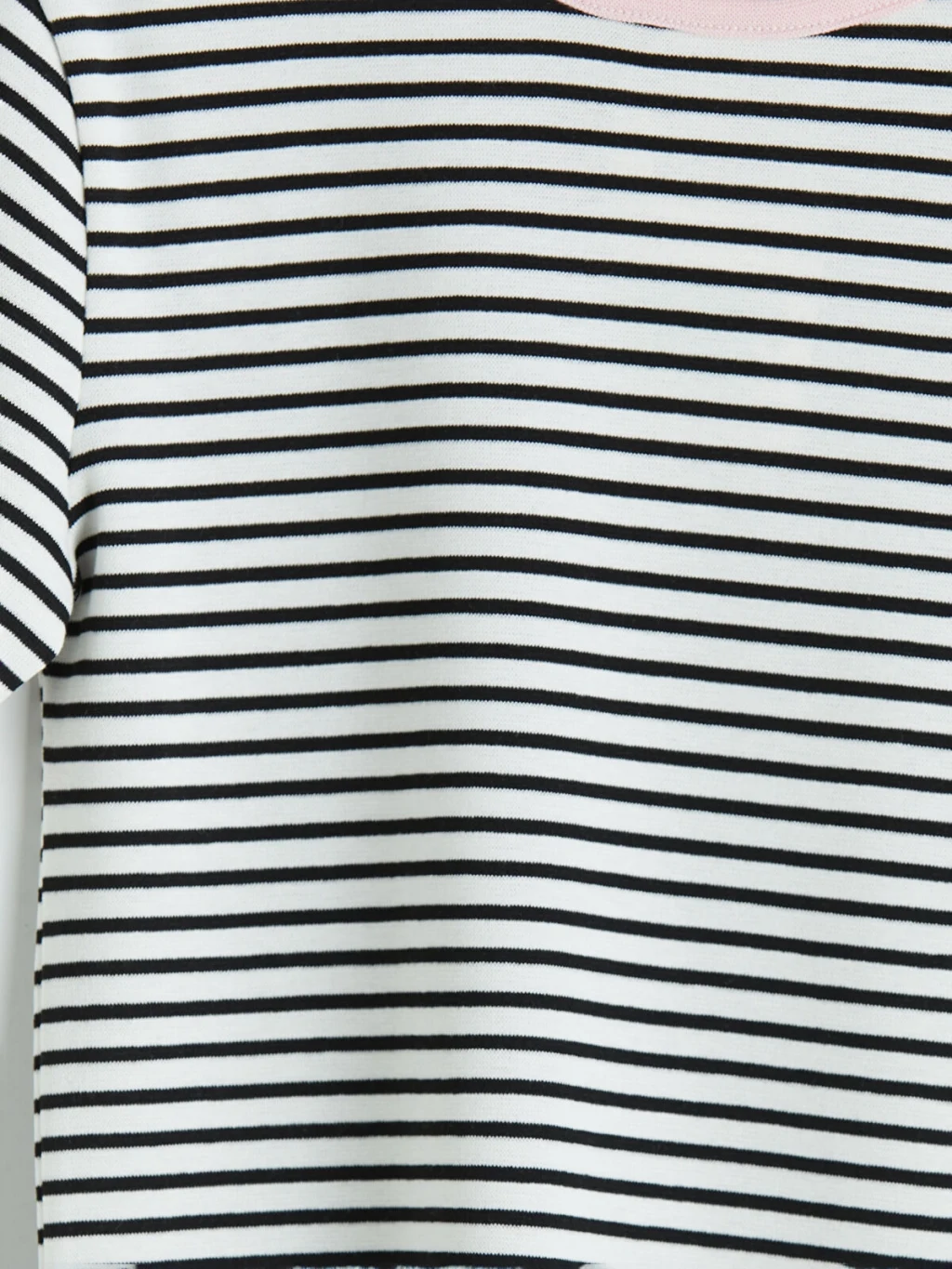 Bisiklet yaka ve kısa kollu kız çocuk tişört, ribana kumaştan üretilmiştir ve çizgili desene sahiptir.