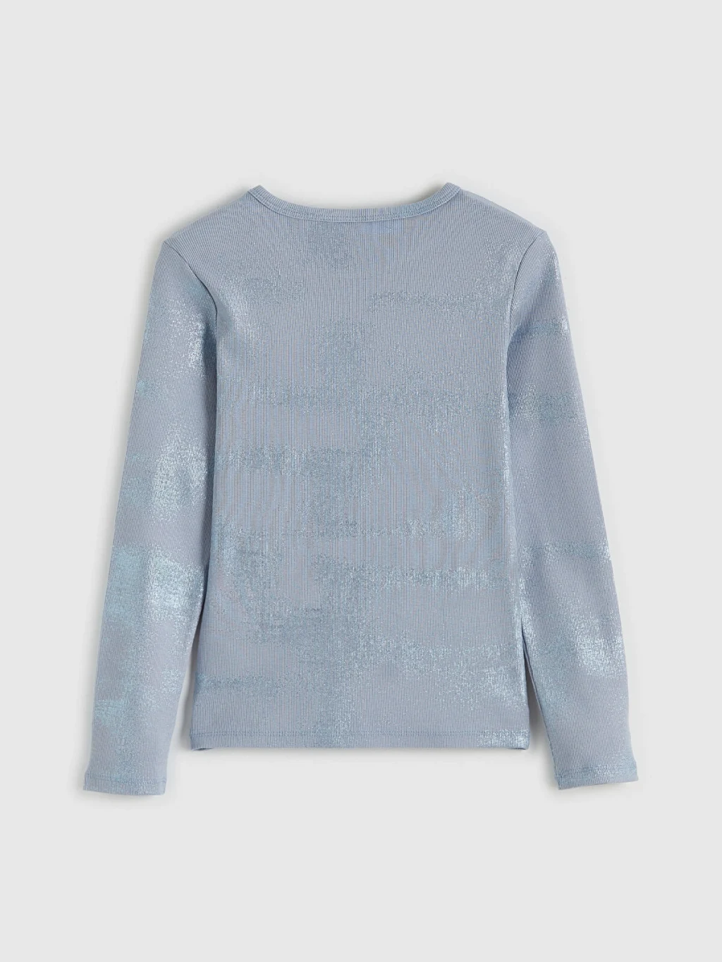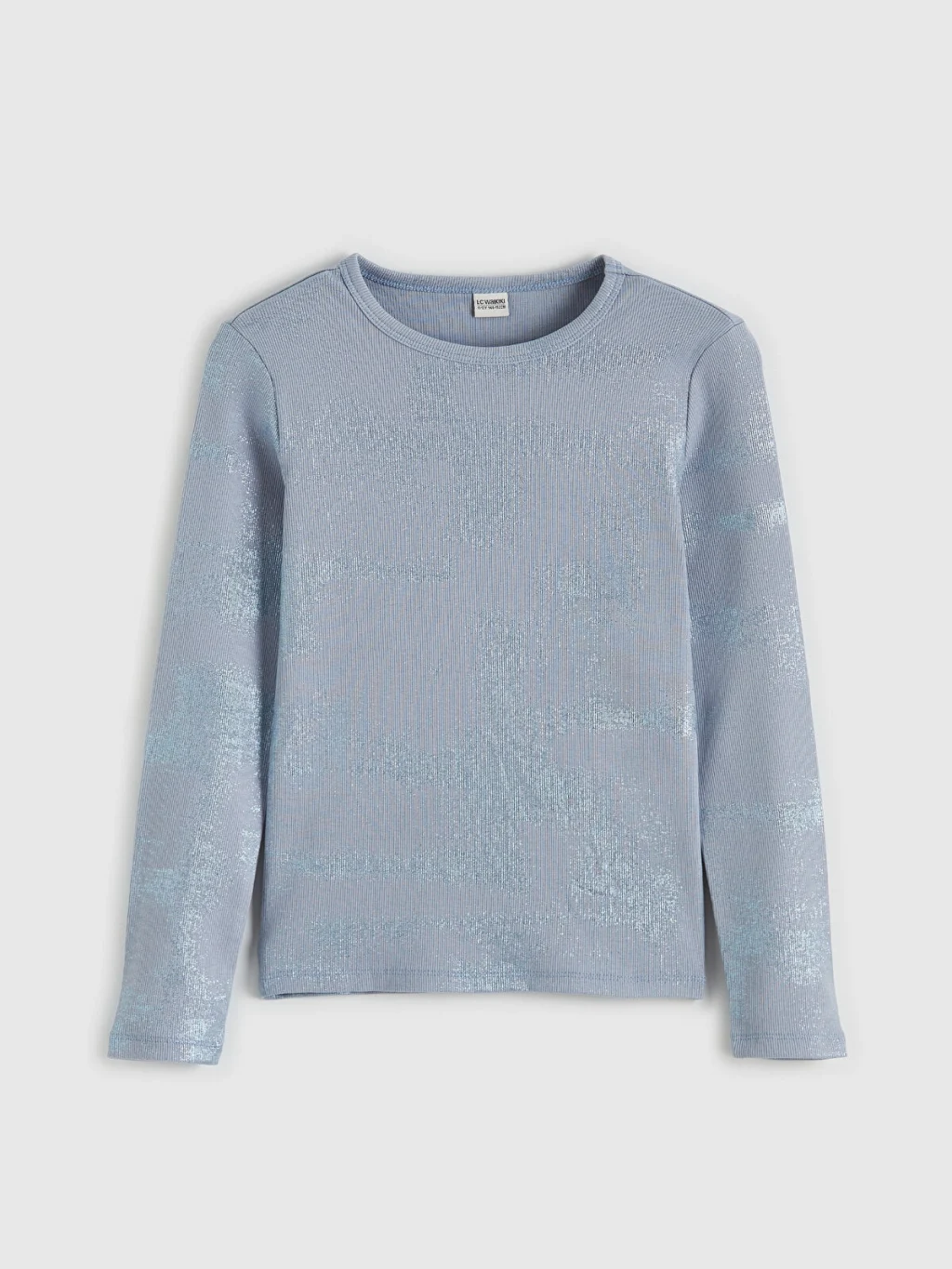Parıltılı yatay çizgili desene sahip, bisiklet yaka ve uzun kollu kız çocuk tişört, fitilli kumaştan üretilmiştir.