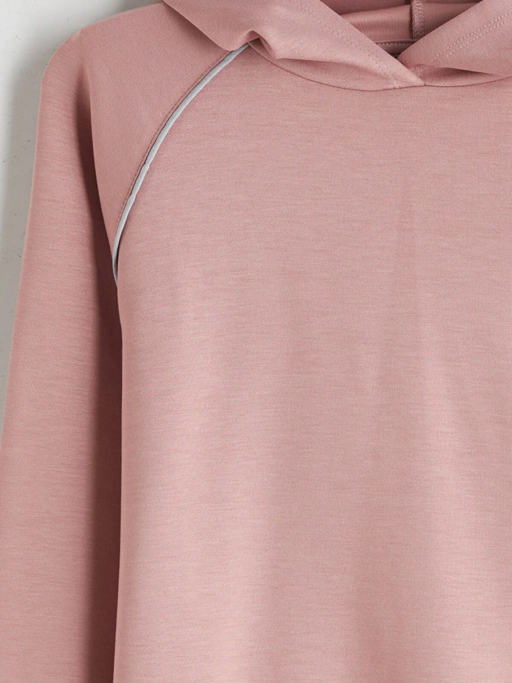 Kapüşon yakalı ve uzun reglan kollu kız çocuk sweatshirt, kalın interlok kumaştan üretilmiştir. Kol dikişleri biye detaylı, etek ucu ve manşetleri ribanalıdır.