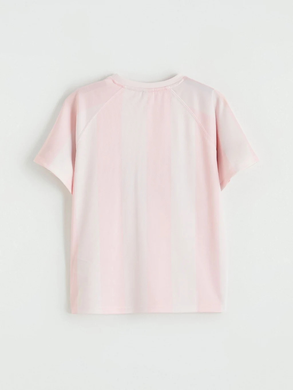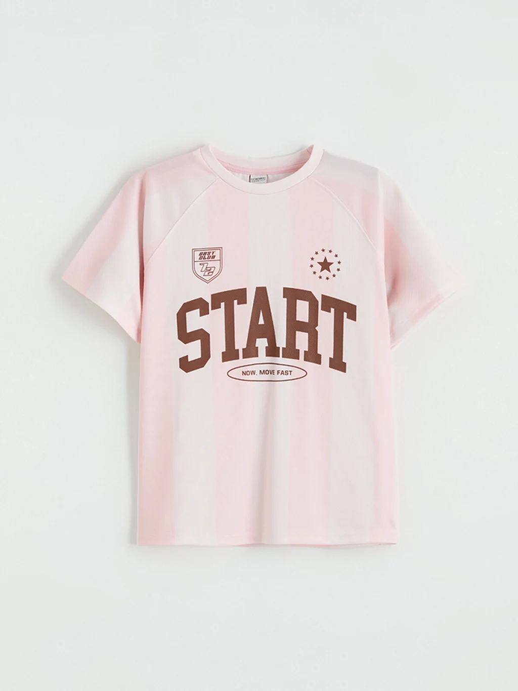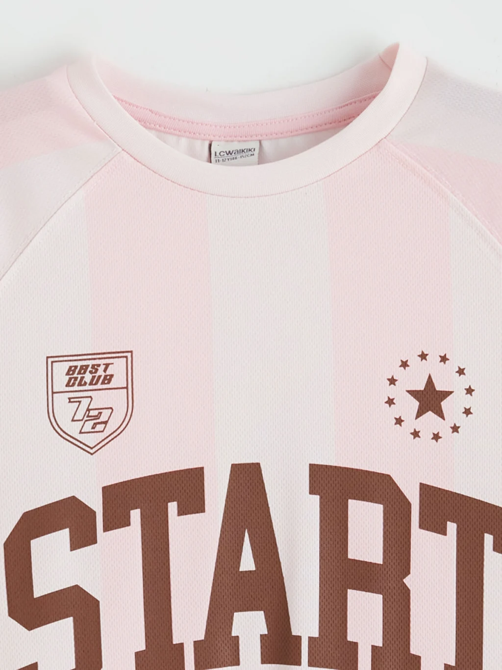 Kız çocuk tişört, bisiklet yaka ve kısa kolludur. Bol kalıplıdır. Çizgili desene ve baskı detaylarına sahiptir.