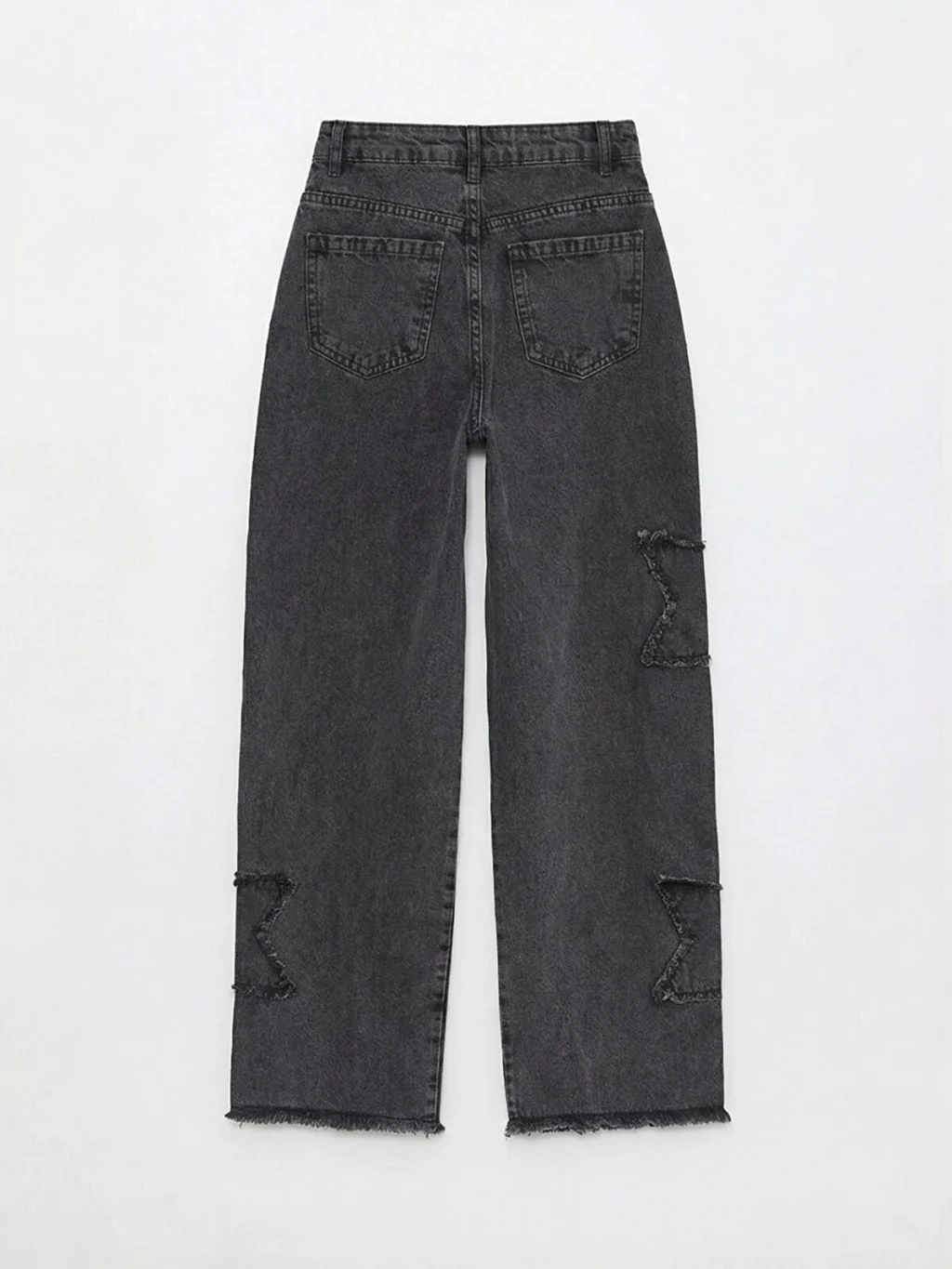 Wideleg kız çocuk jean pantolon, pamuklu denim kumaştan üretilmiştir. Beş cepli tasarıma sahip olup fermuar ve düğme kapamalıdır ve yıldız desenli yamaları vardır.
