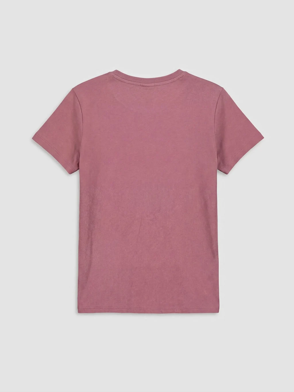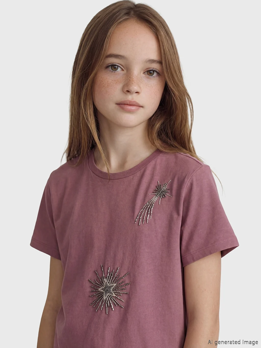 Bisiklet yaka ve kısa kollu kız çocuk tişört, %100 pamuk içerikli penye kumaştan üretilmiştir. Standart kalıba sahiptir.