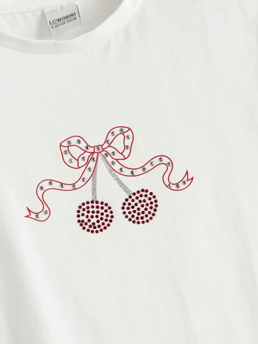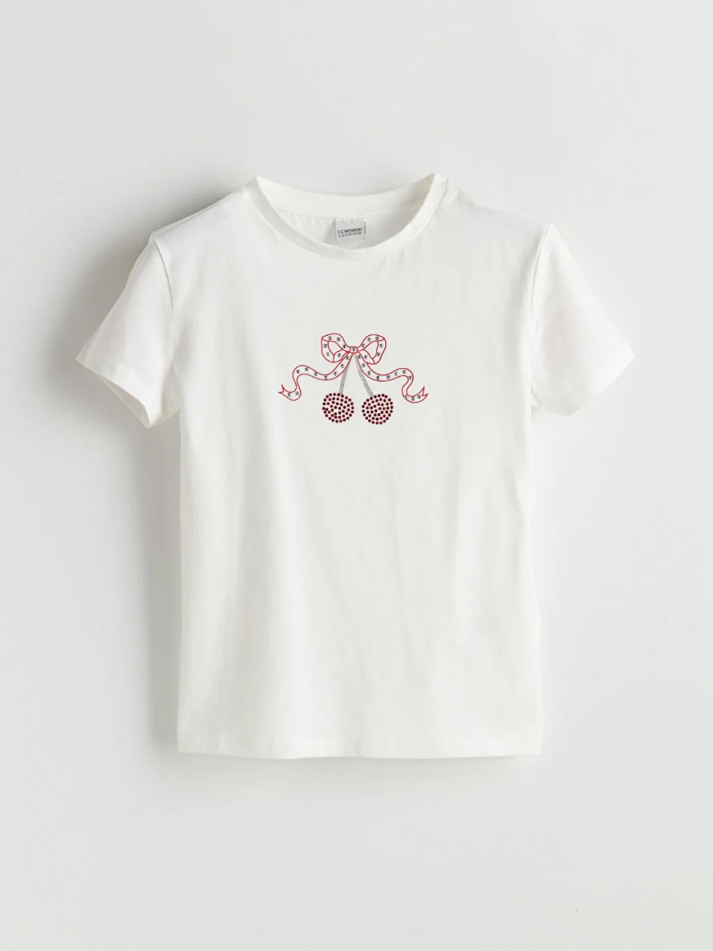 Bisiklet yaka, kısa kollu kız çocuk tişört, %100 pamuklu penye kumaştan üretilmiştir. Ön yüzünde taş baskılı kiraz deseni bulunur.