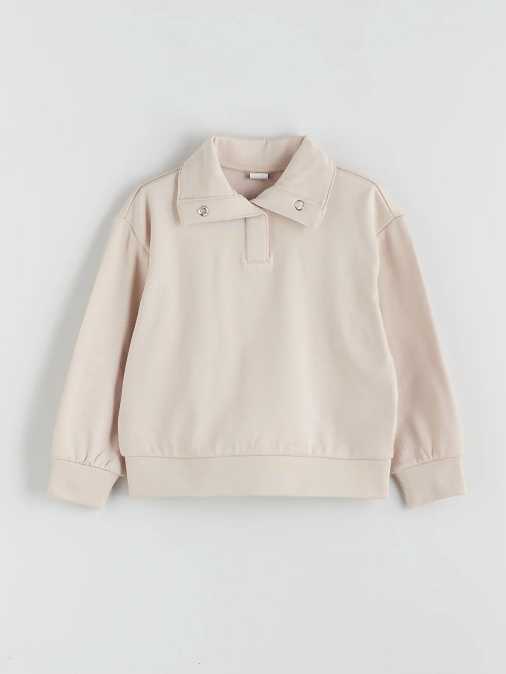 Kız çocuk sweatshirt, çıtçıt kapamalı polo yakalı, düşük omuzlu ve uzun kolludur. Kol ve etek uçları ribana detaylıdır.