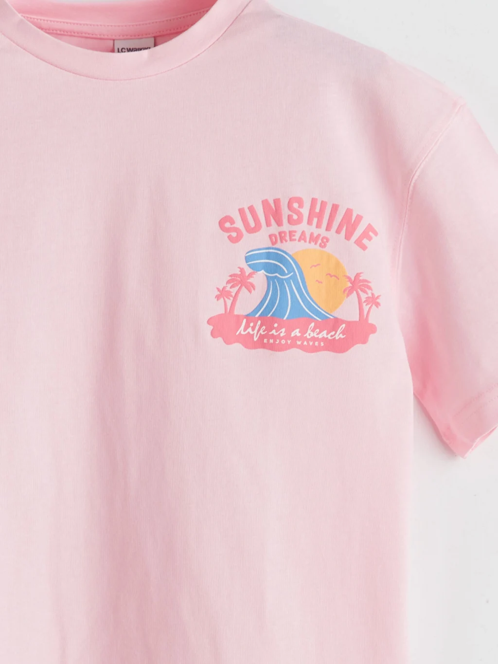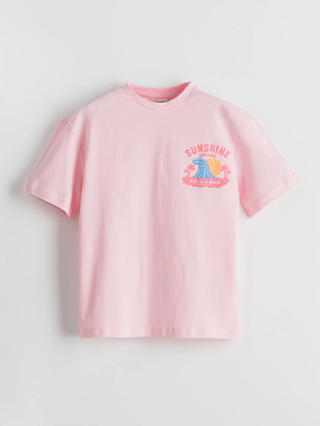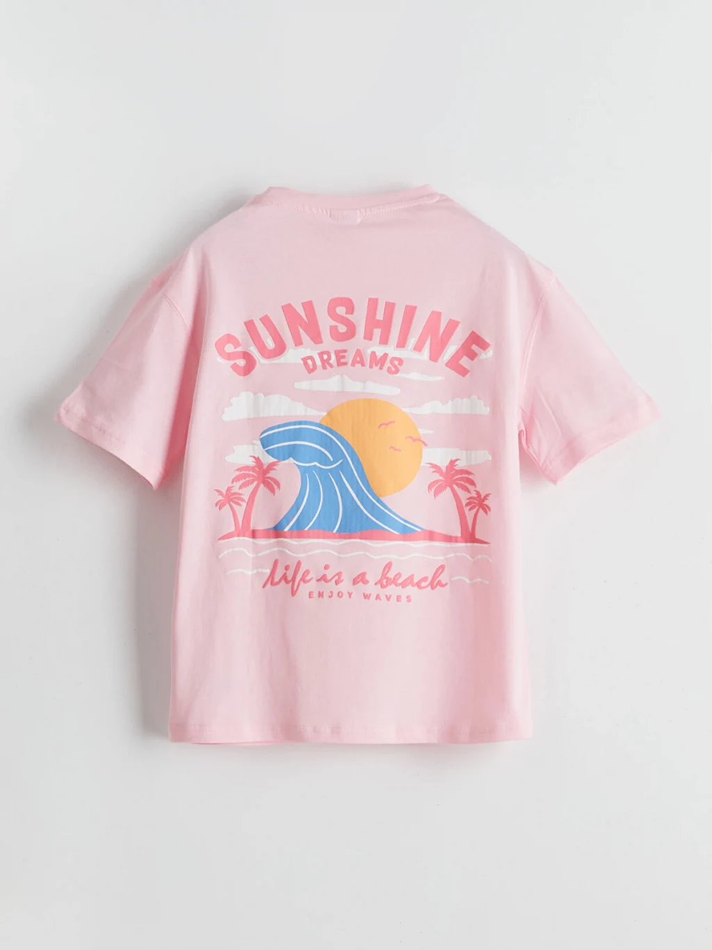 Bol kalıplı, bisiklet yaka kız çocuk tişört, kısa kolludur. %100 pamuklu penye kumaştan üretilmiştir ve sırtı baskılıdır.