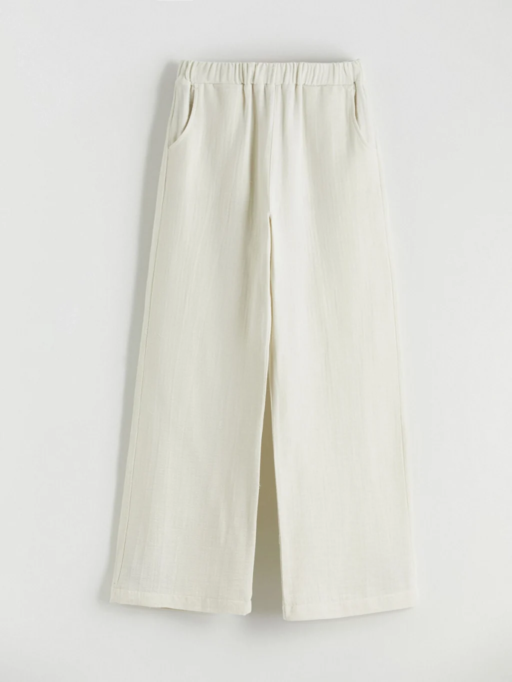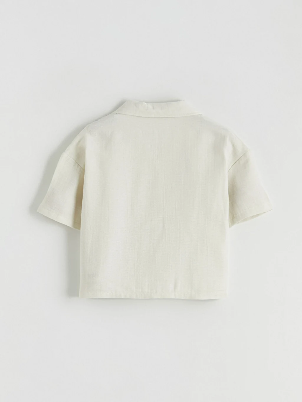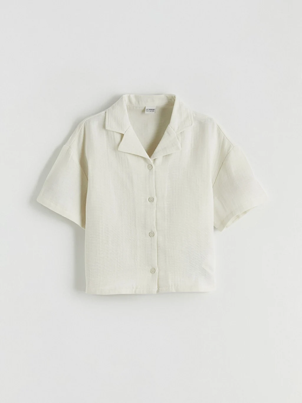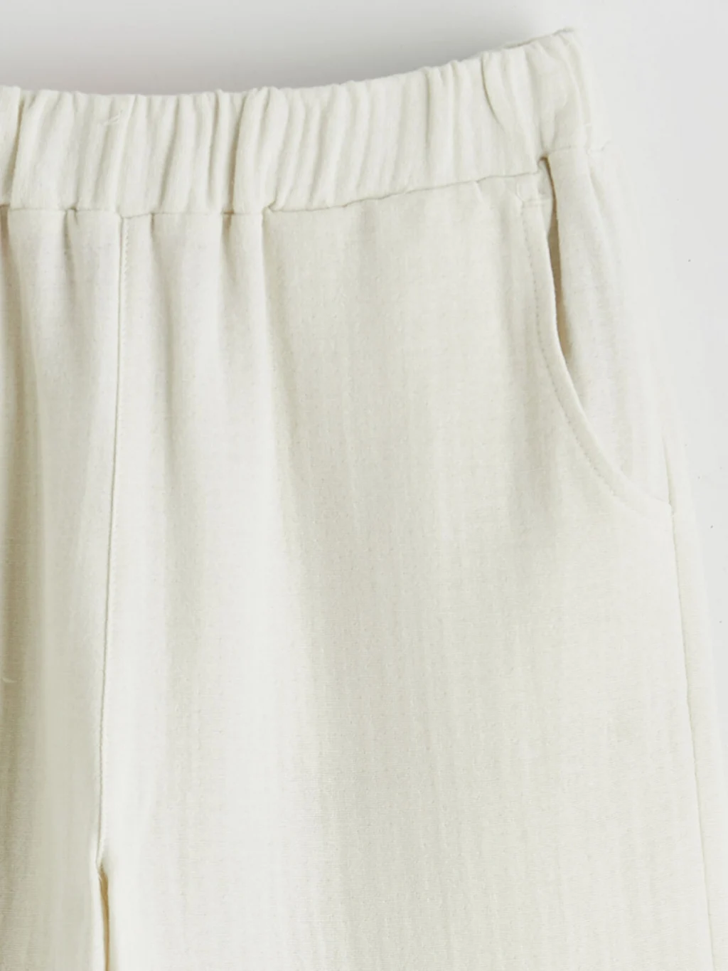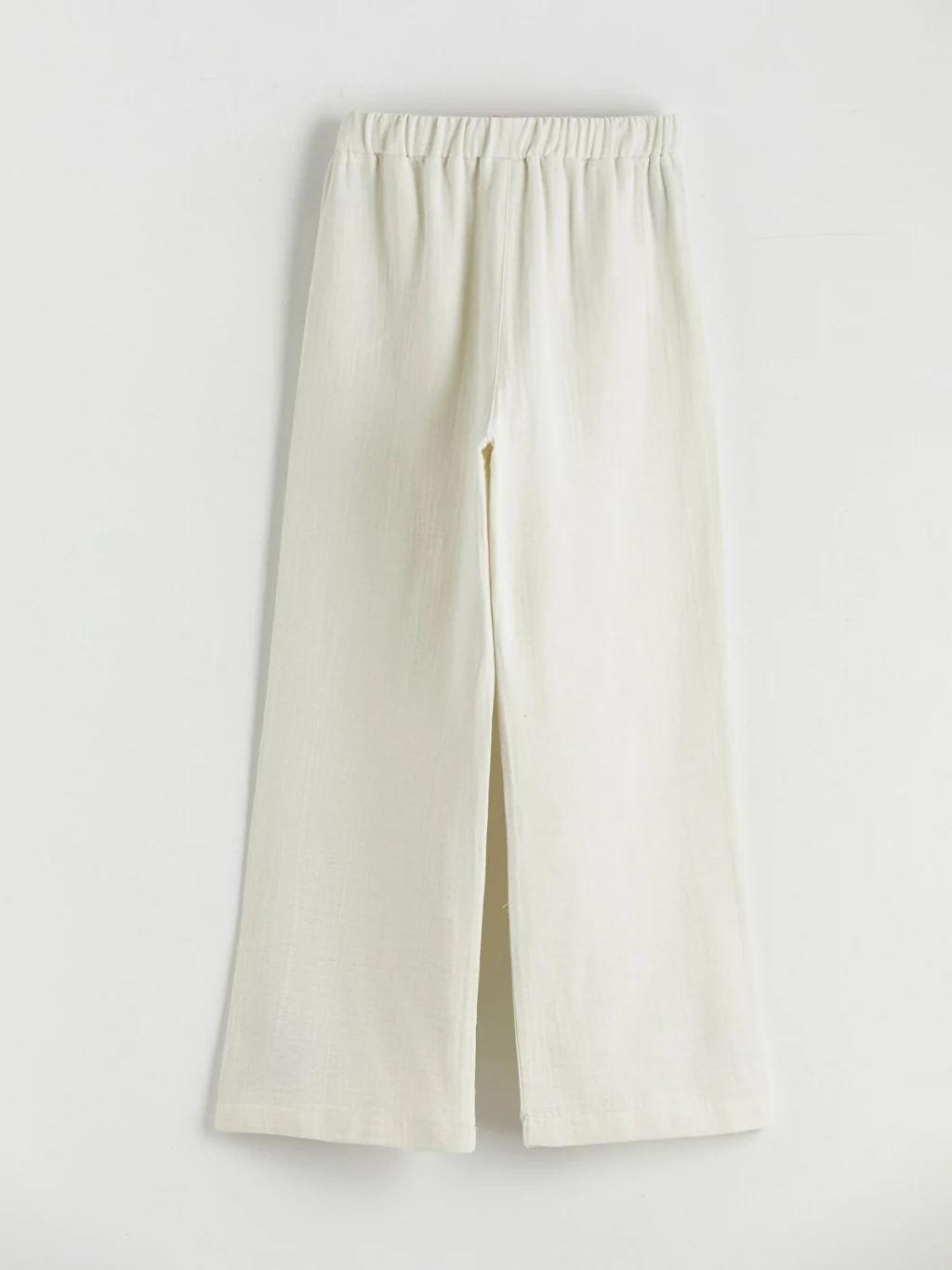 Kız çocuk takım, gömlek yakalı, kısa kollu ve önden düğme kapamalı üst ile geniş paçalı pantolondan oluşur. %100 pamuk müslin kumaştan üretilmiştir.