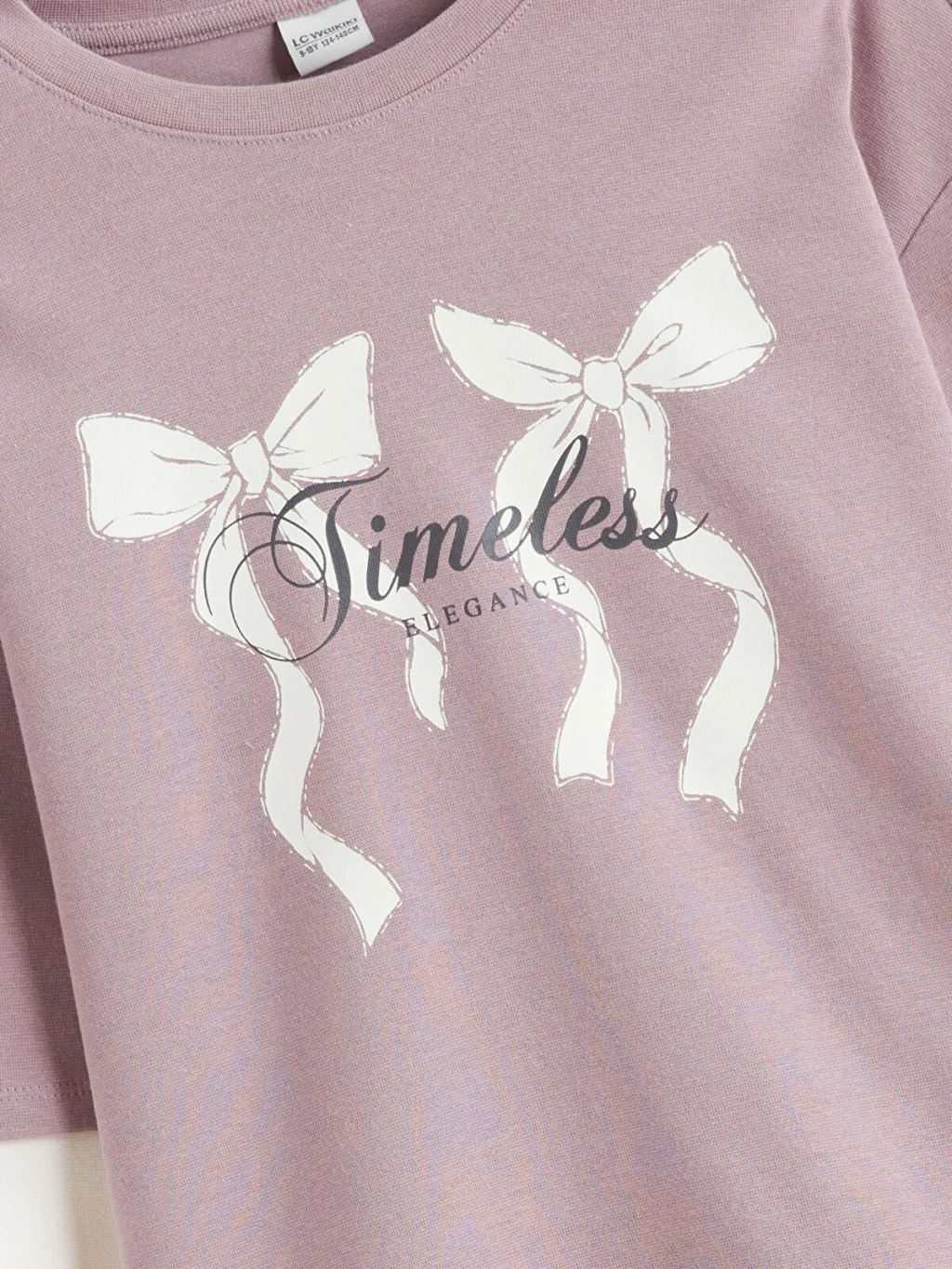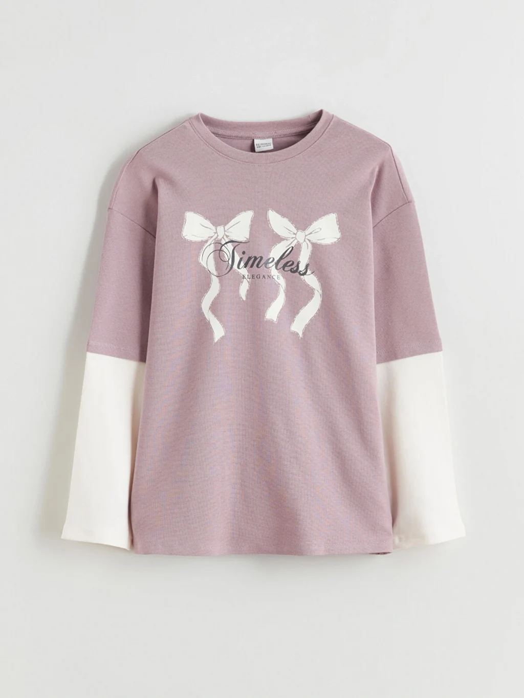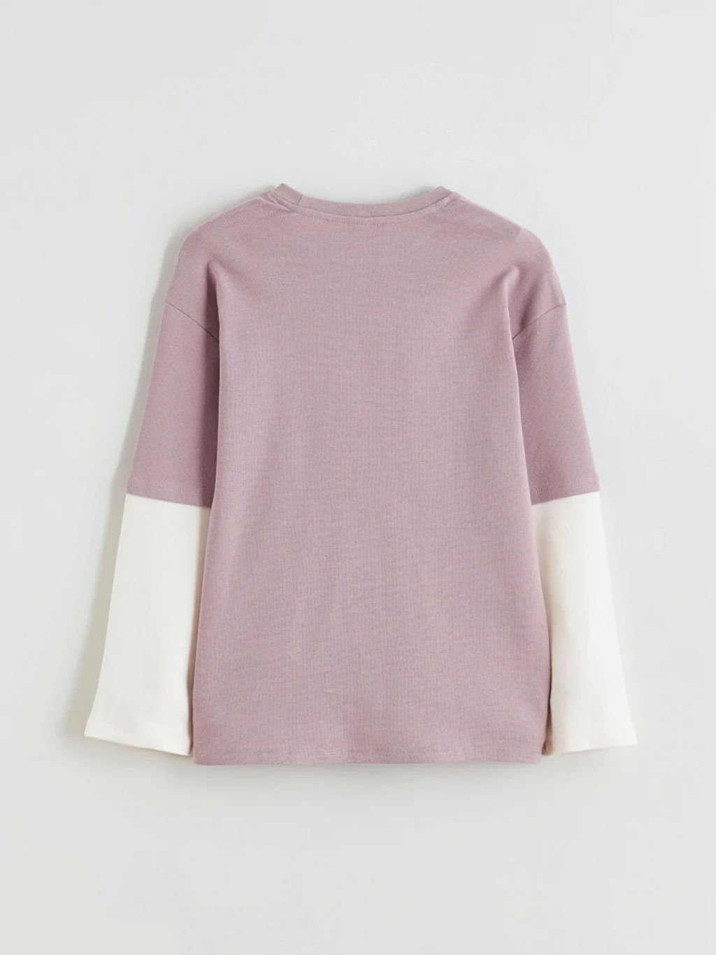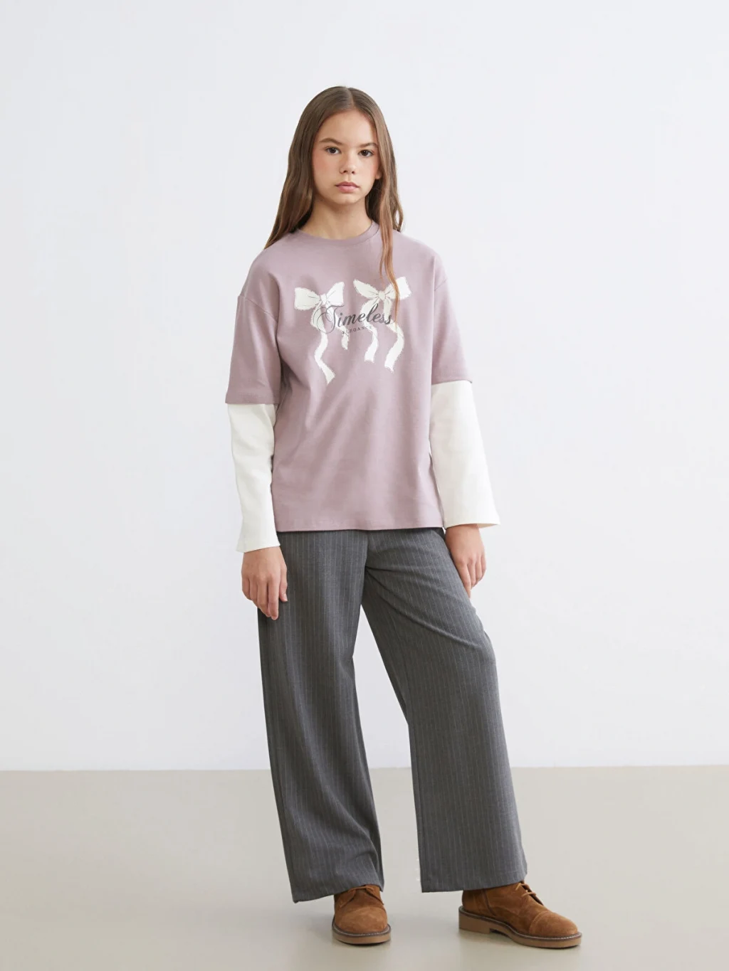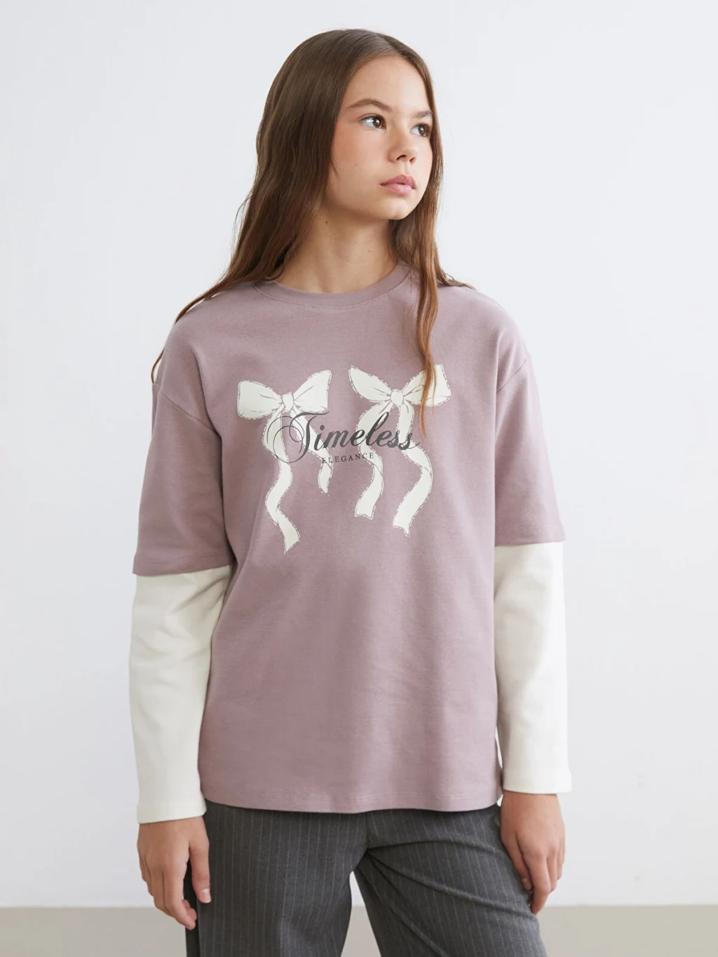 Yüksek pamuk içerikli ribana kumaştan üretilen kız çocuk tişört, bisiklet yaka ve uzun kolludur. Bol kalıplı ürün, renk bloklu kollara ve önü baskılı tasarıma sahiptir.